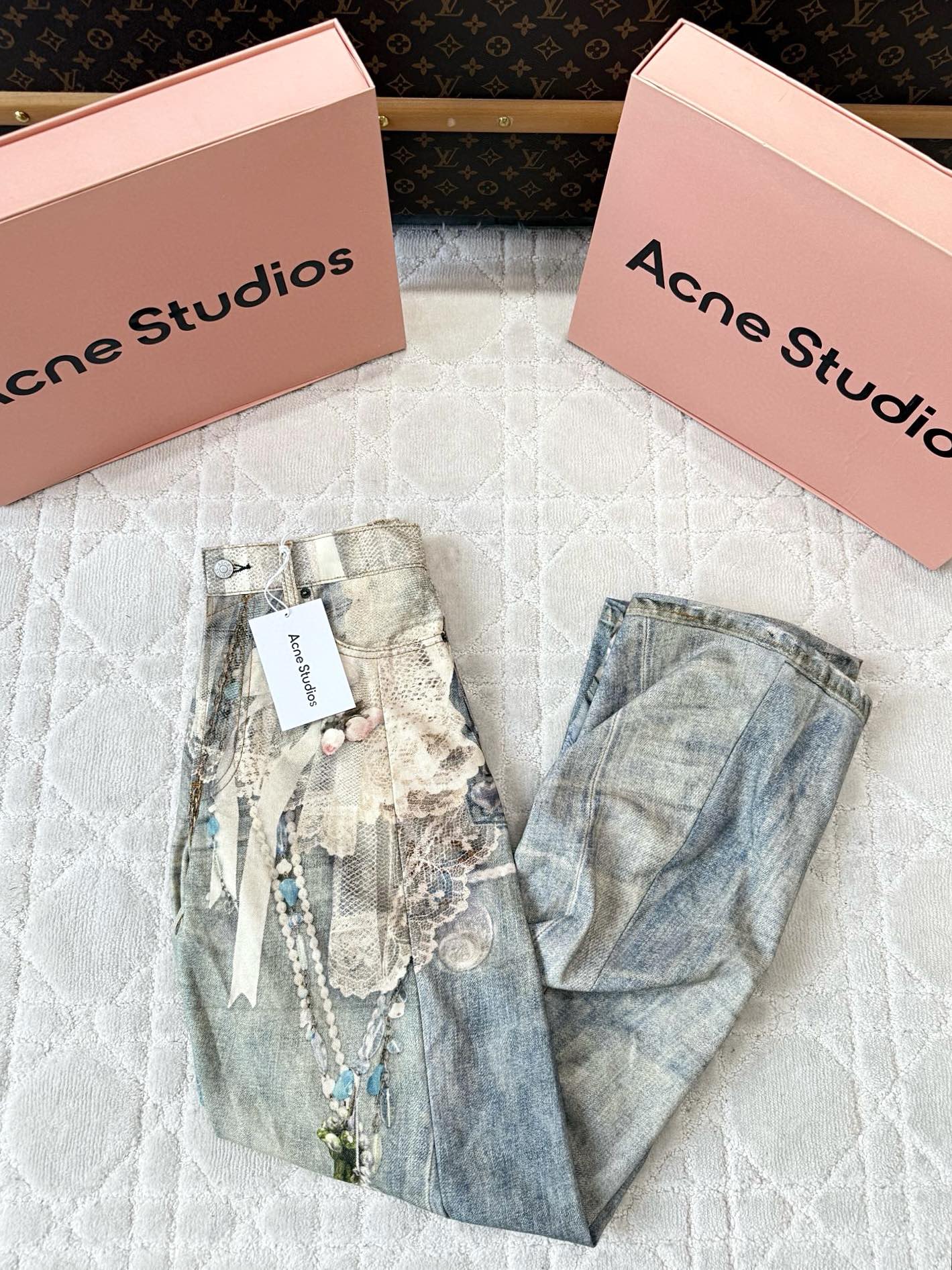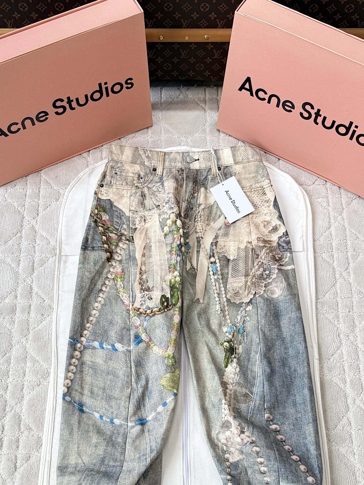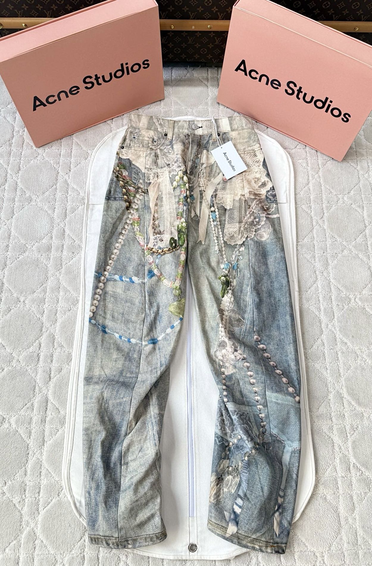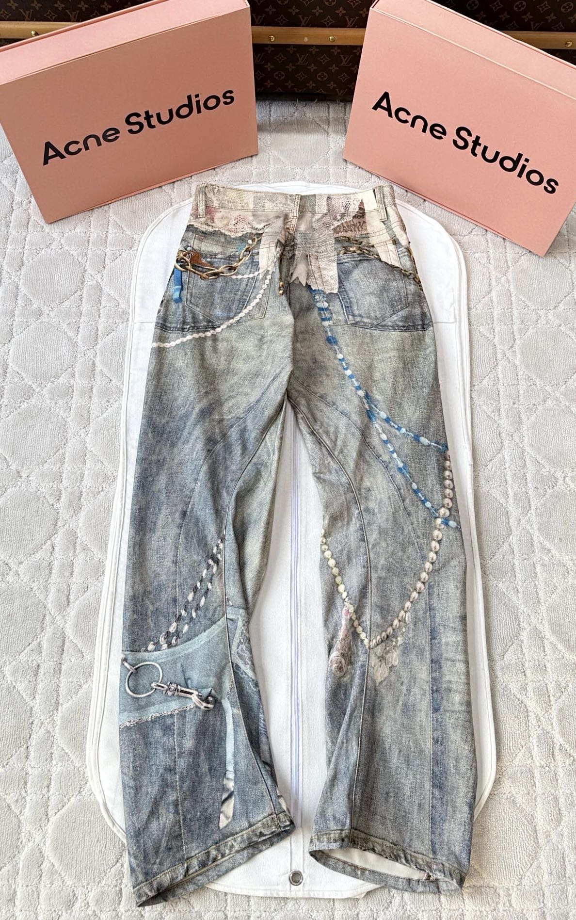 NIGO Acne Studios Men's & Women's Lace Pearl Chain 3D Print Four-Season Relaxed Mid-Rise Straight-Leg Curved Hem Denim Pants #nigo81549