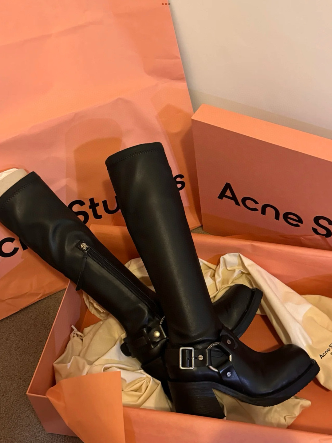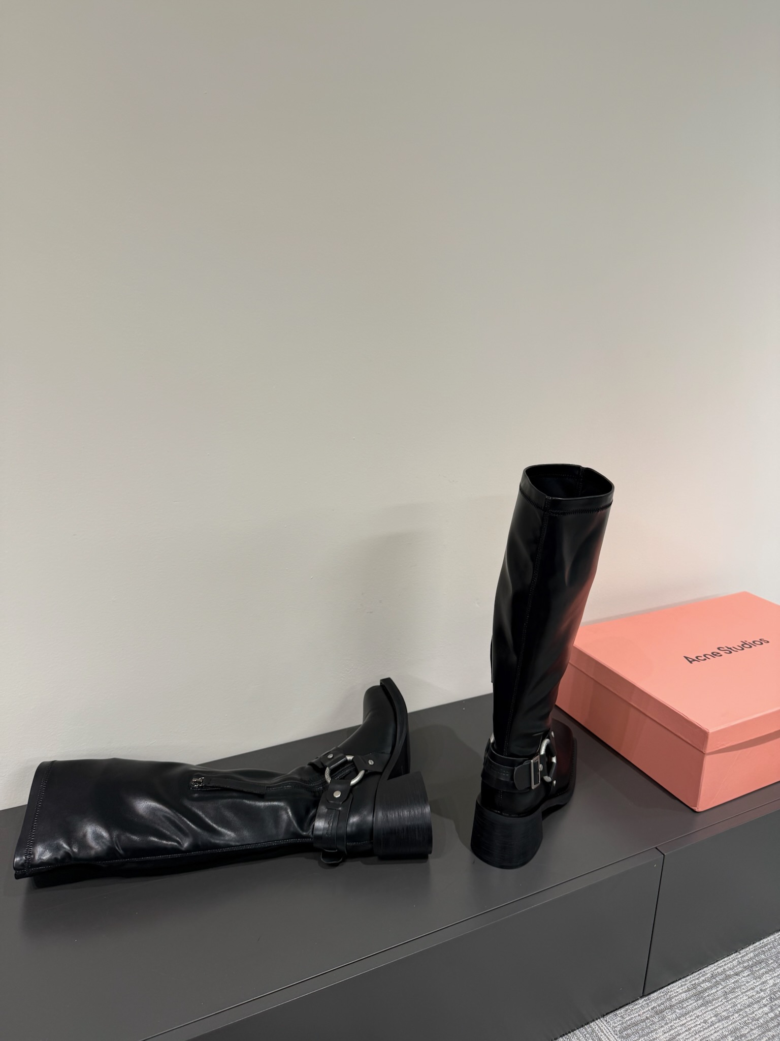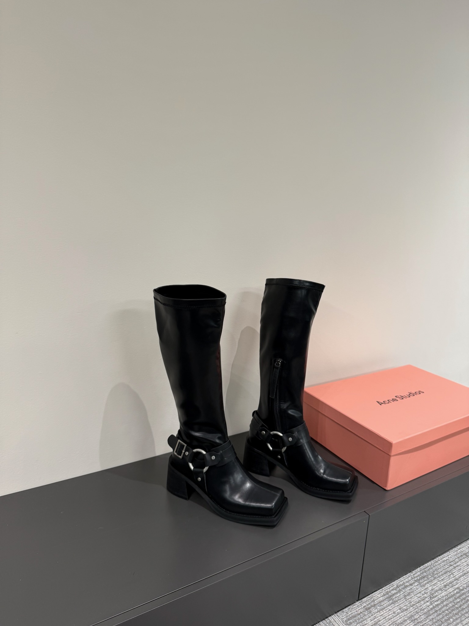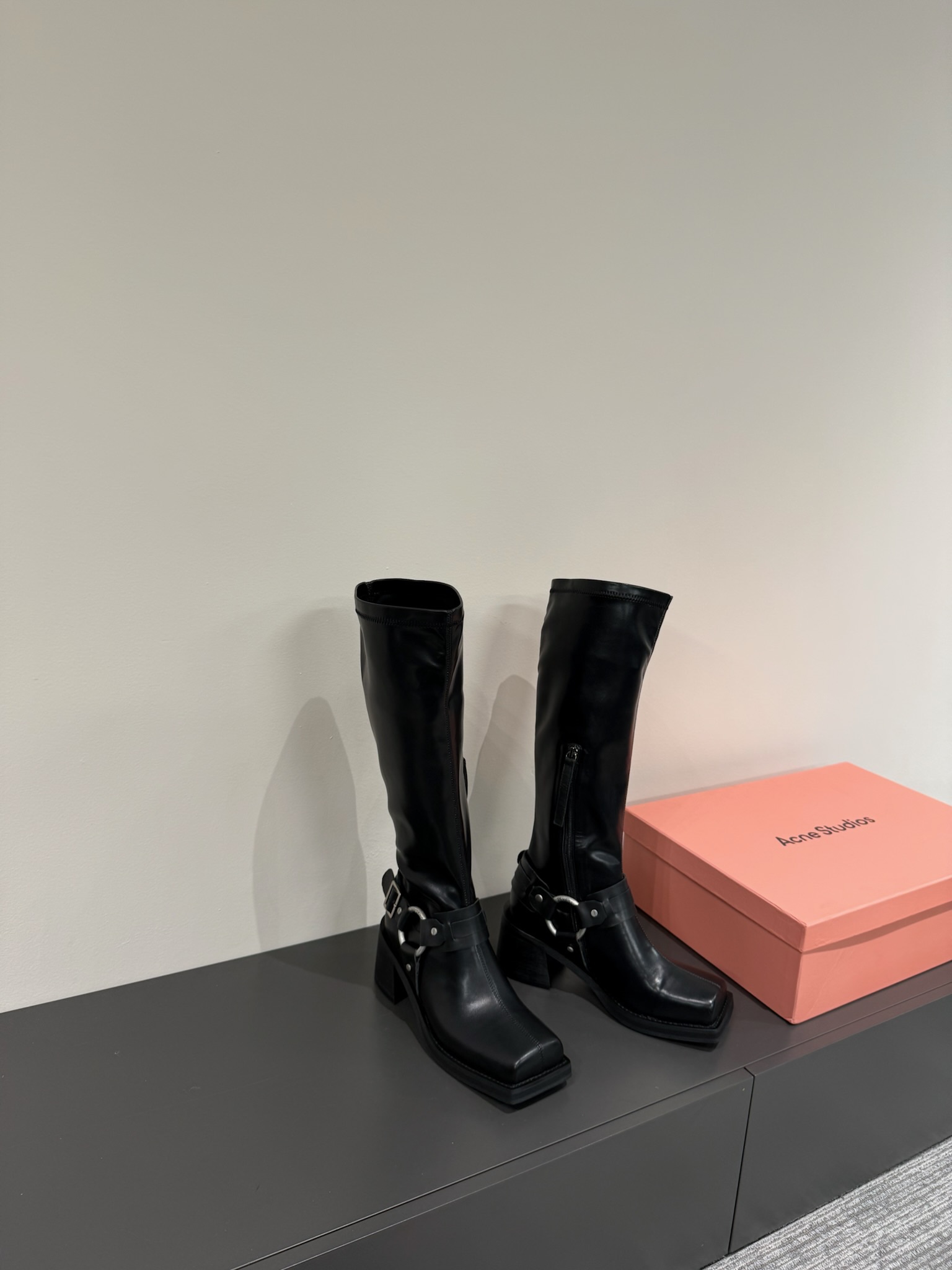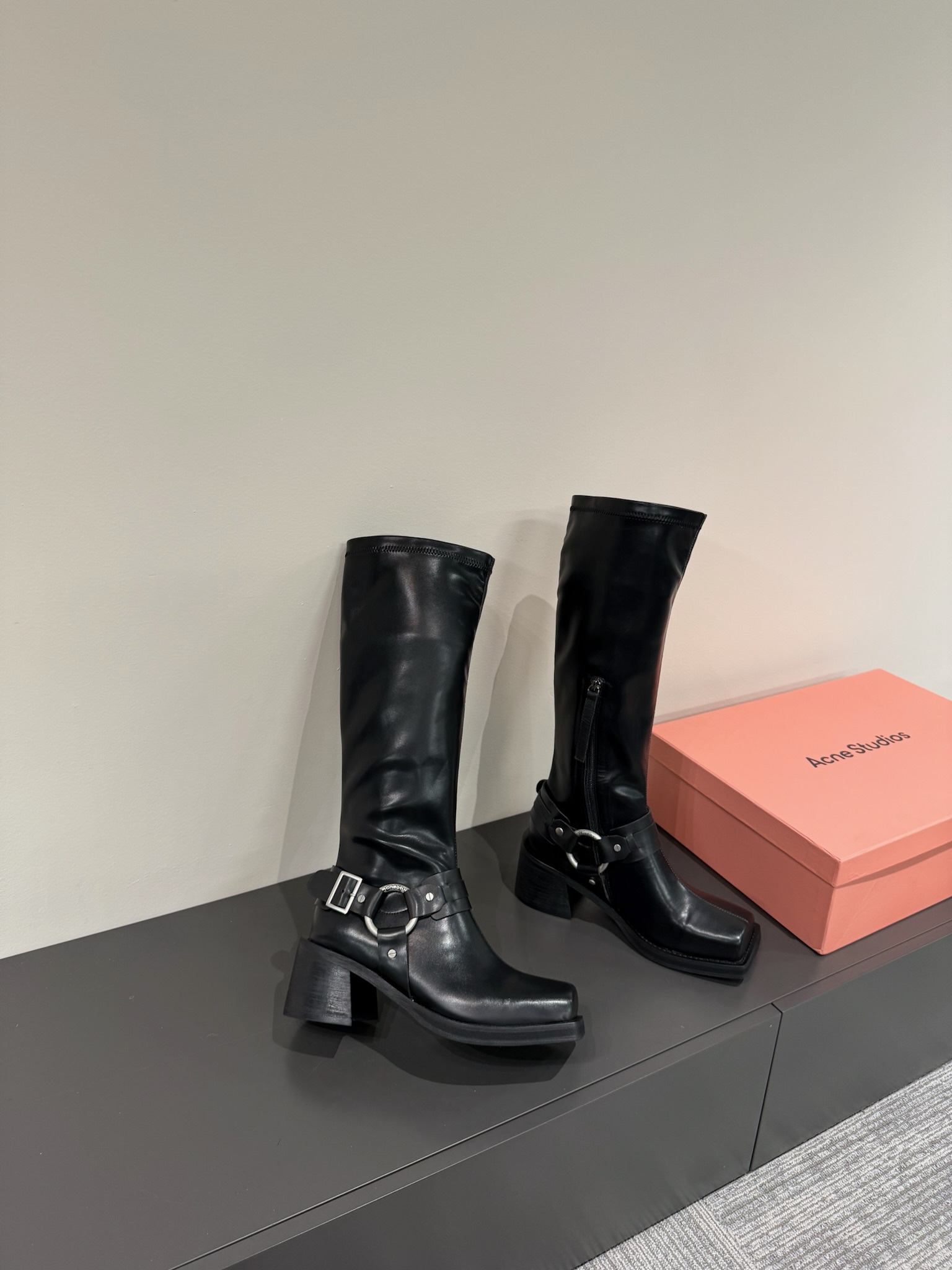NIGO Acne Studios Women's Square Head Round Buckle Biker Boots Shoes Cowhide High Heel Elastic New Thick Heel Thick Bottom Knight Boots Long Tube Skinny Boots Ngvp #nigo9856