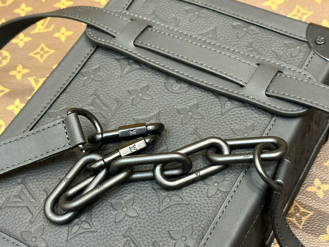 Taurillon leather with Monogram embossing, a matte zipper, and a sophisticated shoulder strap for a new take on the traditional messenger bag. Reinforced corners and a four-sided shape speak to the heritage of the case.