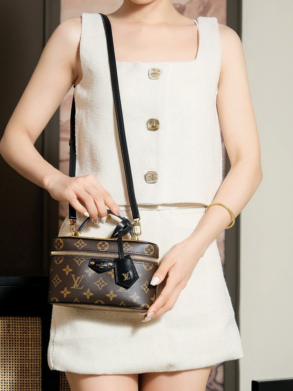 NIGO Louis Vuitton Vanity Chain Pouch Women's Brown Monogrammed Pendant Zipper Closure Calfskin Gloves Cosmetic Bag Bags #nigo75134
