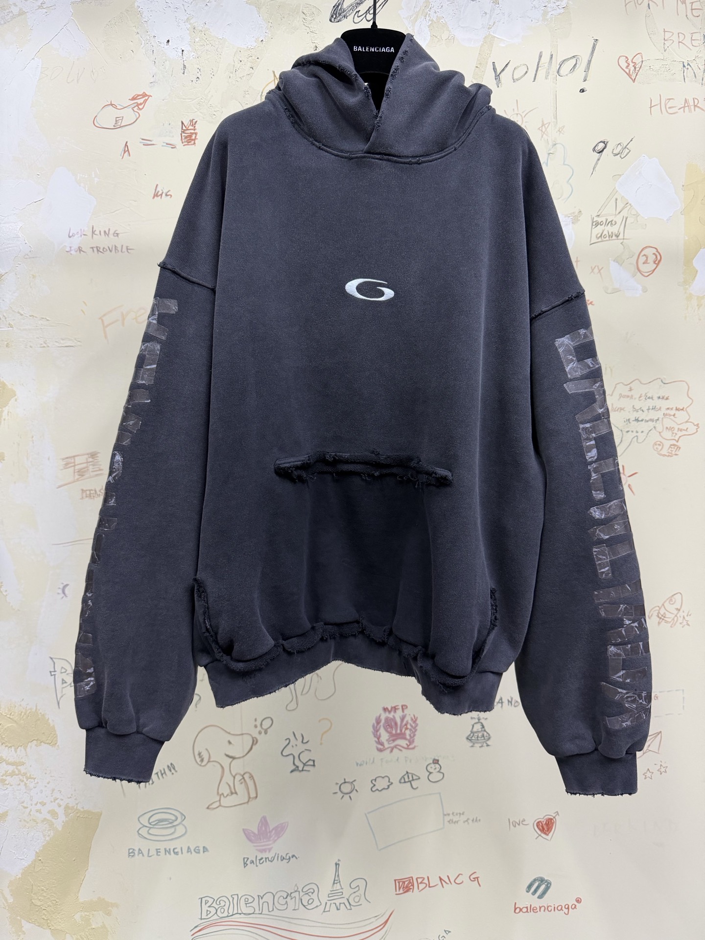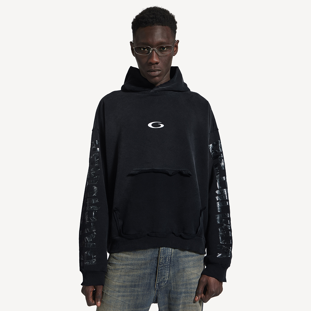 NIGO Balenciaga Men's Transparent Tape Ripped Pocket Hoodie in Faded Black #nigo336331