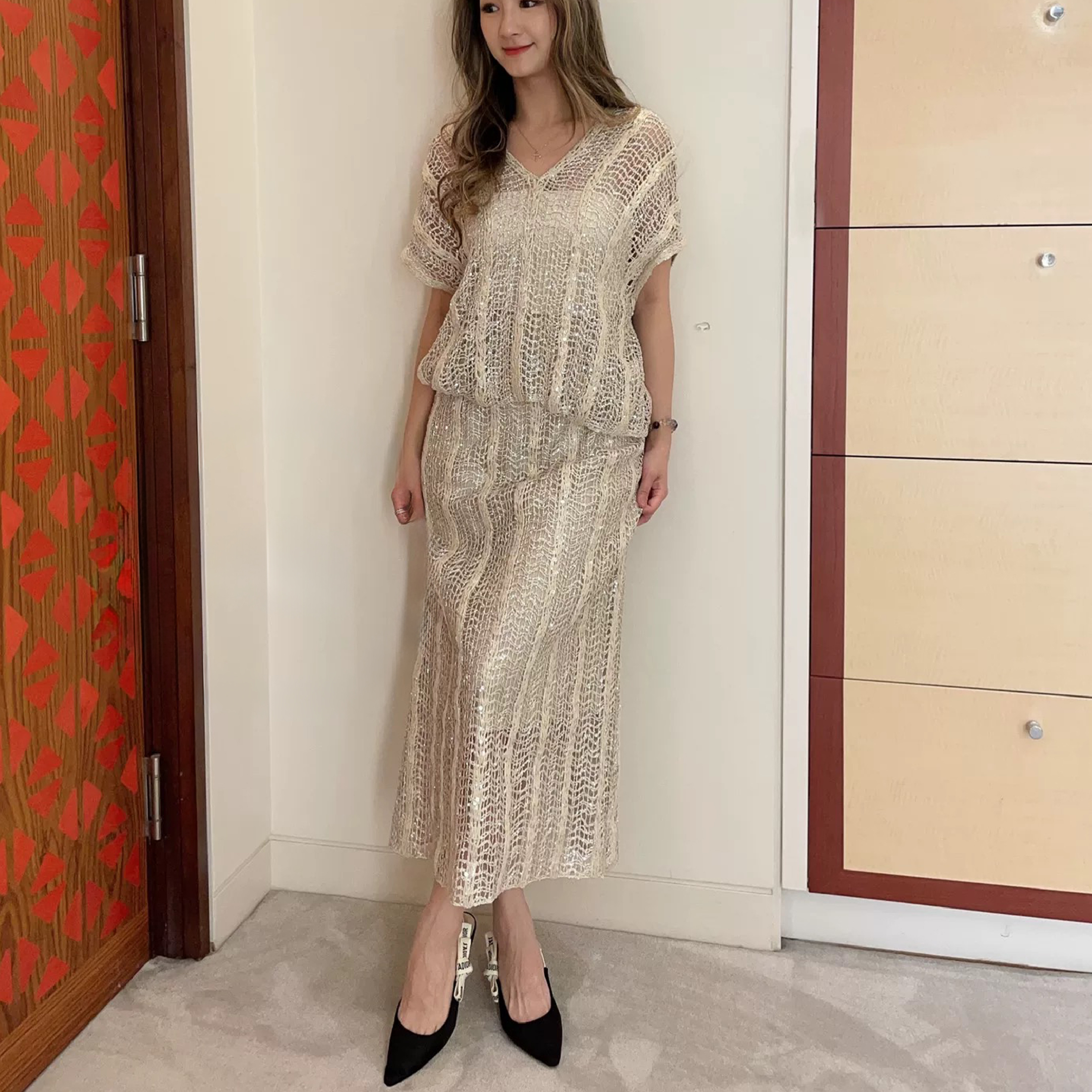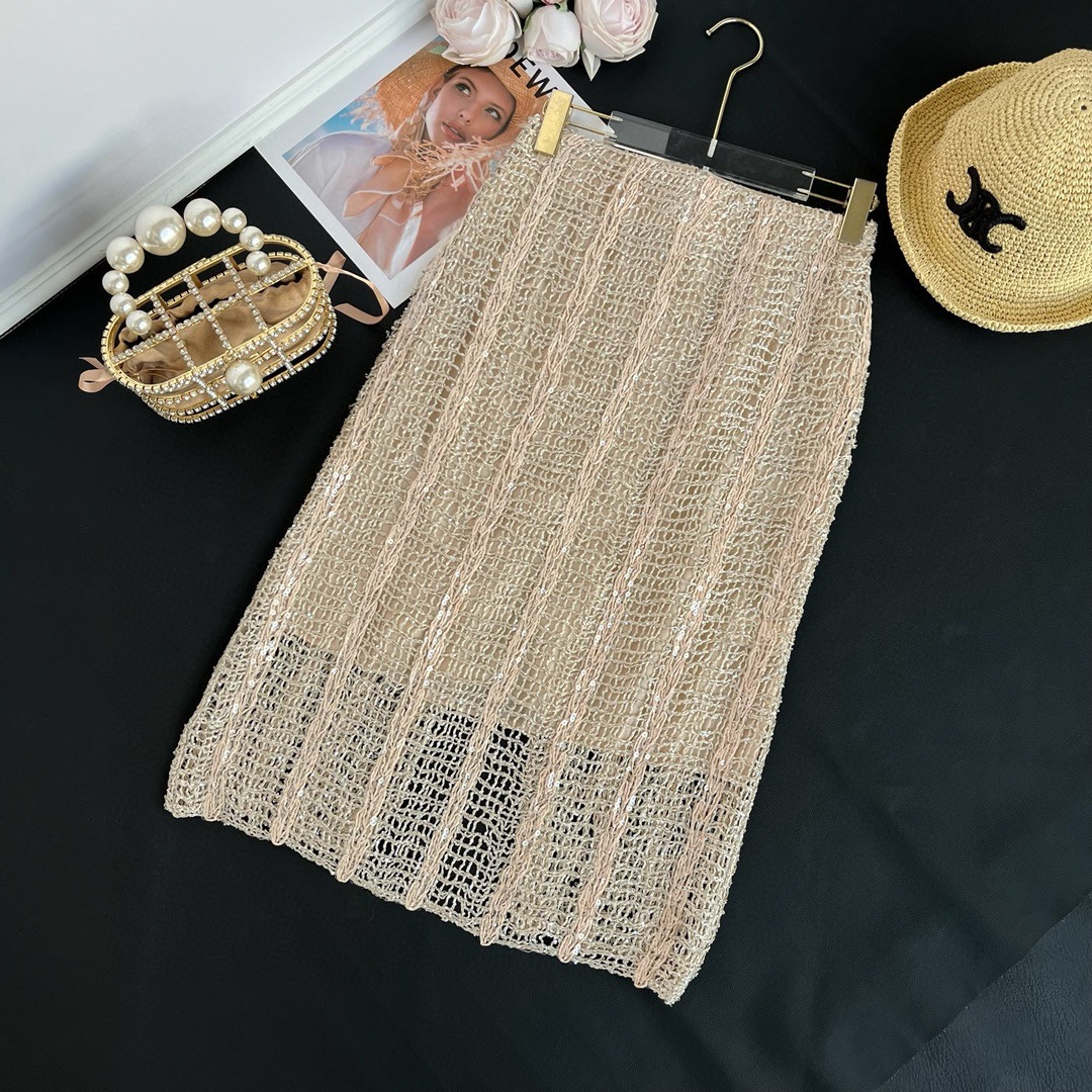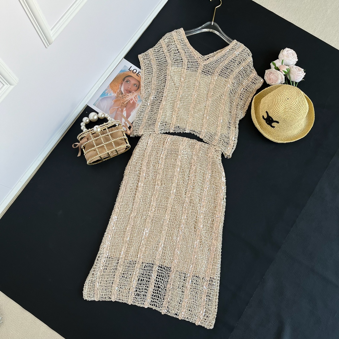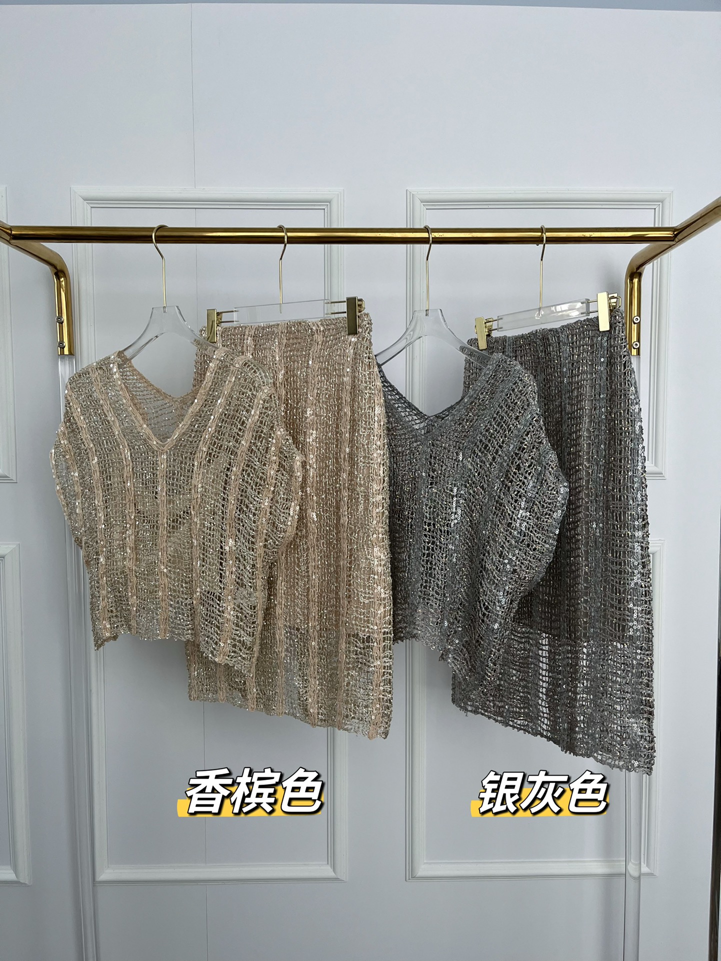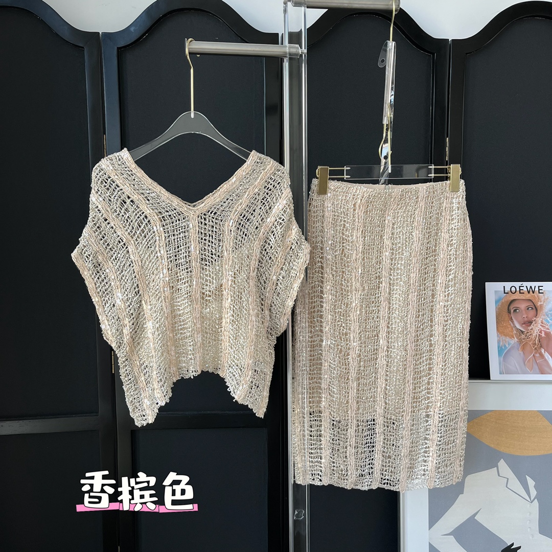 NIGO Brunello Cucinelli Women's Spring And Summer Shining Stripes Decoration Mesh Hole Embroidery T-shirt Half-body Skirt Set Fashion Casual Temperament Suit Set Ngvp #nigo9129