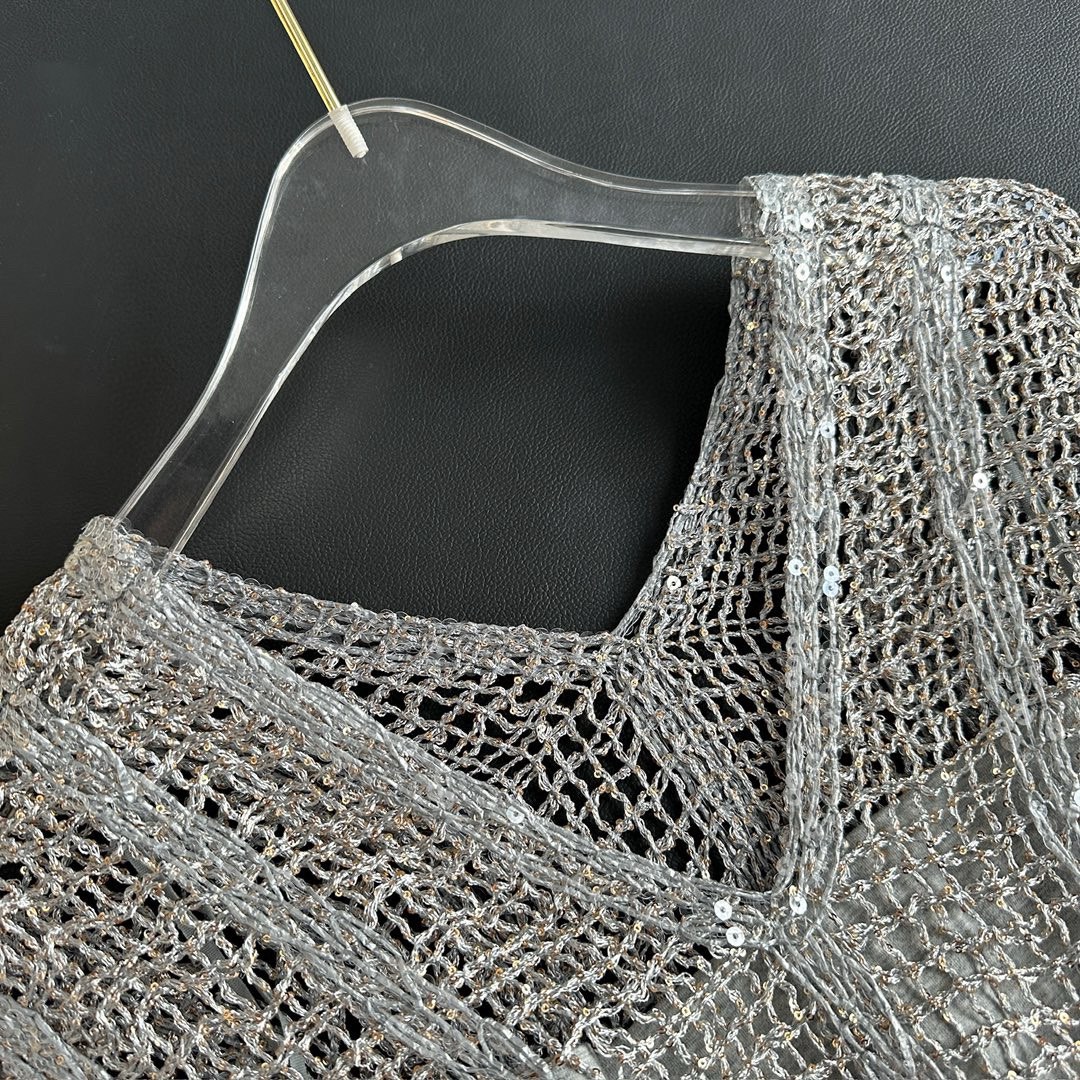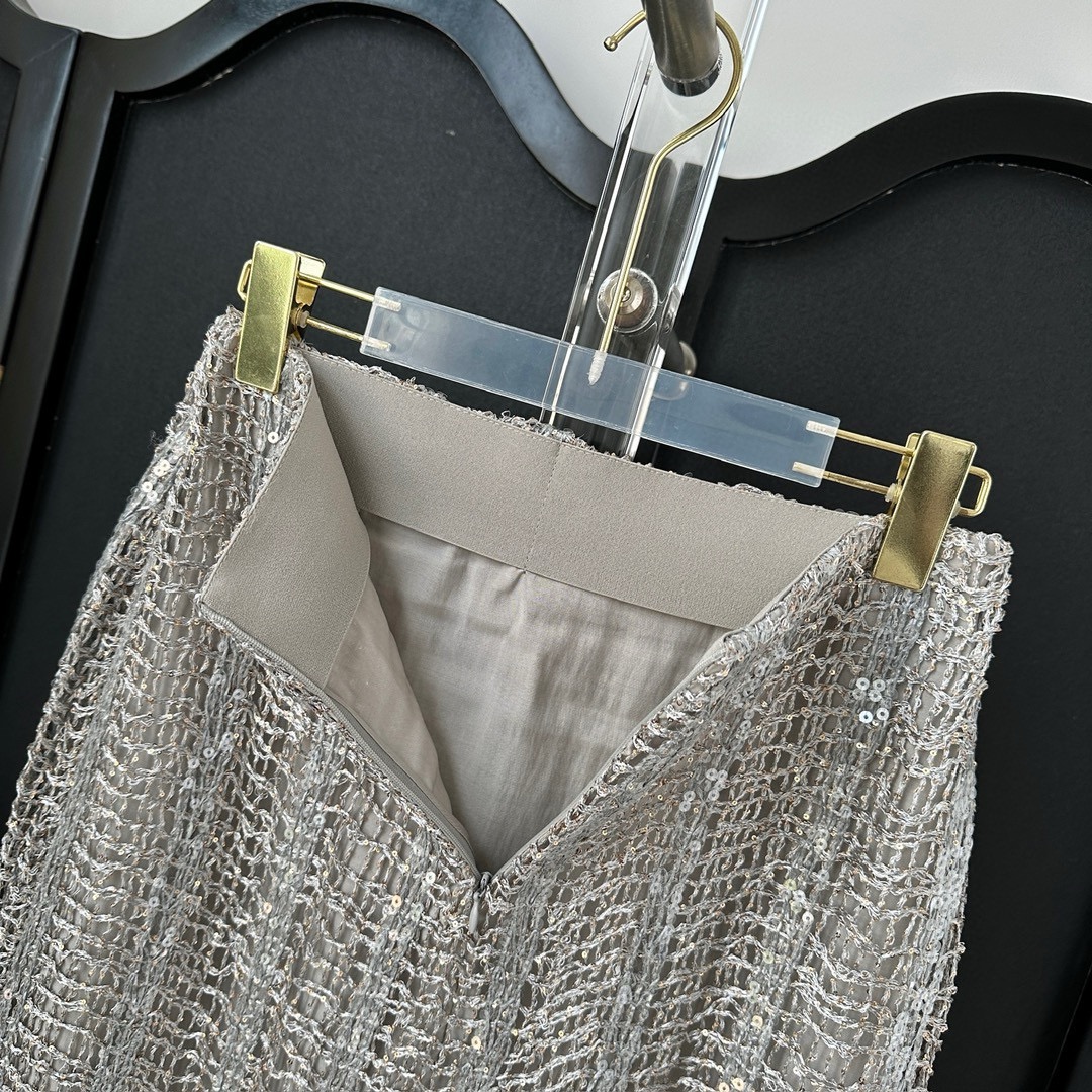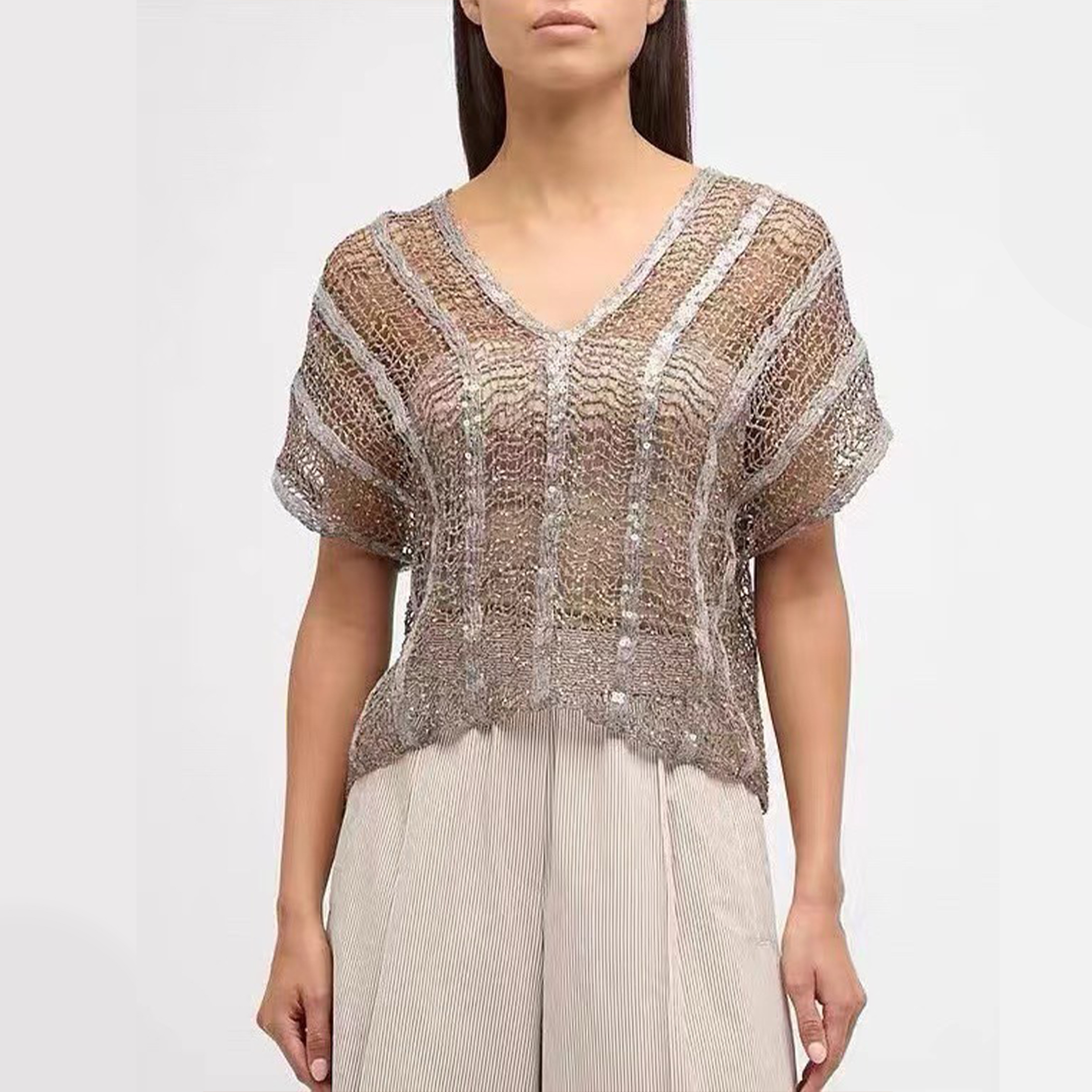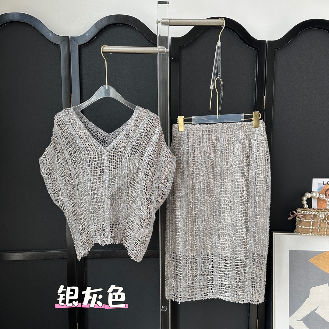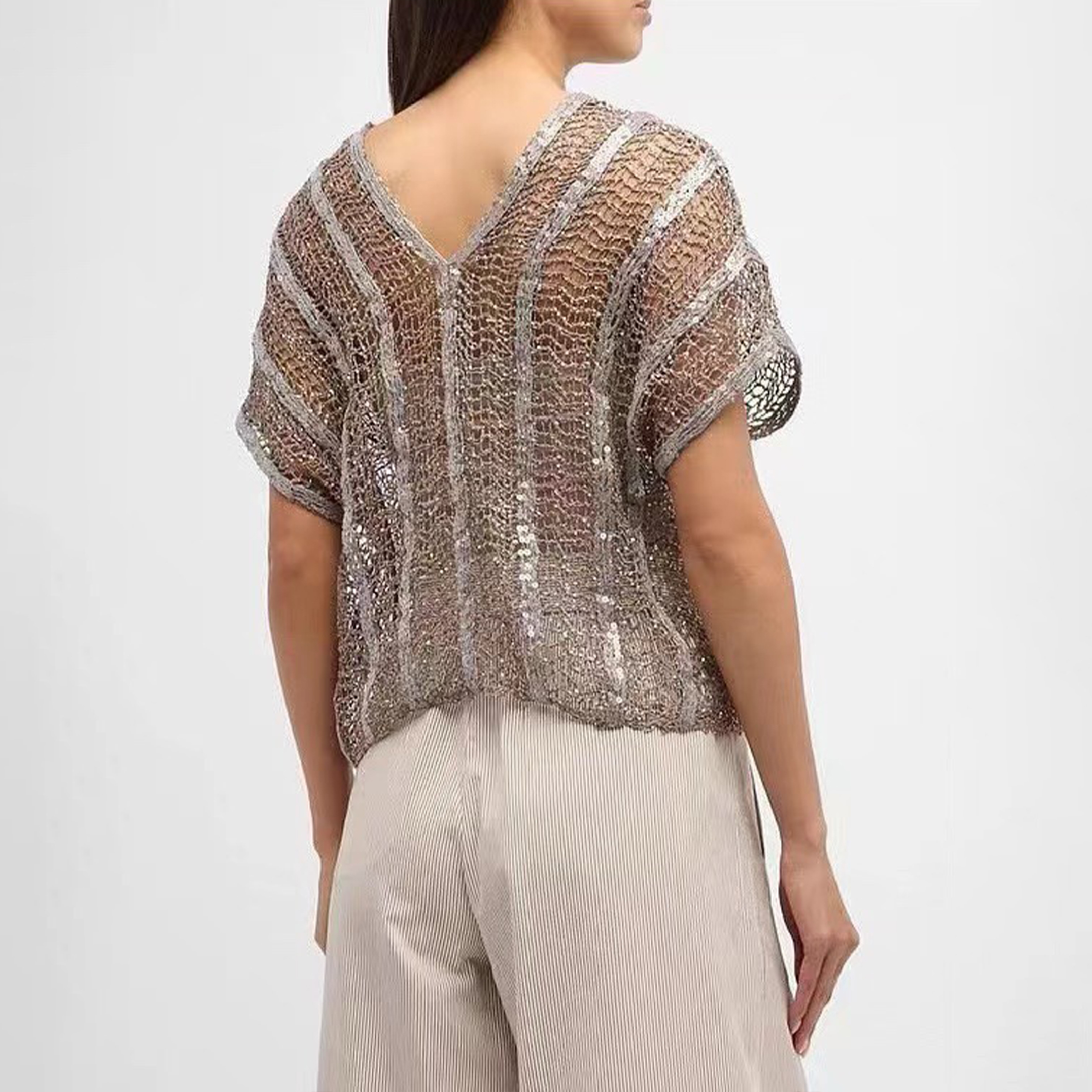 NIGO Brunello Cucinelli Women's Spring And Summer Shining Stripes Decoration Mesh Hole Embroidery T-shirt Half-body Skirt Set Fashion Casual Temperament Suit Set Ngvp #nigo9129
