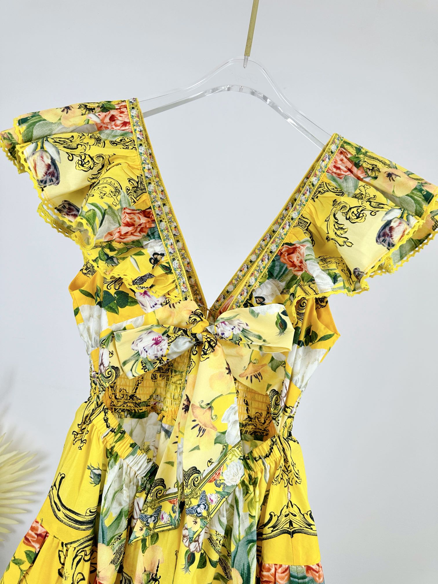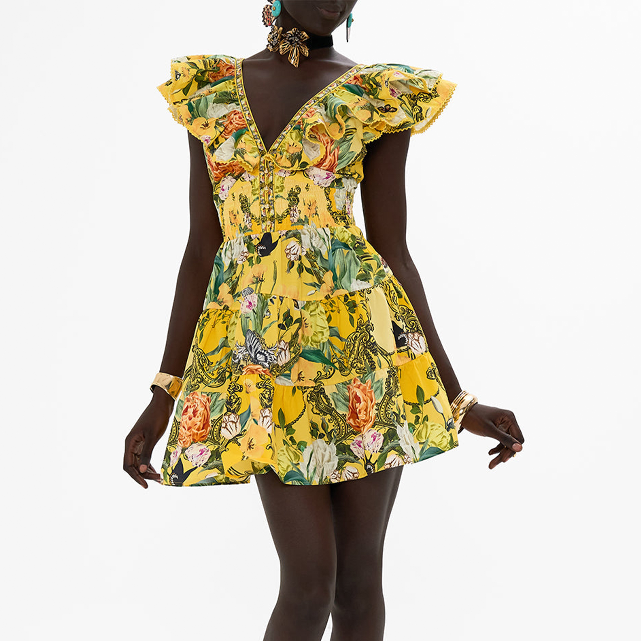 NIGO Camilla Women's Summer Printed V-neck Rhinestone Embellished Cotton Ruffle Waisted Mini Dresses Ngvp #nigo8918