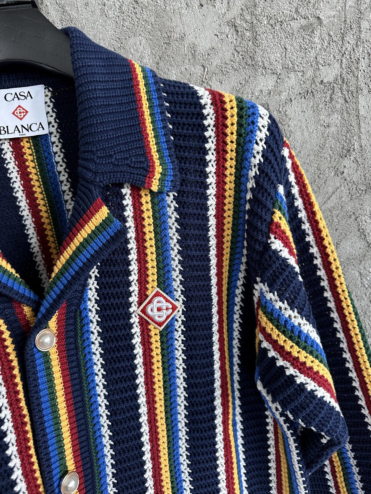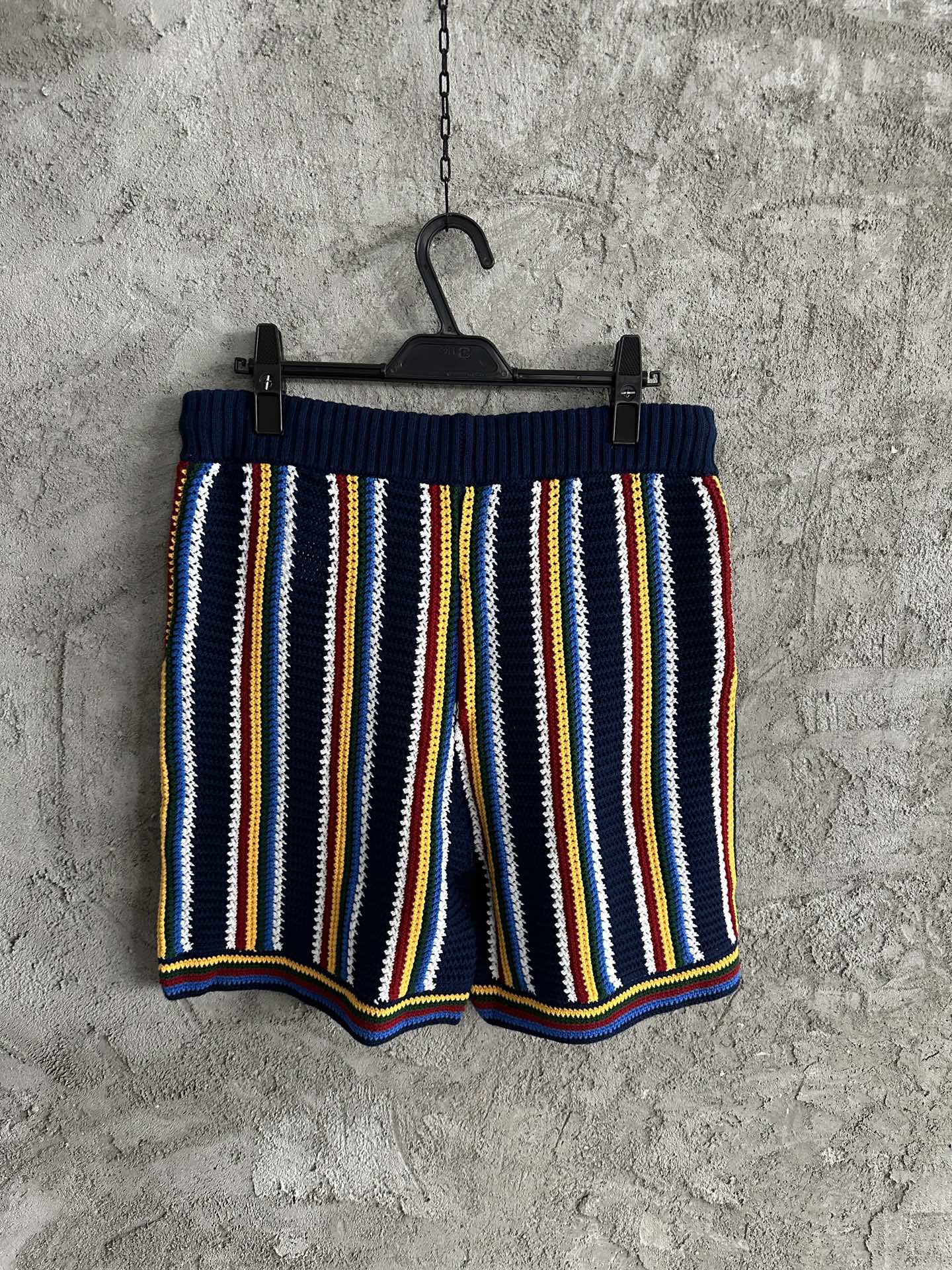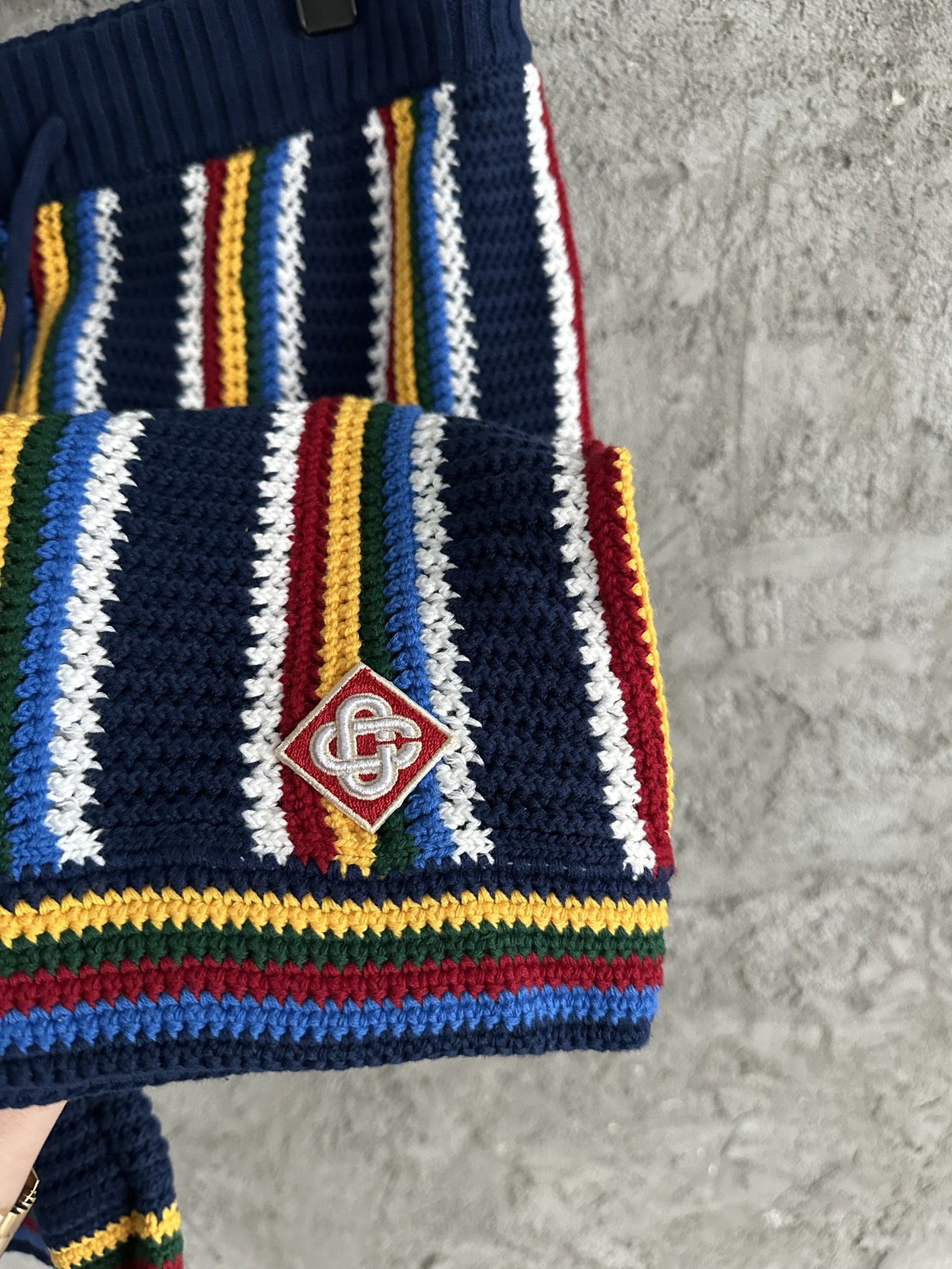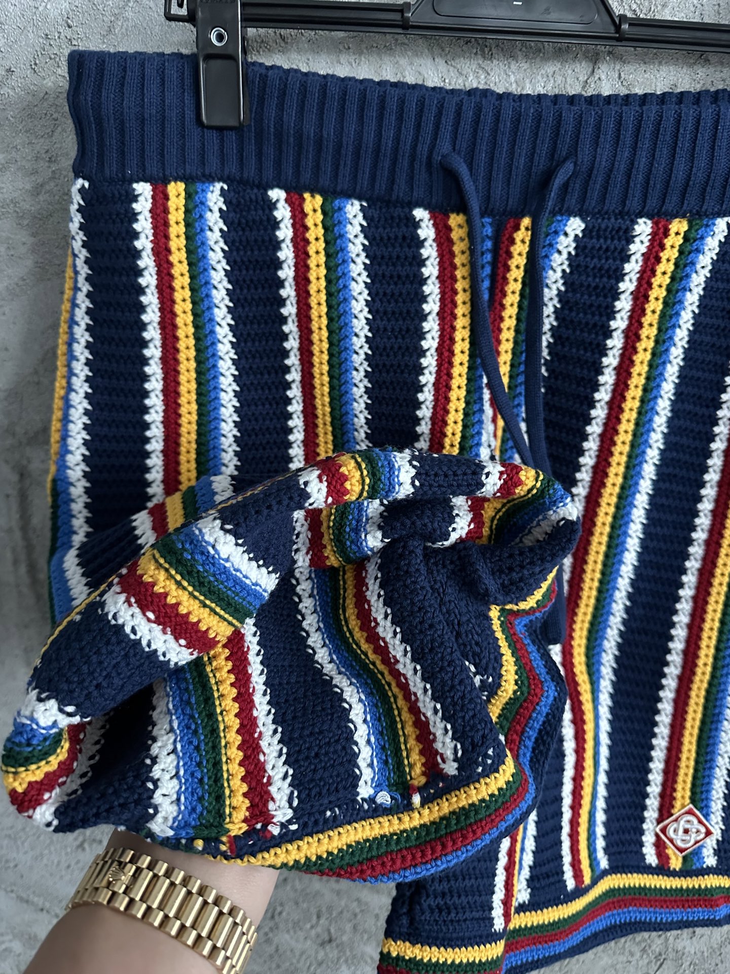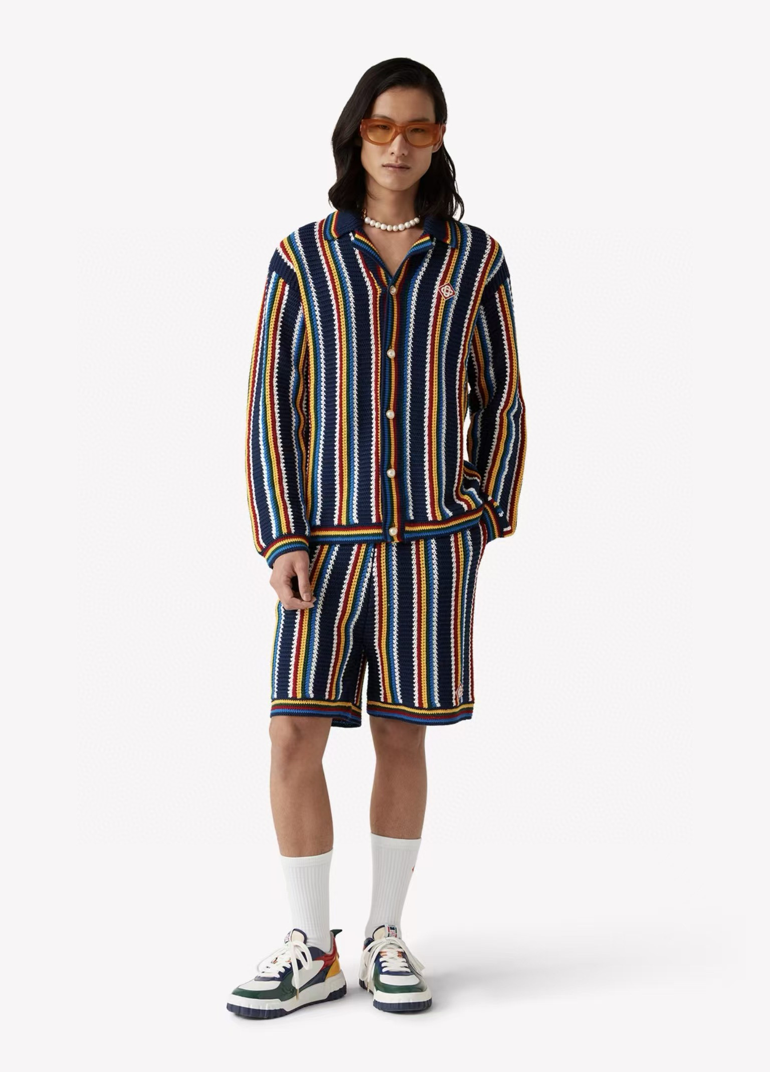 NIGO Casablanca Men's Spring And Summer Vertical Stripes Printed Single Breasted Long Sleeved Knitted Shirt Drawstring Tie Casual Knitted Shorts Suit Set #nigo76349