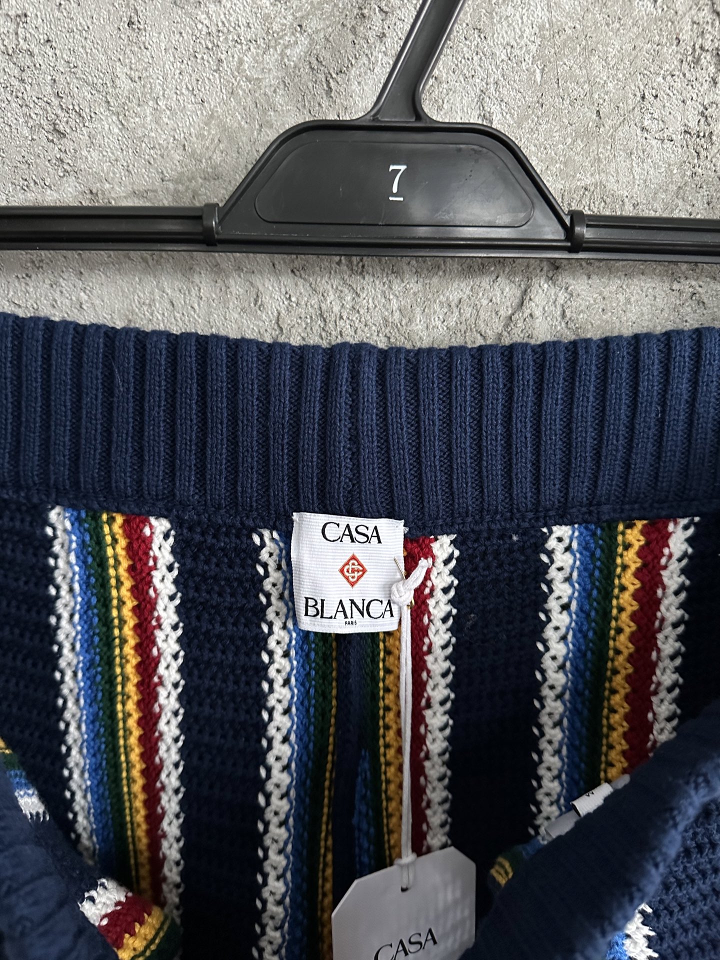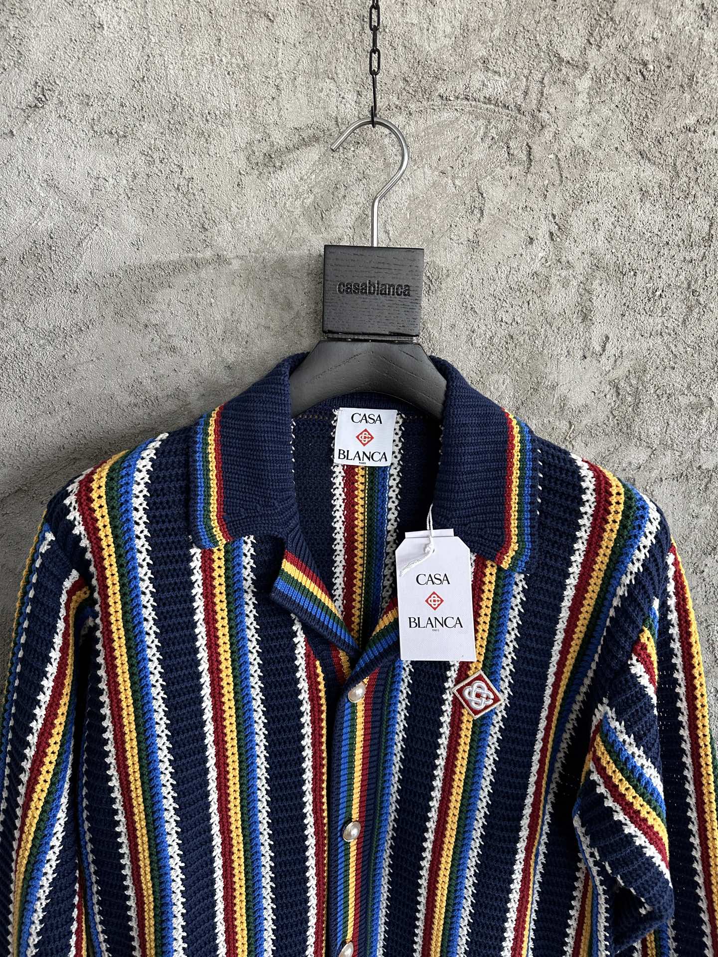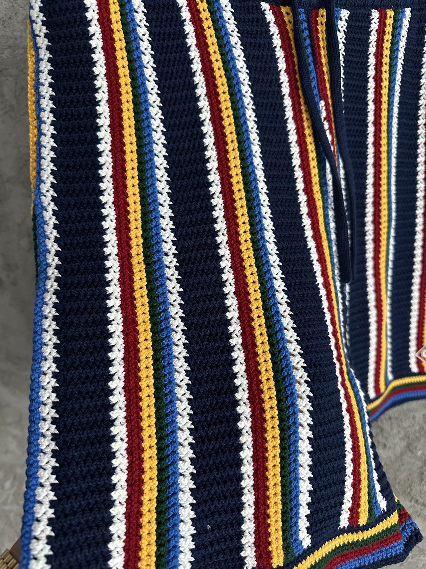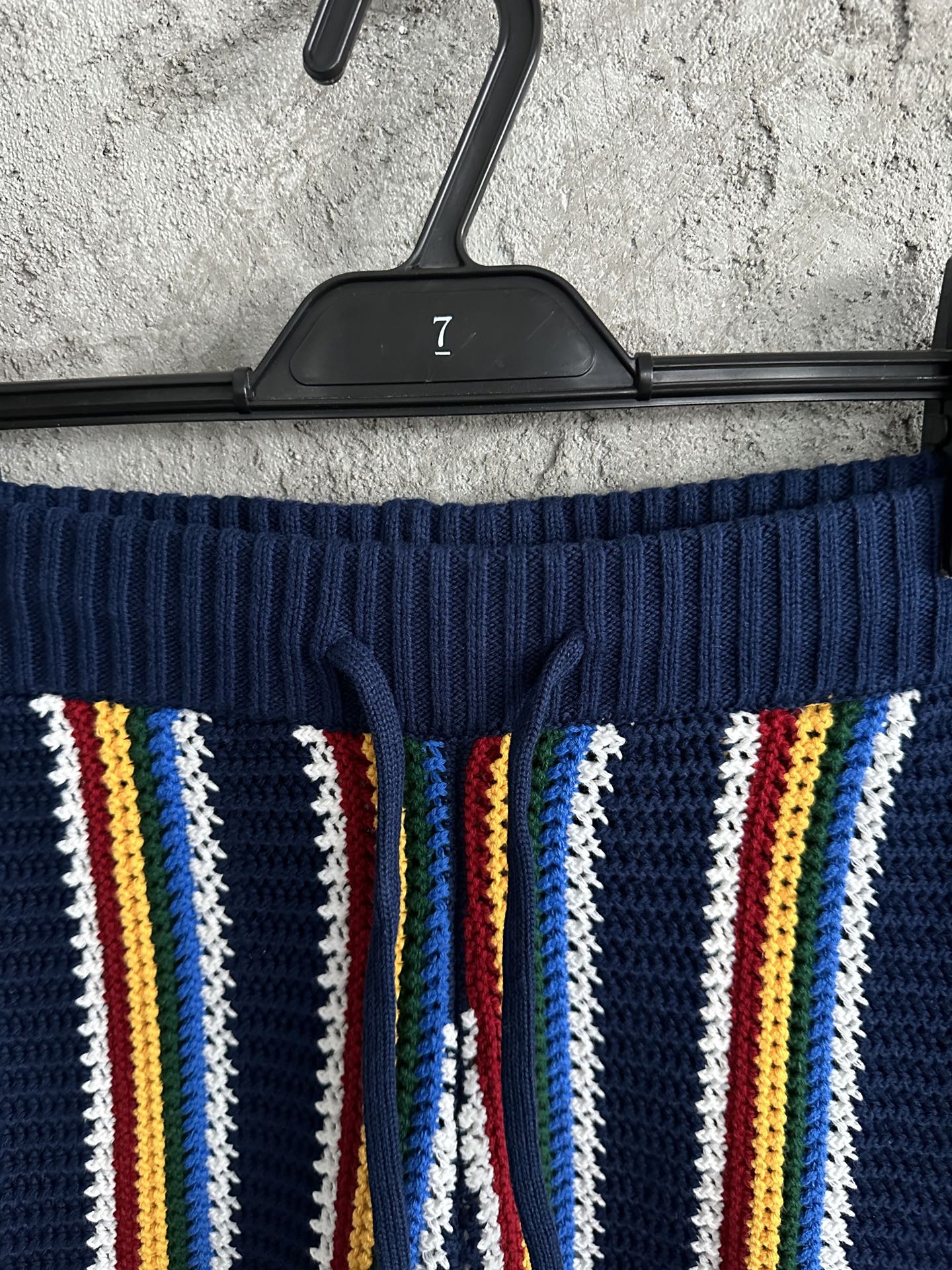 NIGO Casablanca Men's Spring And Summer Vertical Stripes Printed Single Breasted Long Sleeved Knitted Shirt Drawstring Tie Casual Knitted Shorts Suit Set #nigo76349