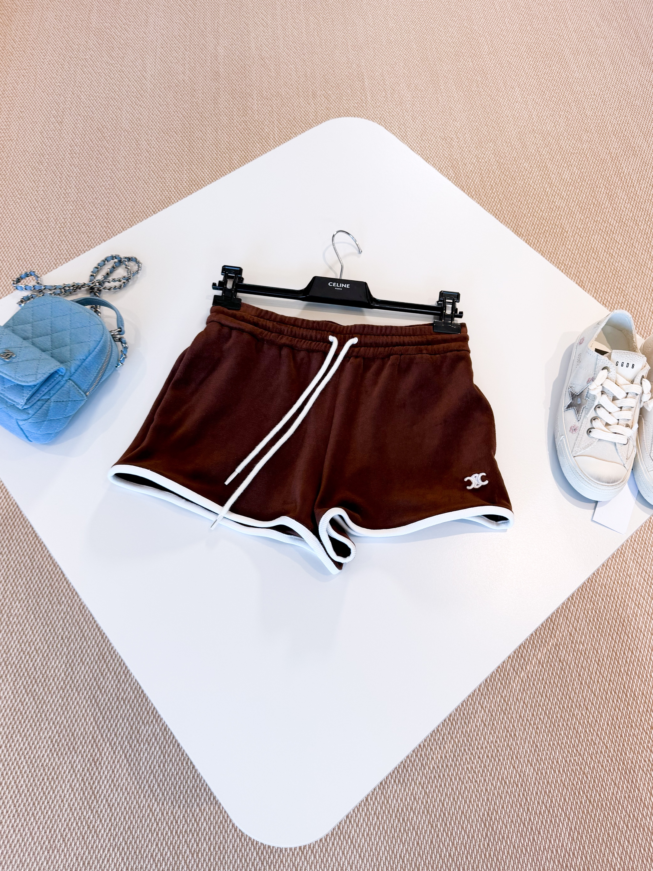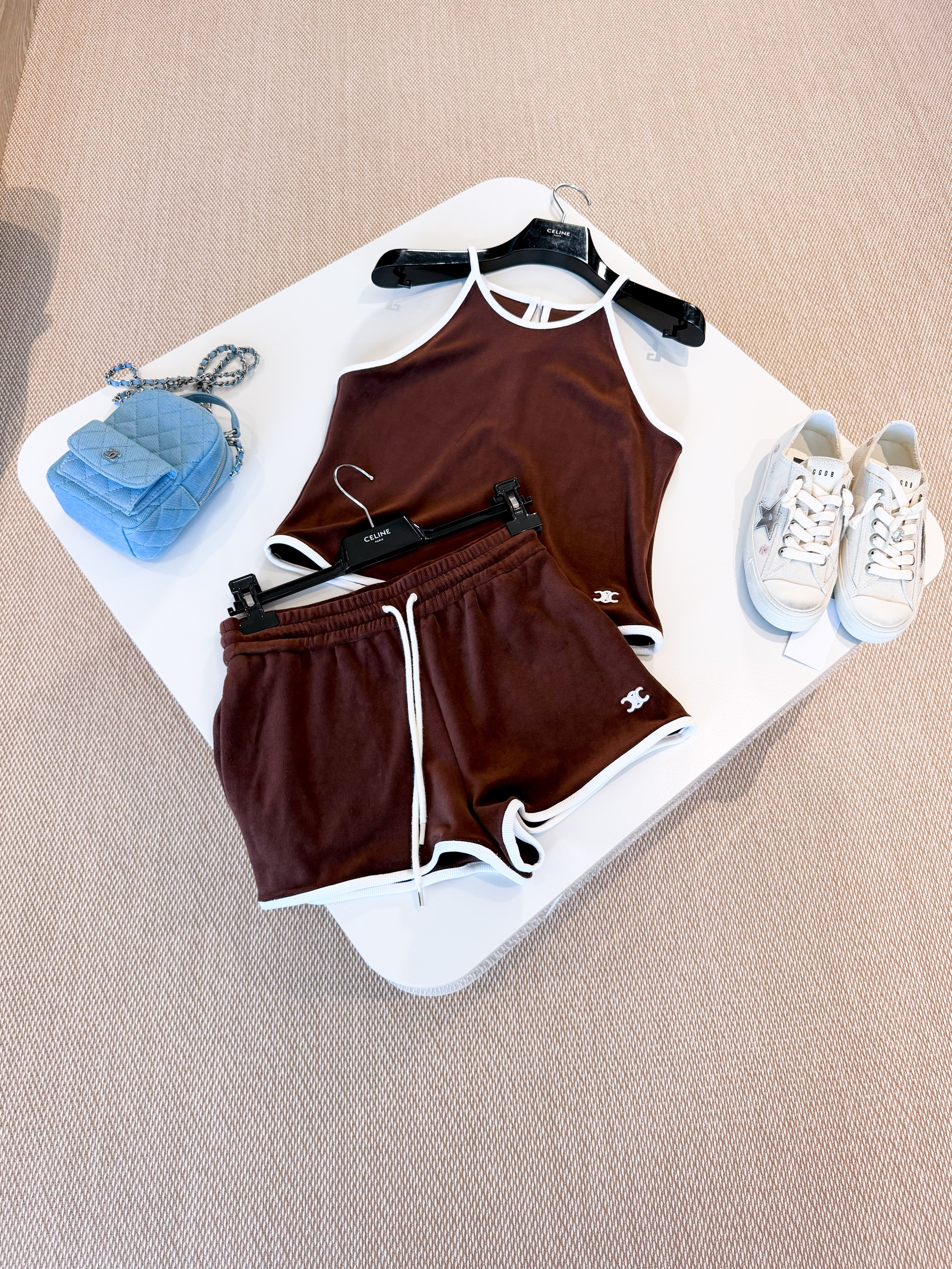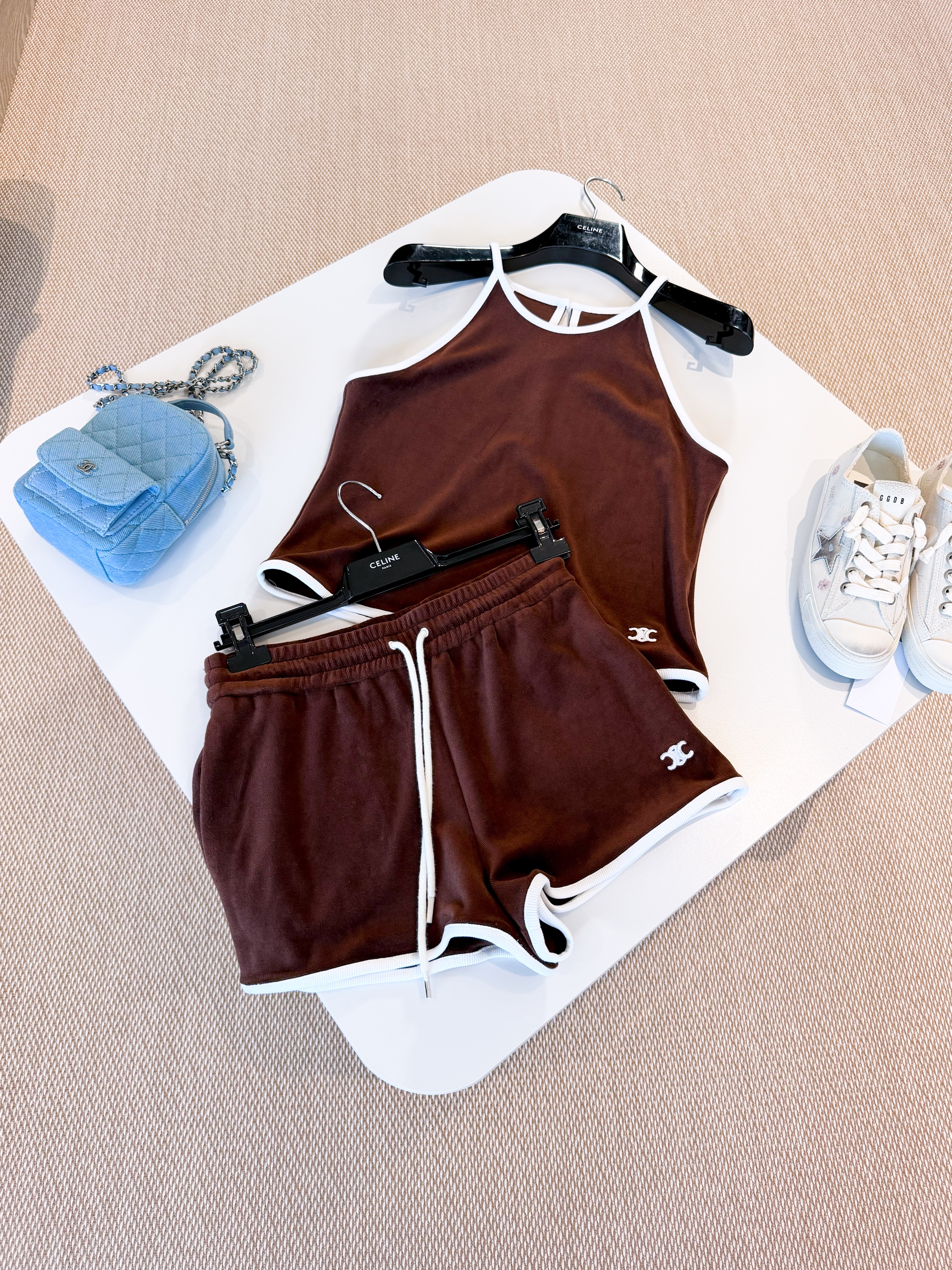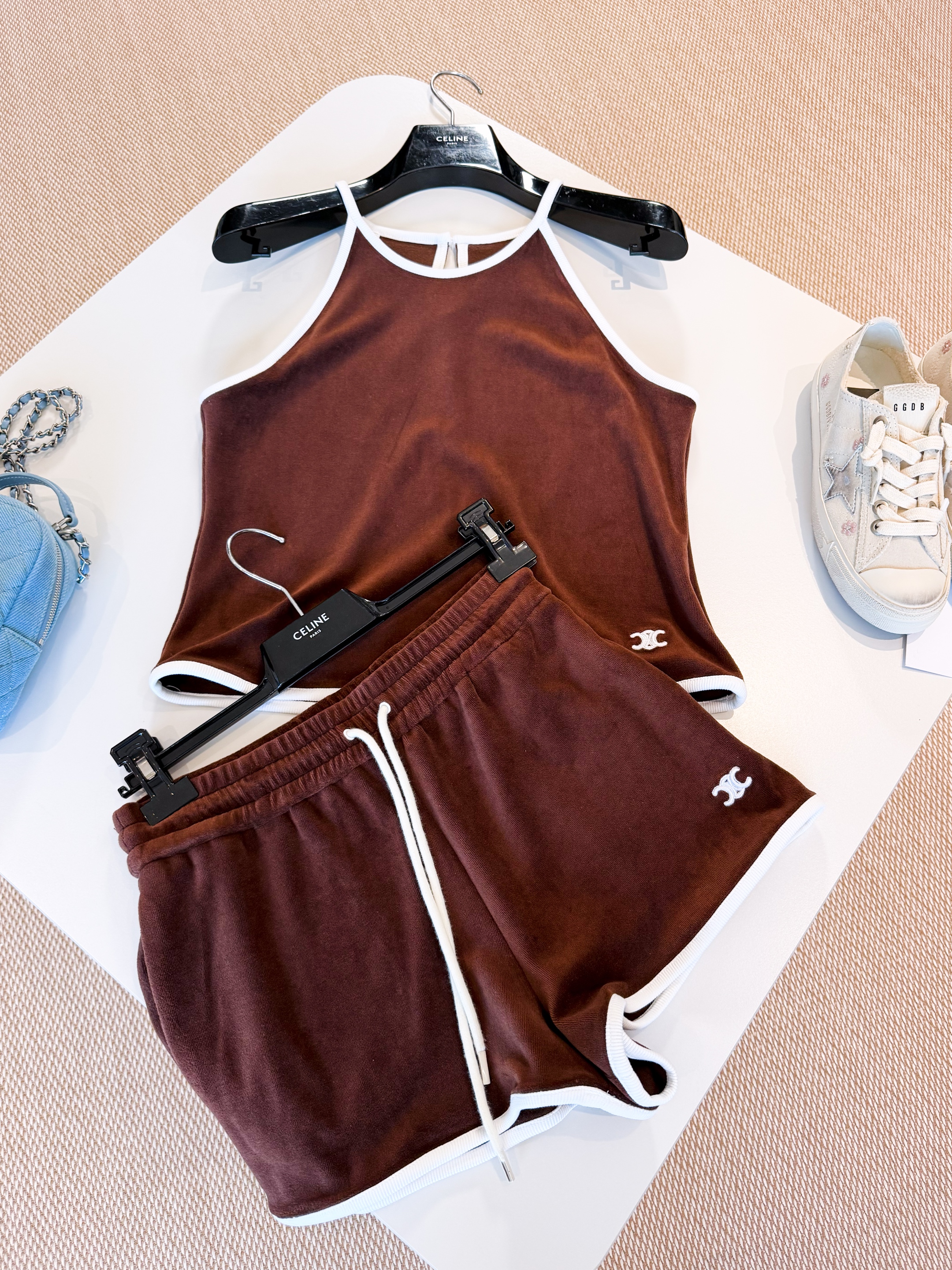 NIGO Celine Women's Women's Spring And Summer Velvet Plain Knit Mini Shorts Fashion Trend Temperament Elegant Tank Top Brown Set Suit #nigo81378