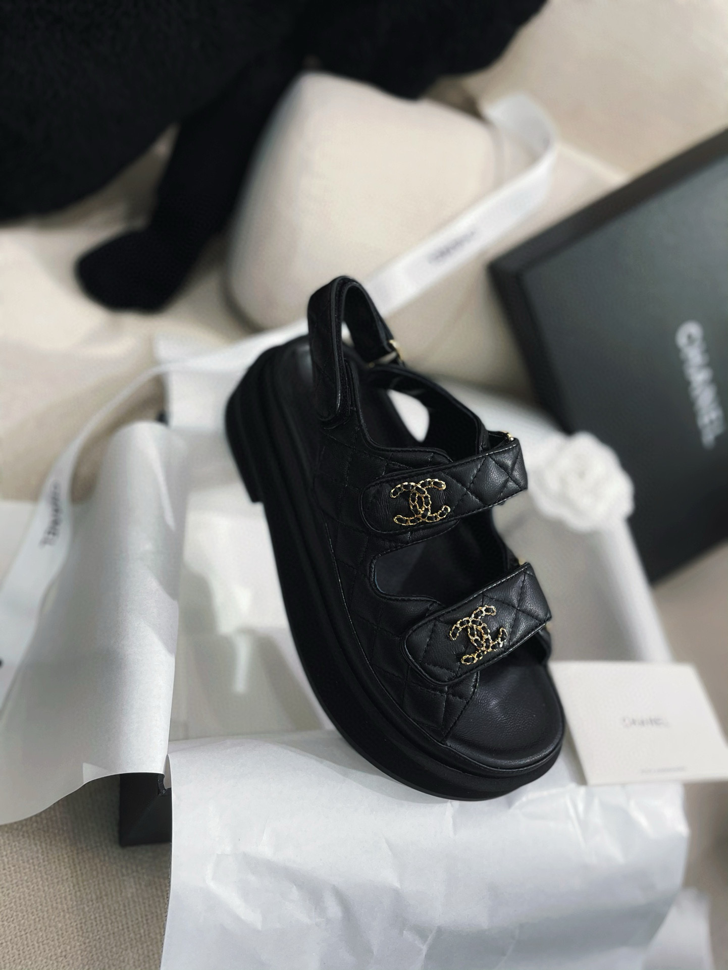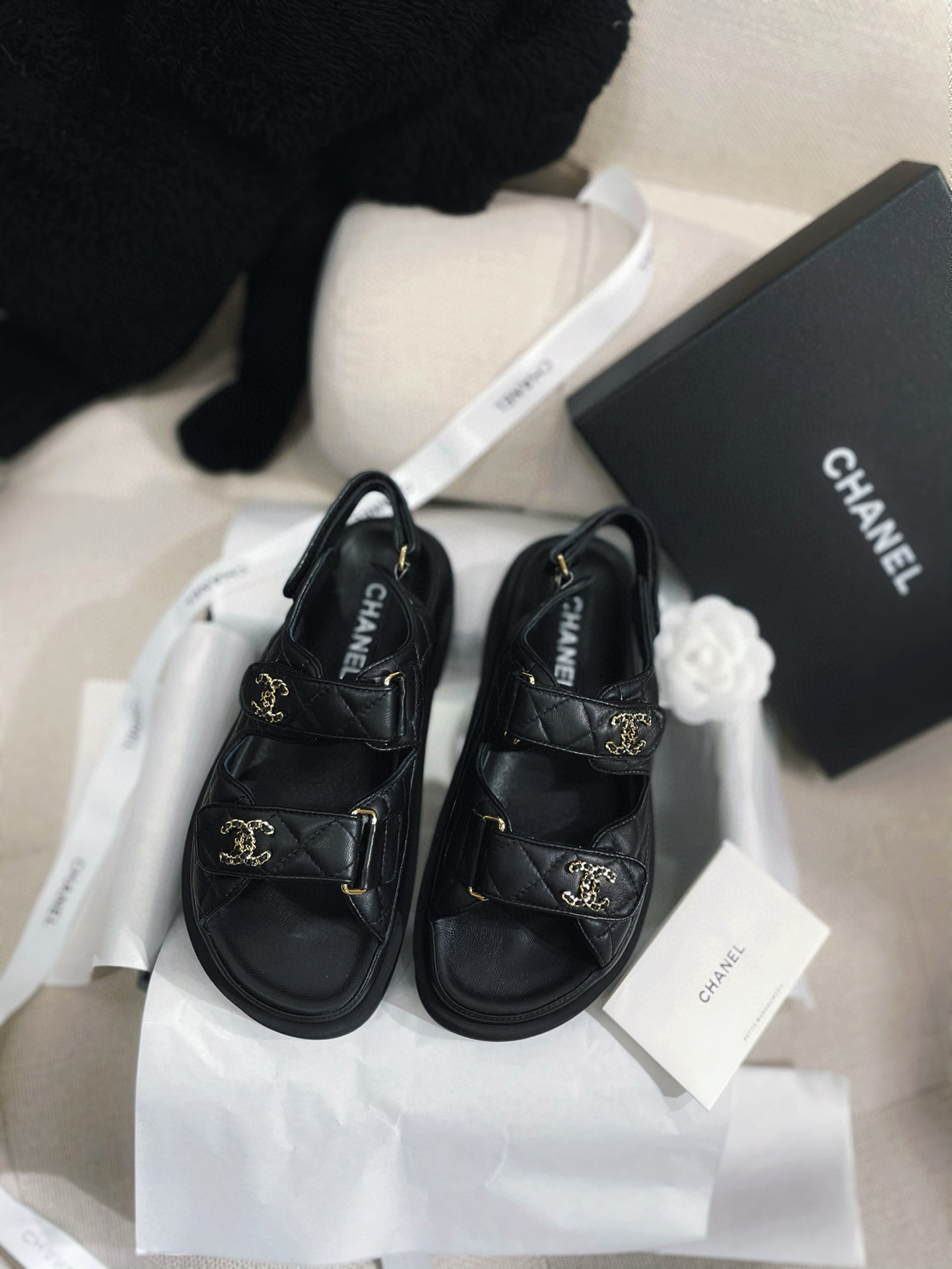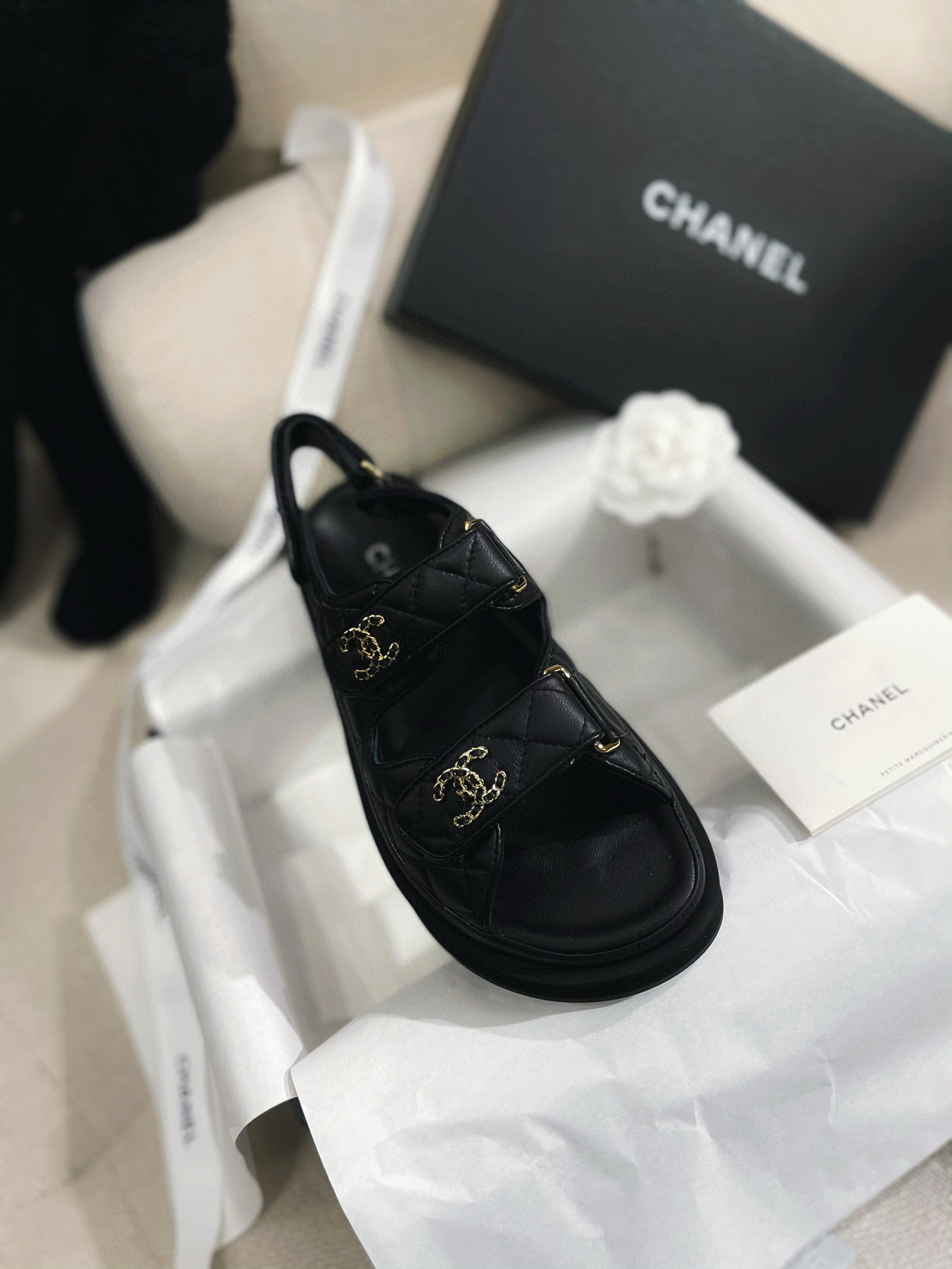 NIGO Chanel Women's Summer Black Gold Double C Velcro Stacked Sheepskin Flat Beach Sandals Shoes #nigo98129