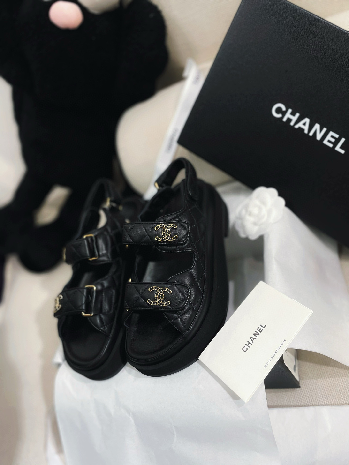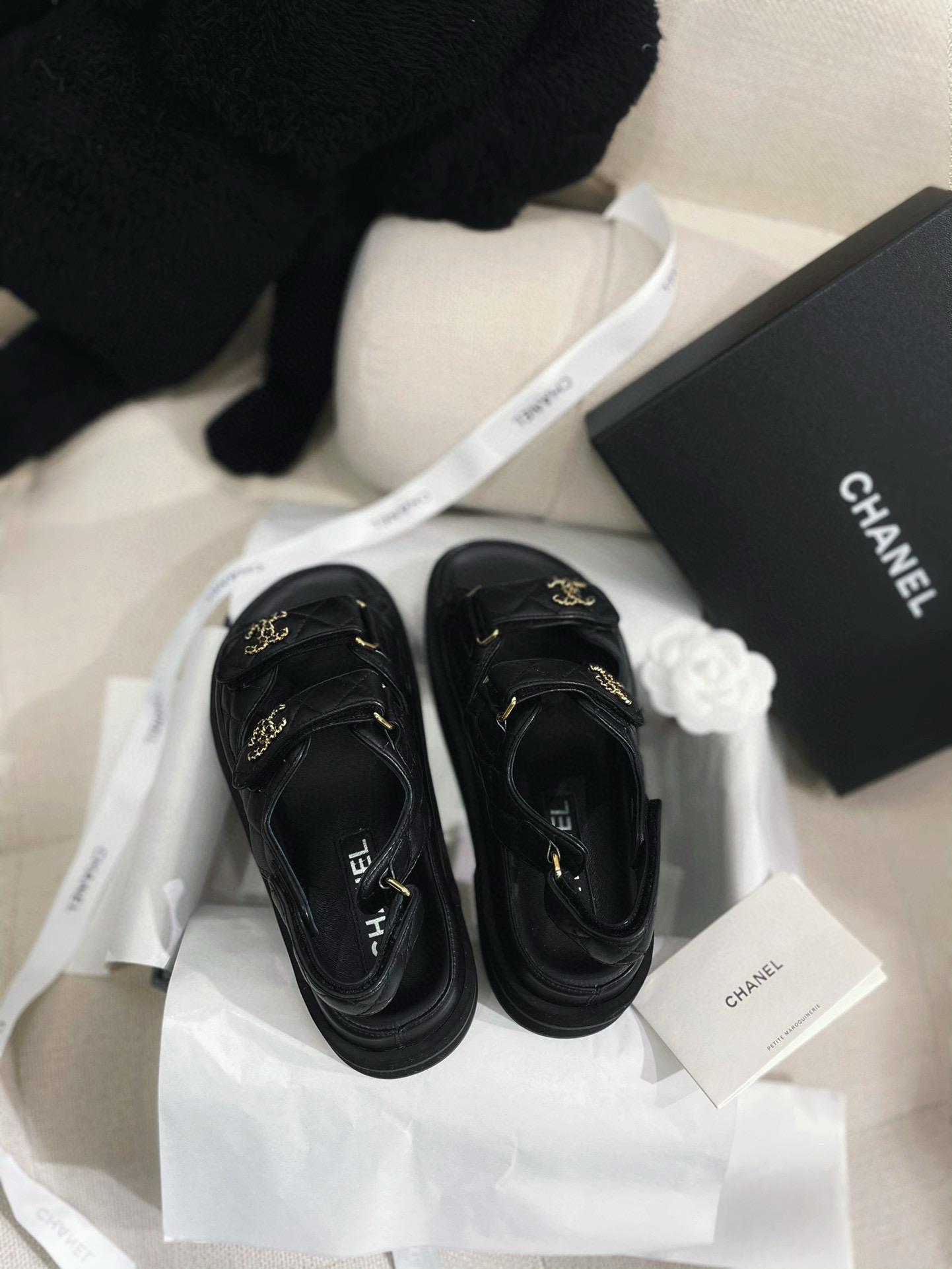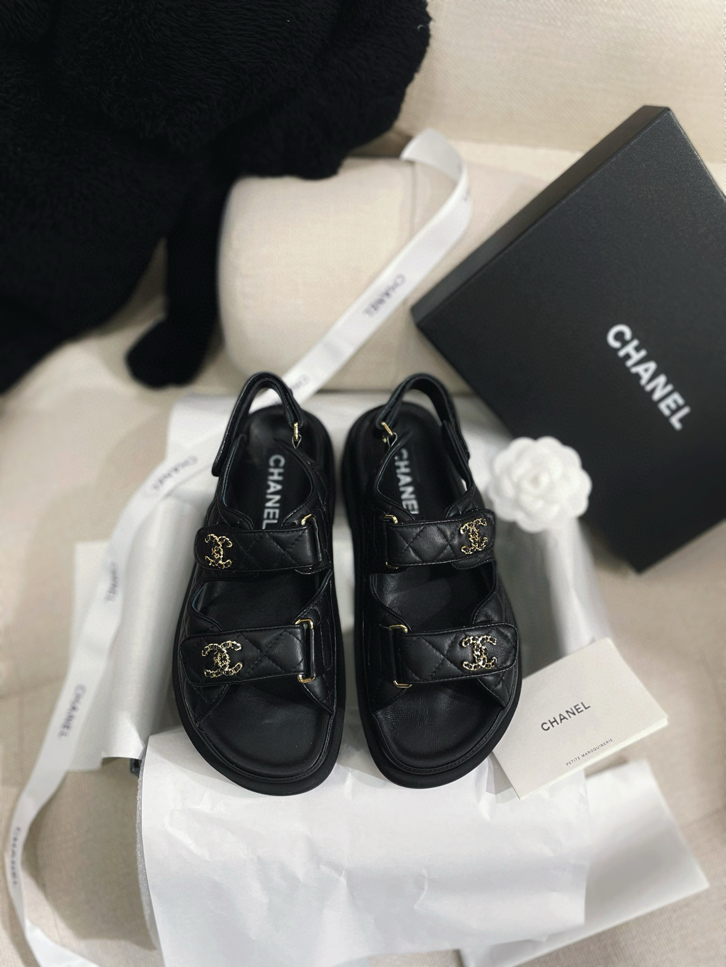 NIGO Chanel Women's Summer Black Gold Double C Velcro Stacked Sheepskin Flat Beach Sandals Shoes #nigo98129