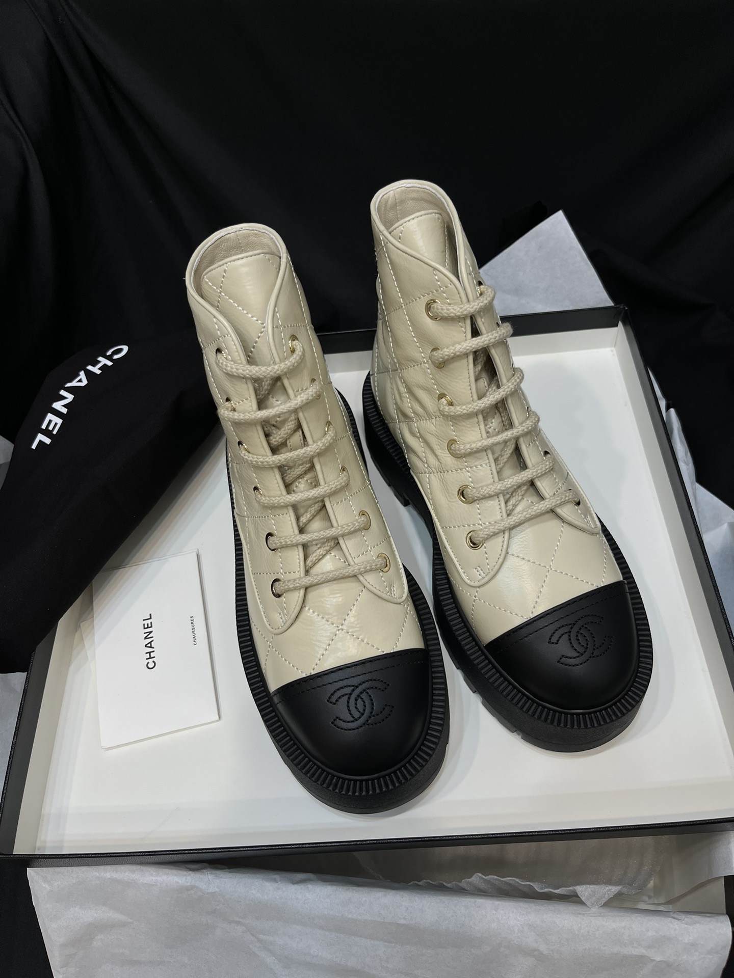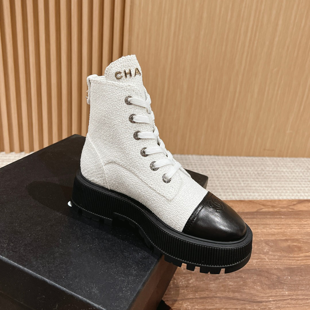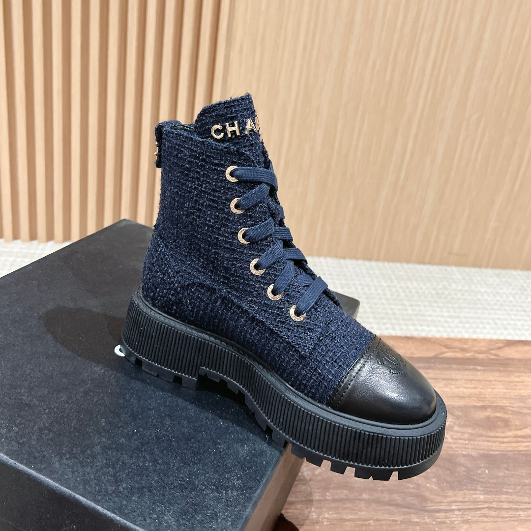NIGO Chanel Women's Autumn and Winter Solid Color Canvas Patchwork Leather Mid Calf Lace Up Boots Shoes #nigo75459