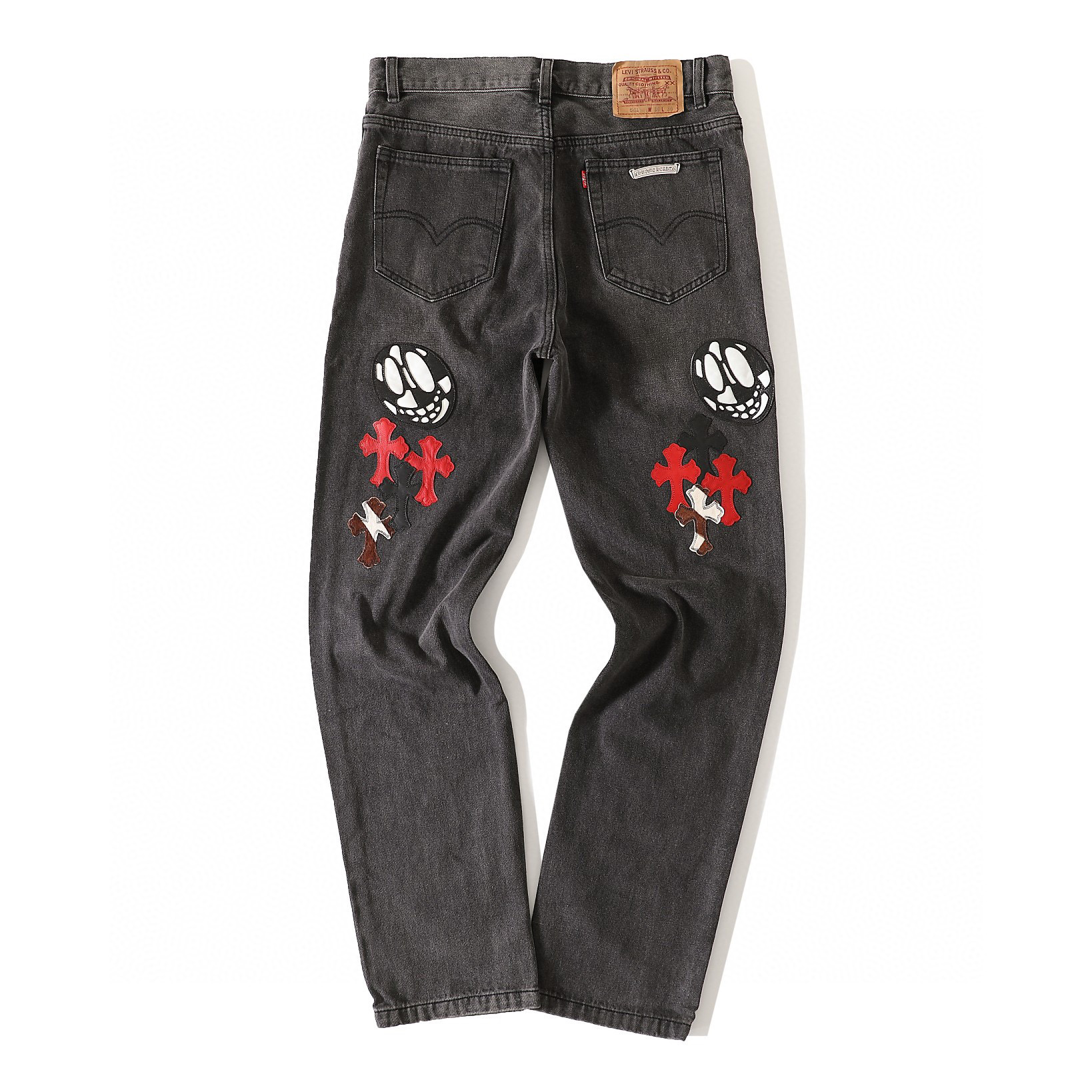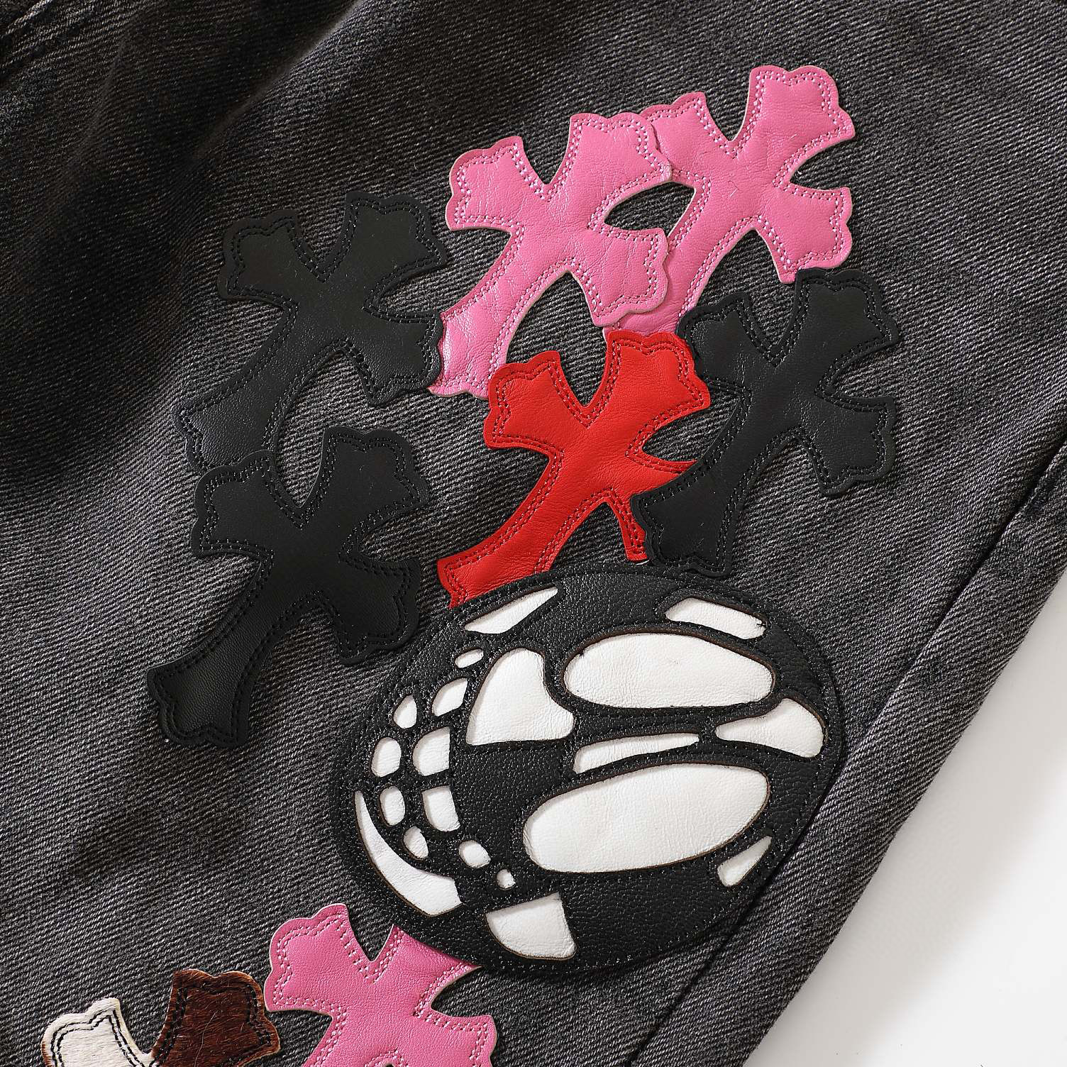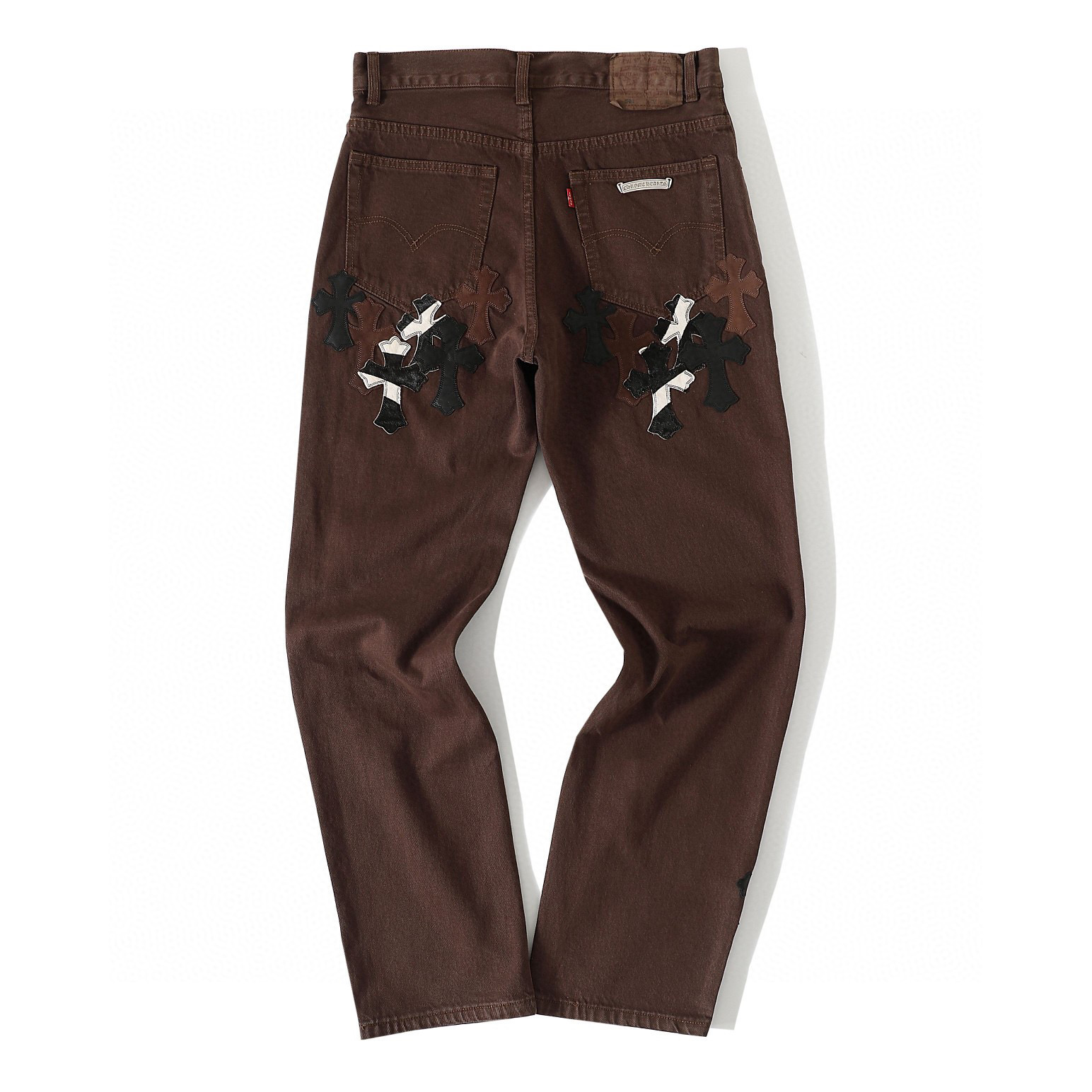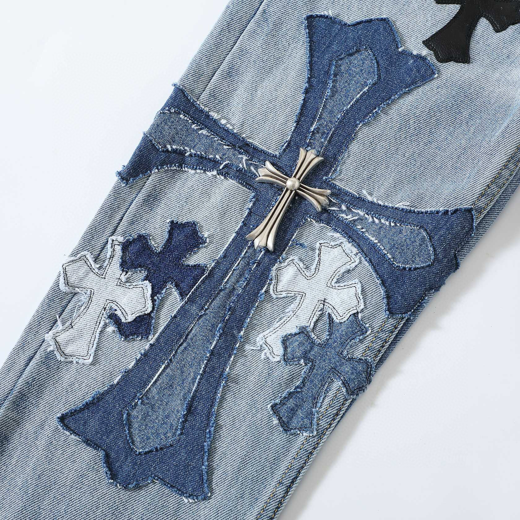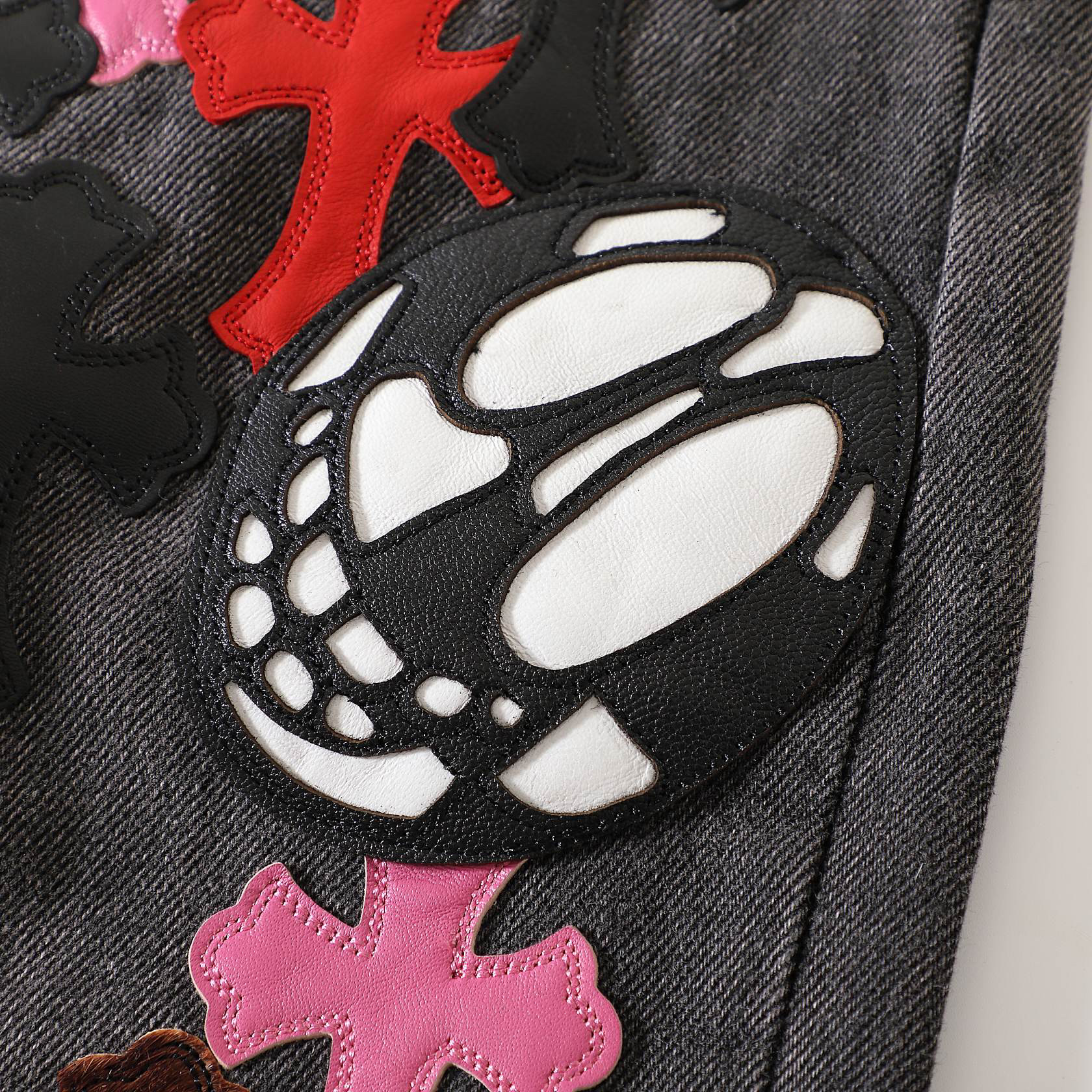 NIGO Chrome Hearts Patchwork Leather Cross Embroidered Straight Leg Aged High Street Loose Jeans Pants #nigo96918
