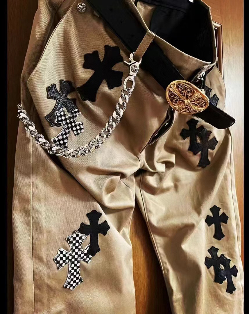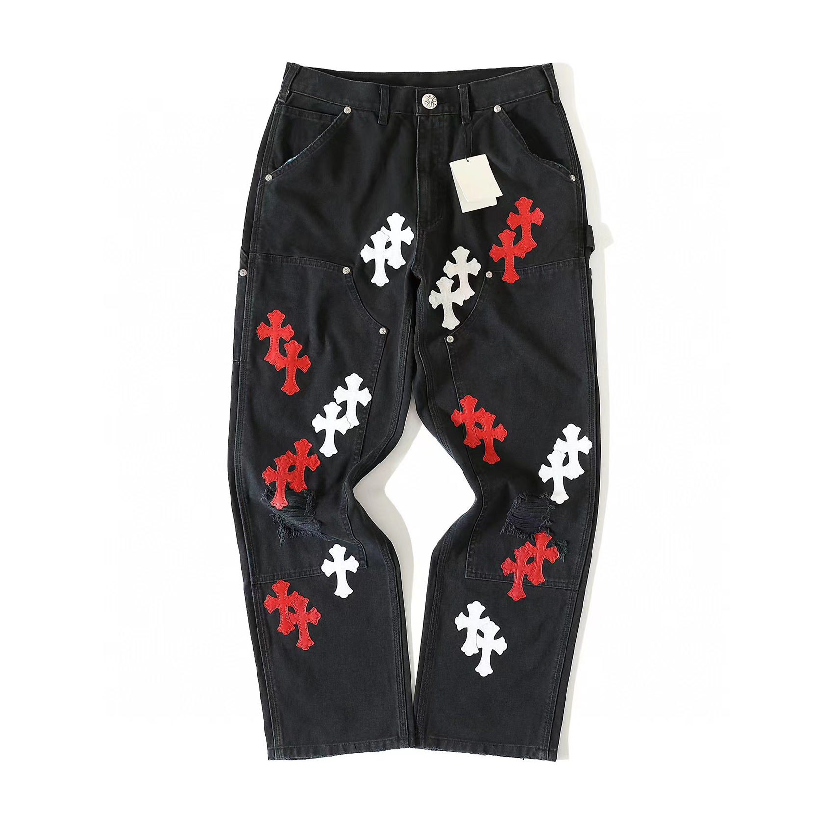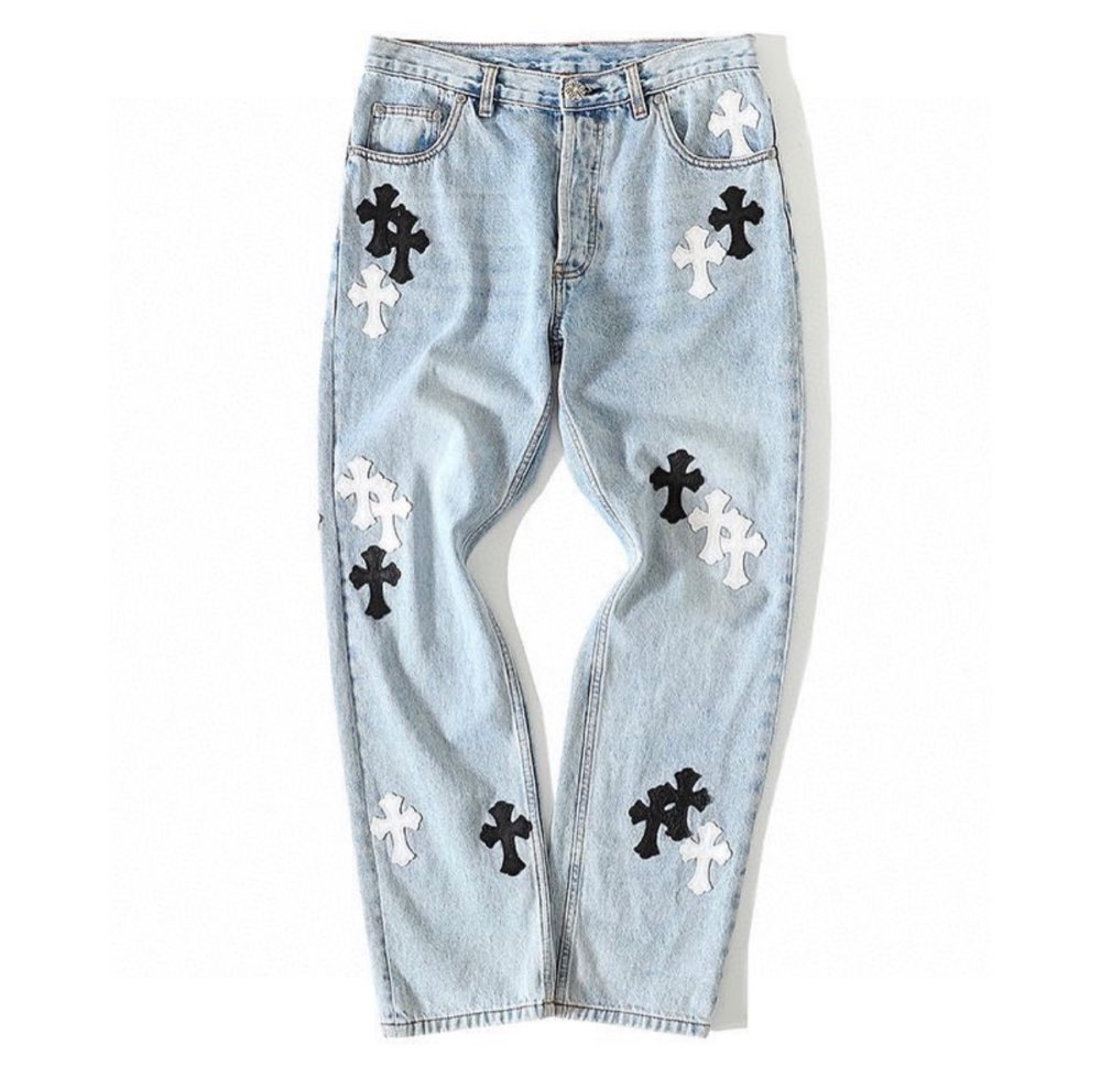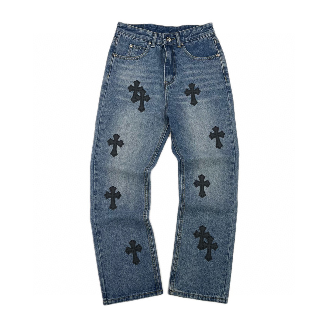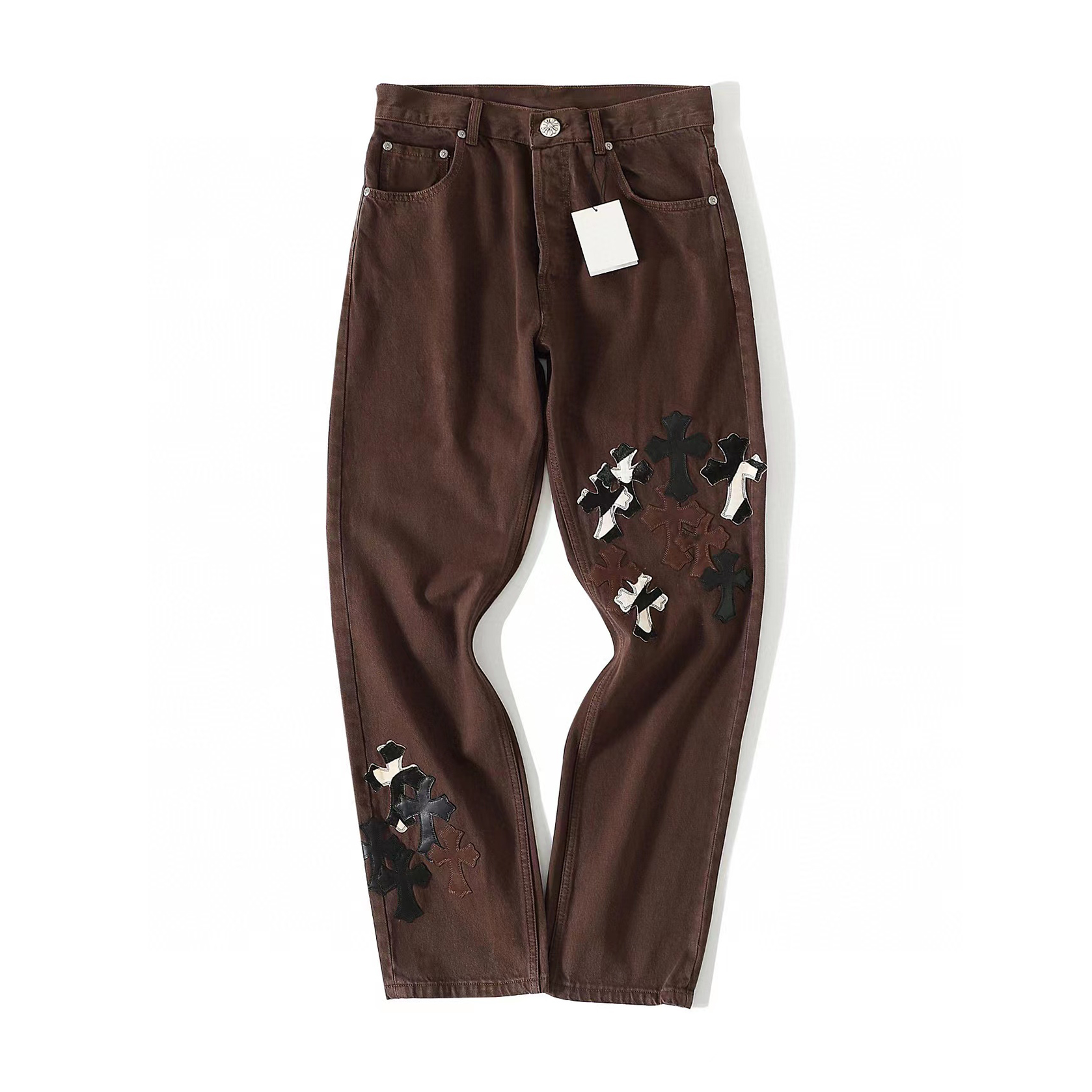 NIGO Chrome Hearts Patchwork Leather Cross Embroidered Straight Leg Aged High Street Loose Jeans Pants #nigo96918