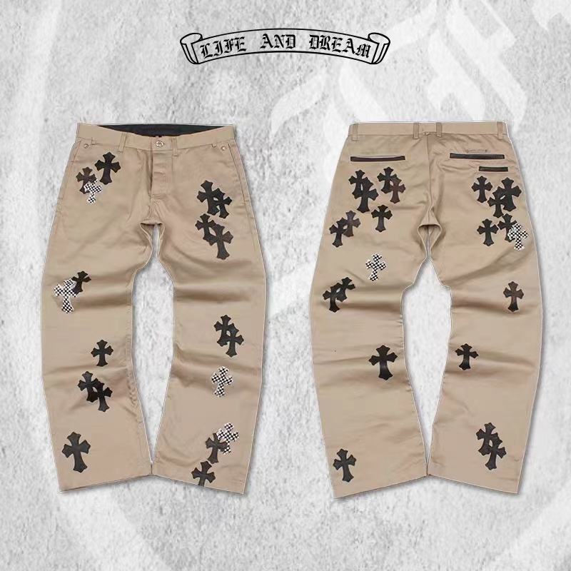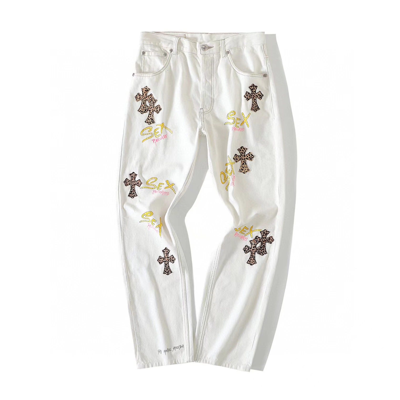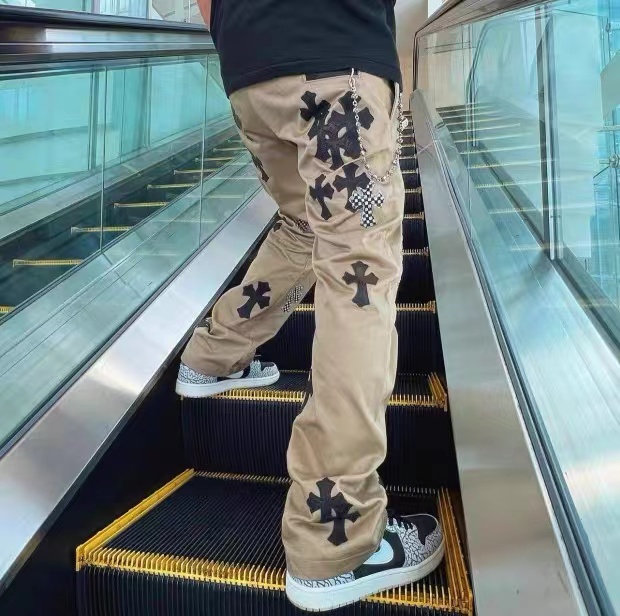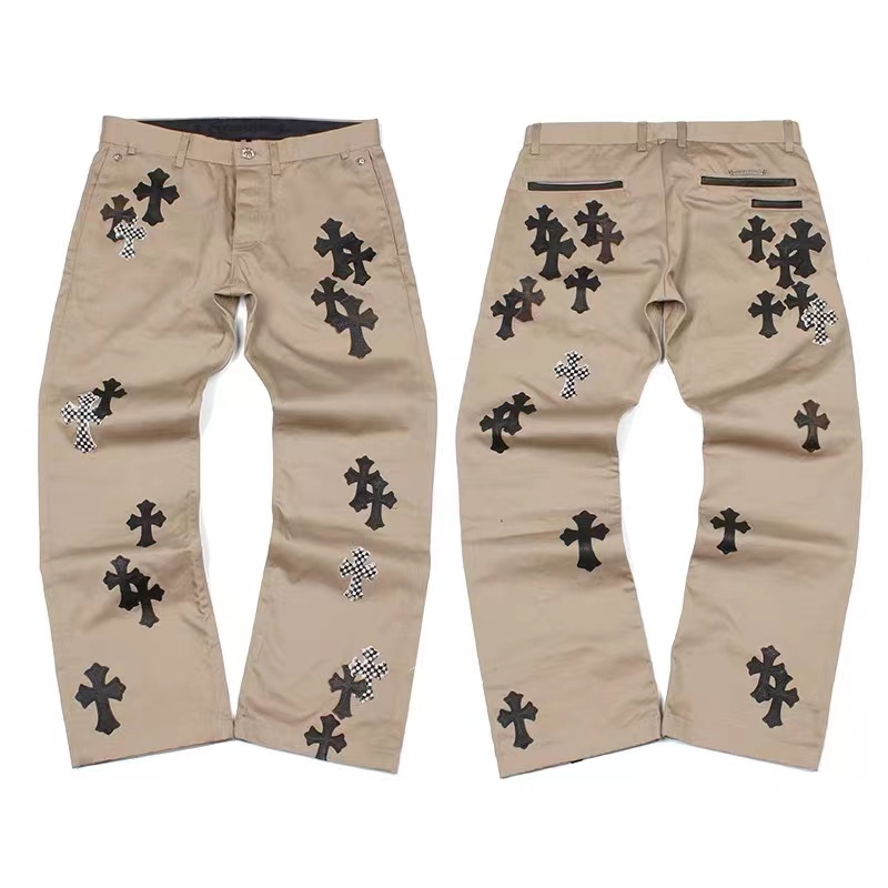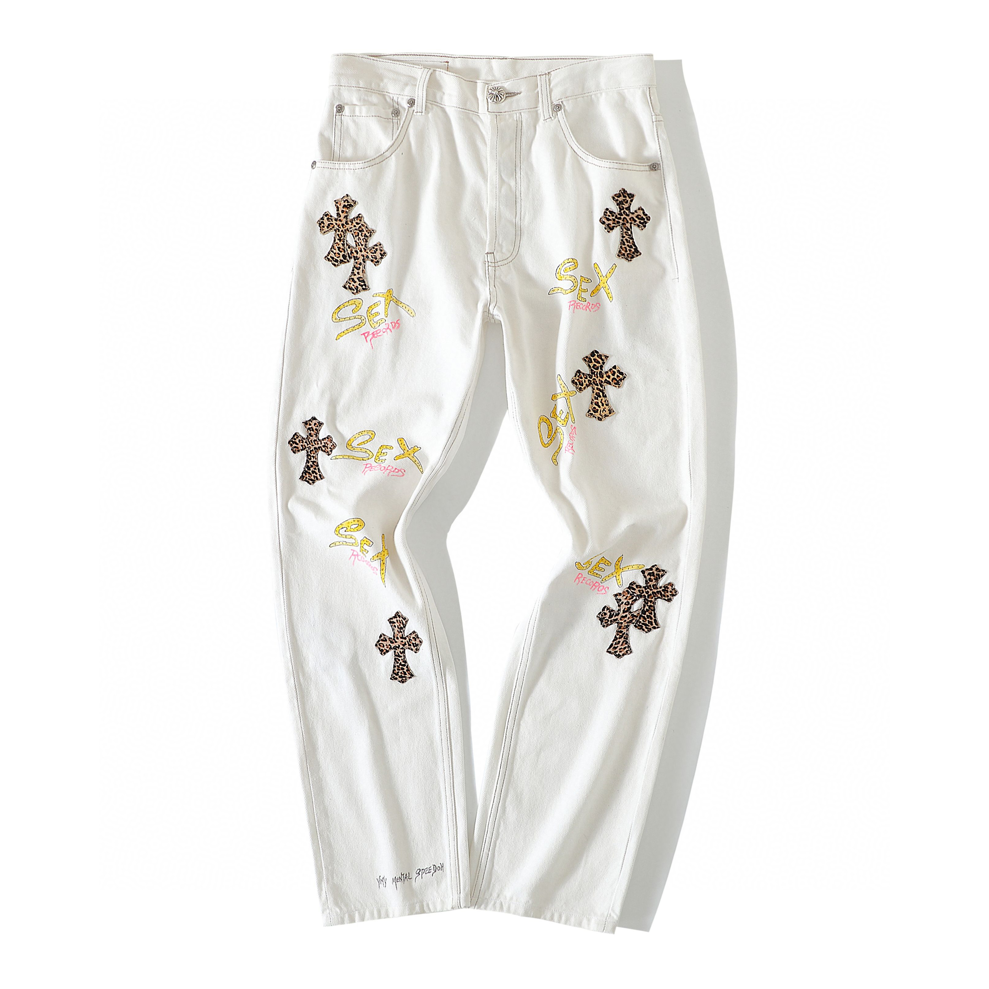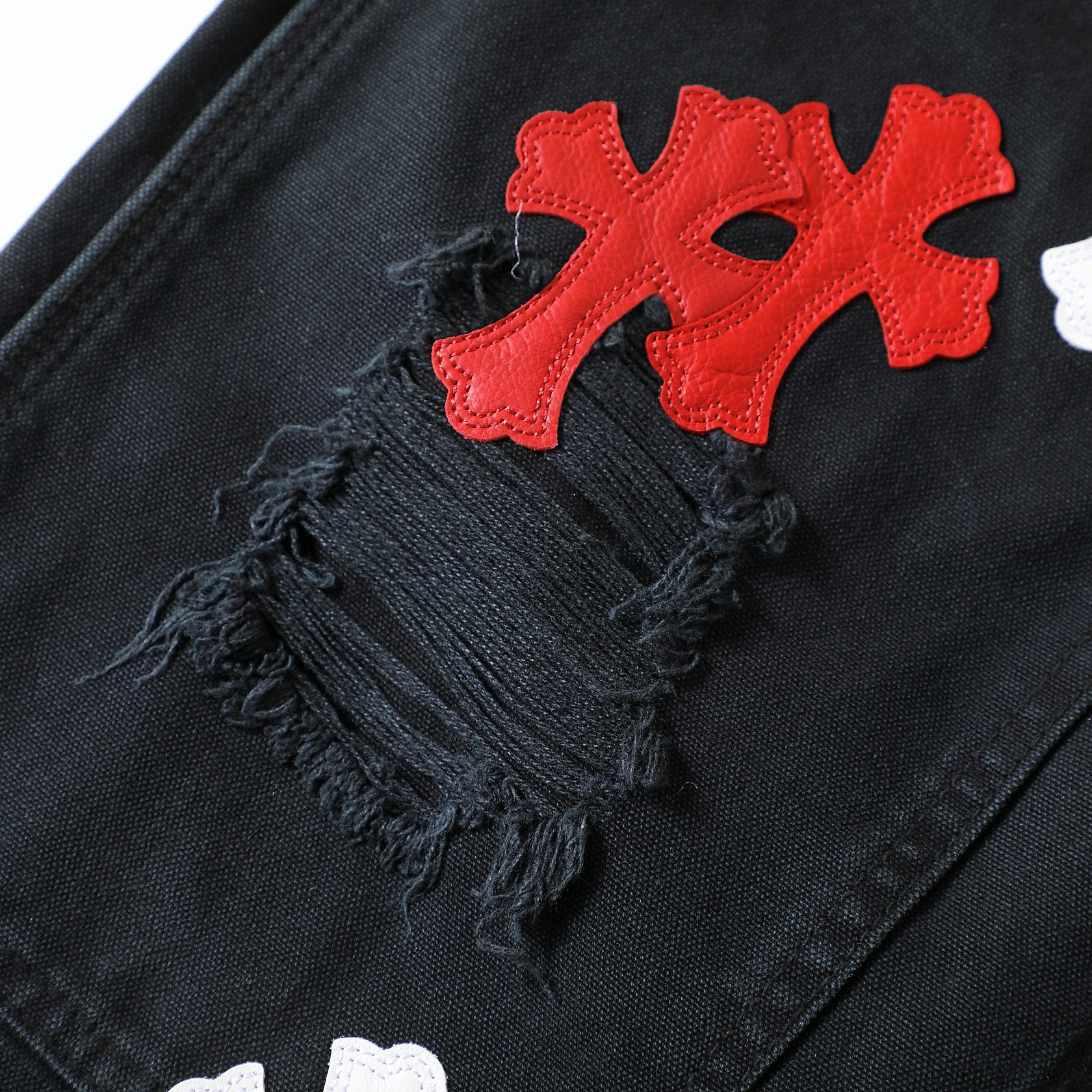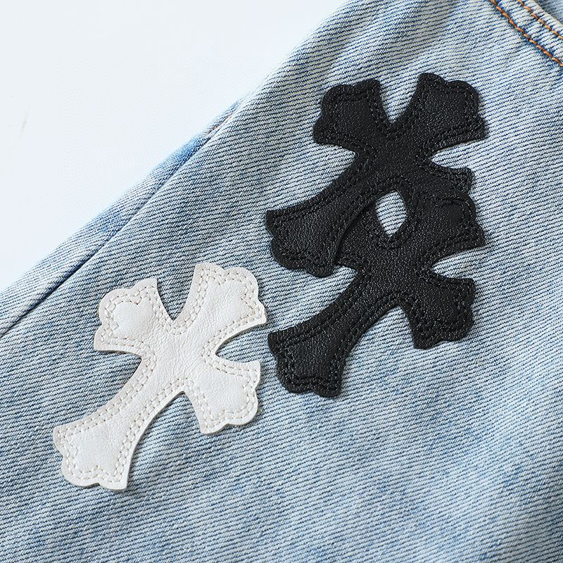 NIGO Chrome Hearts Patchwork Leather Cross Embroidered Straight Leg Aged High Street Loose Jeans Pants #nigo96918