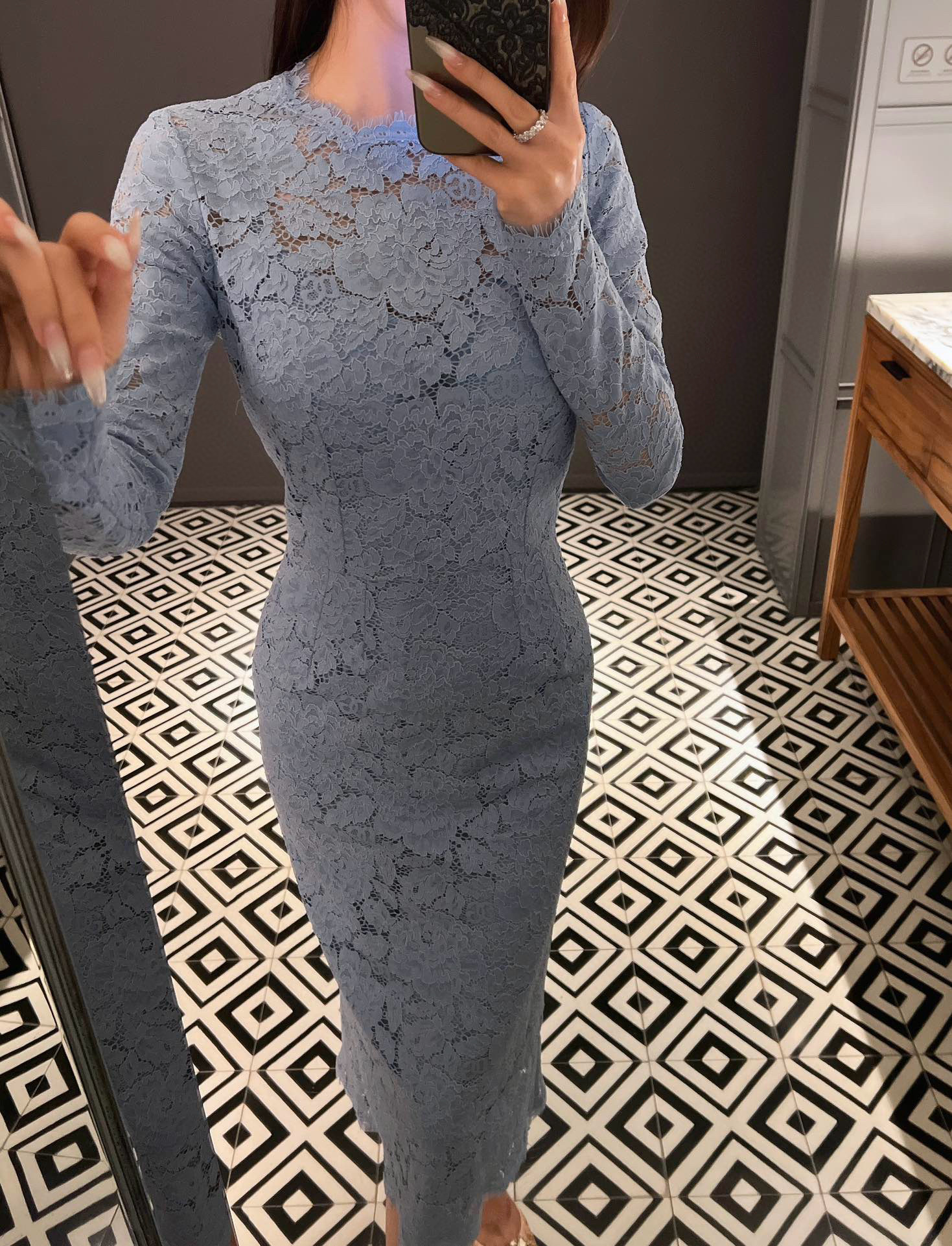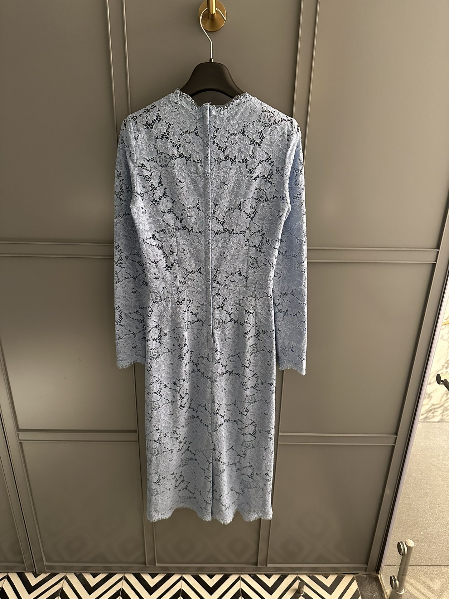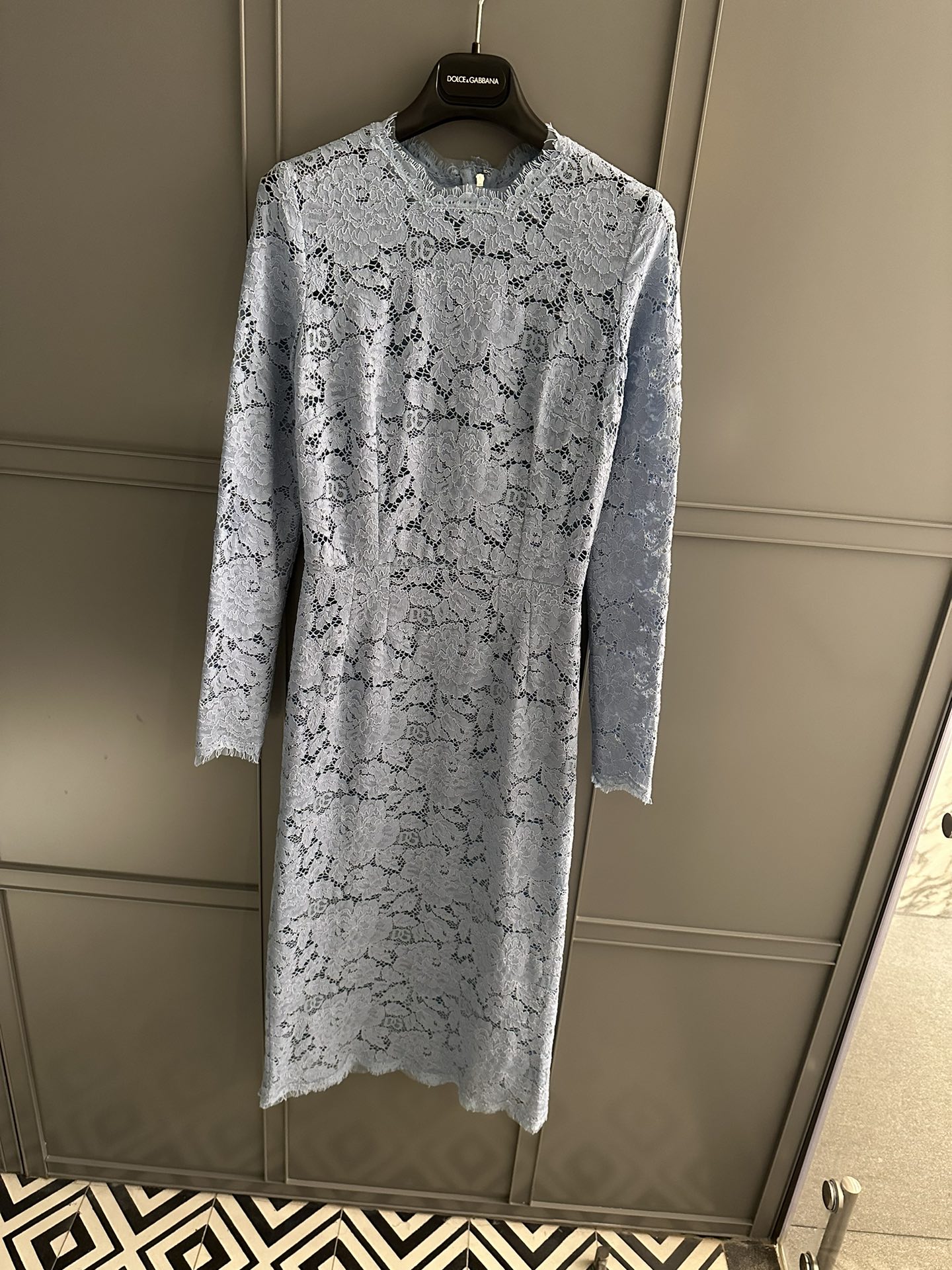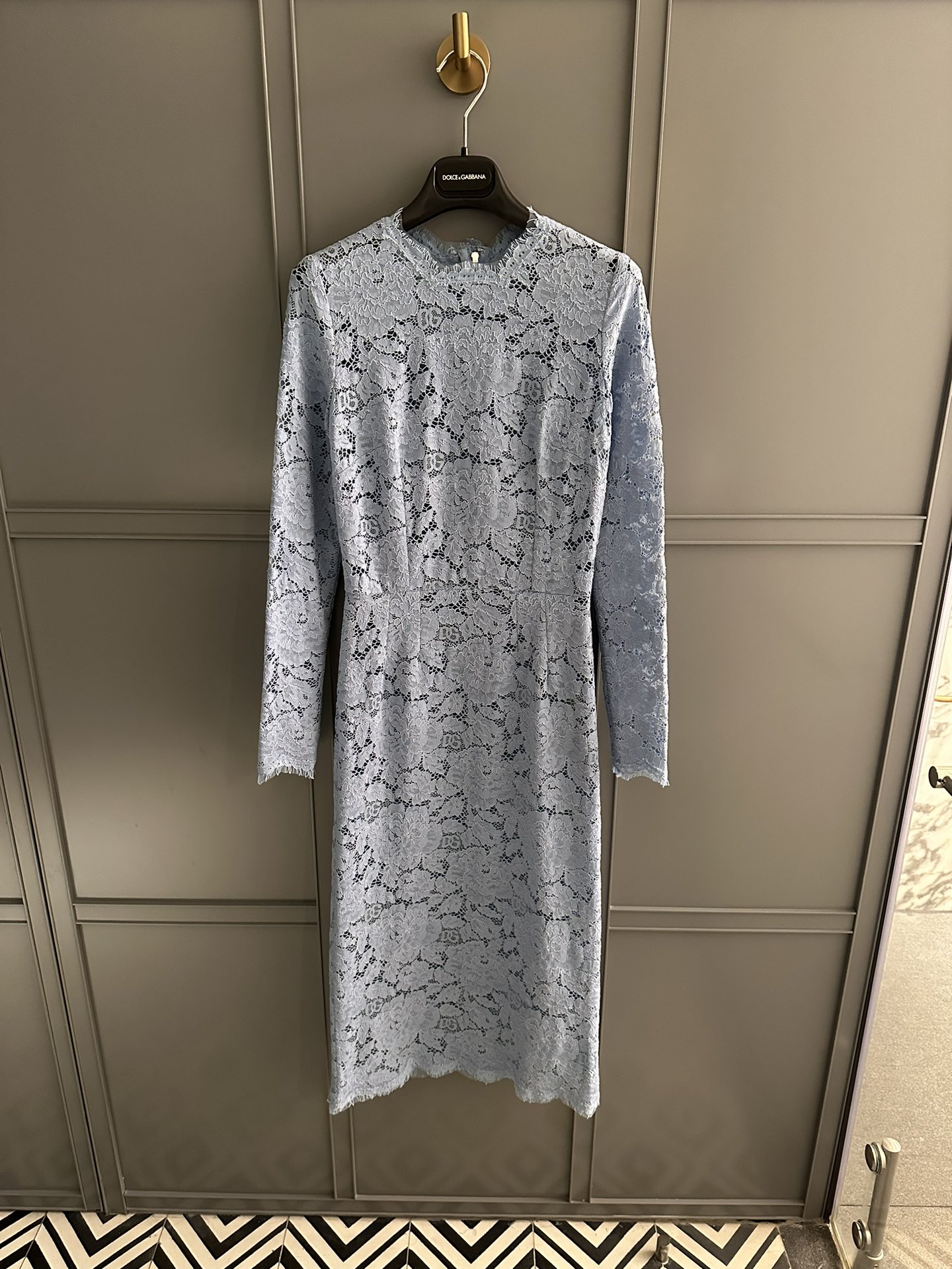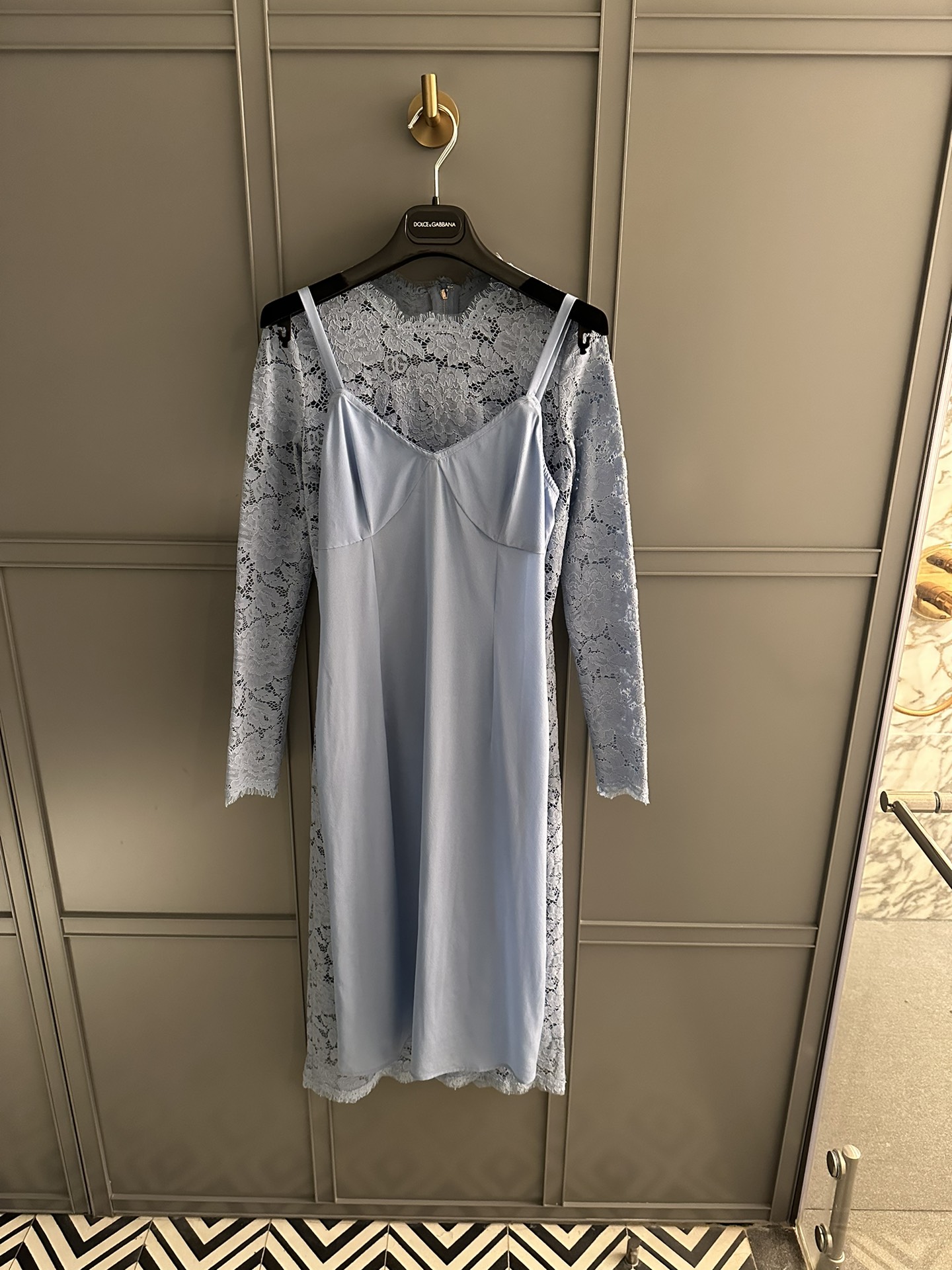 NIGO Dolce&Gabbana Women's Summer Blue Floral Lace Semi-sheer Round Neck Long Sleeve Dress Silk Camisole Lining #nigo75161
