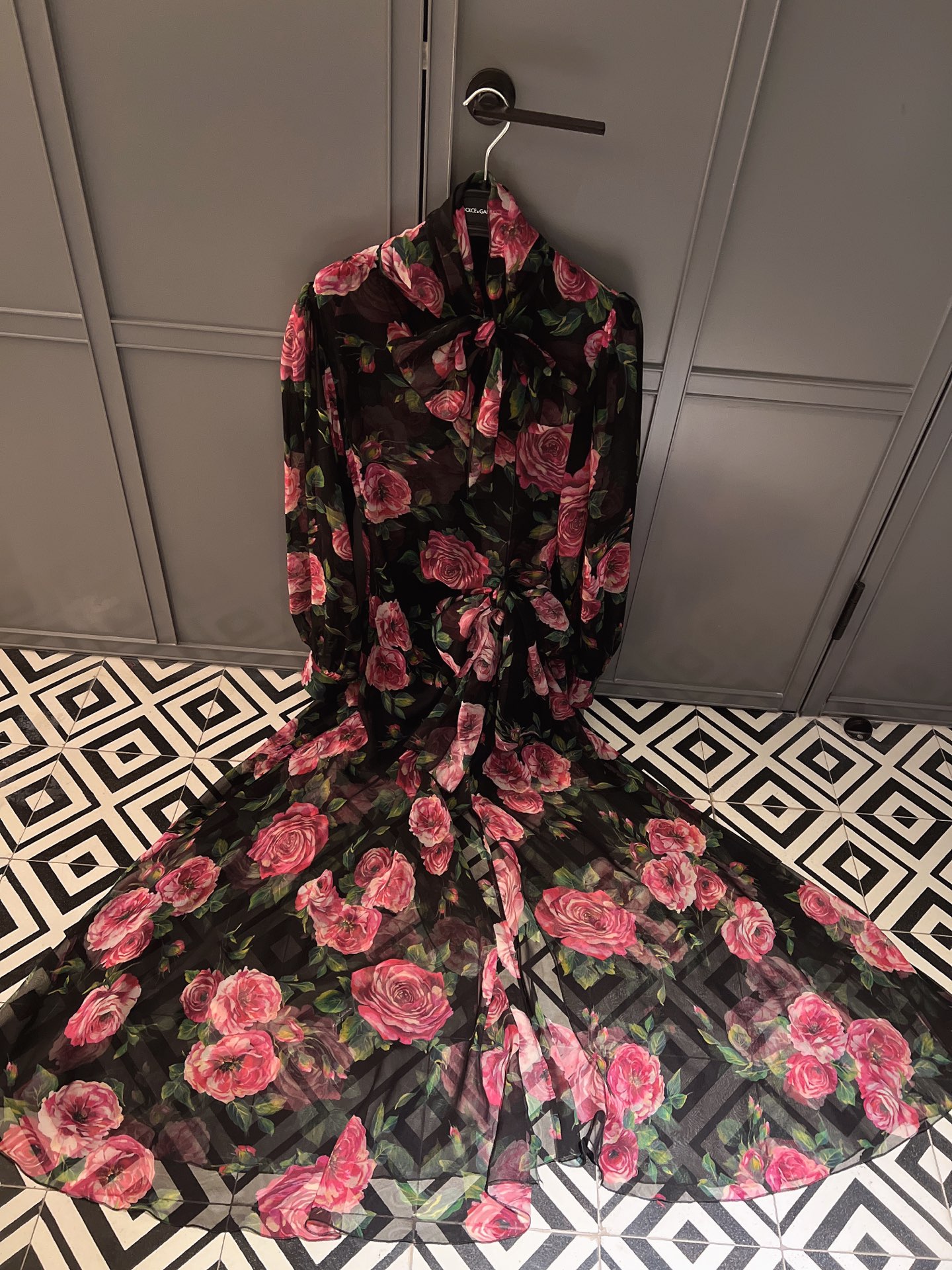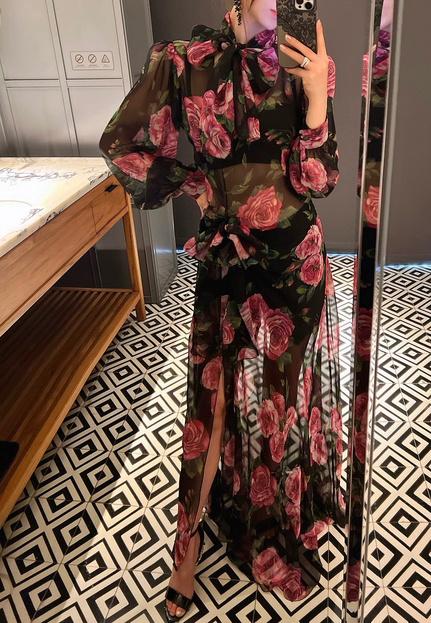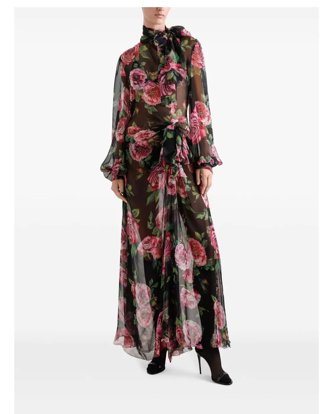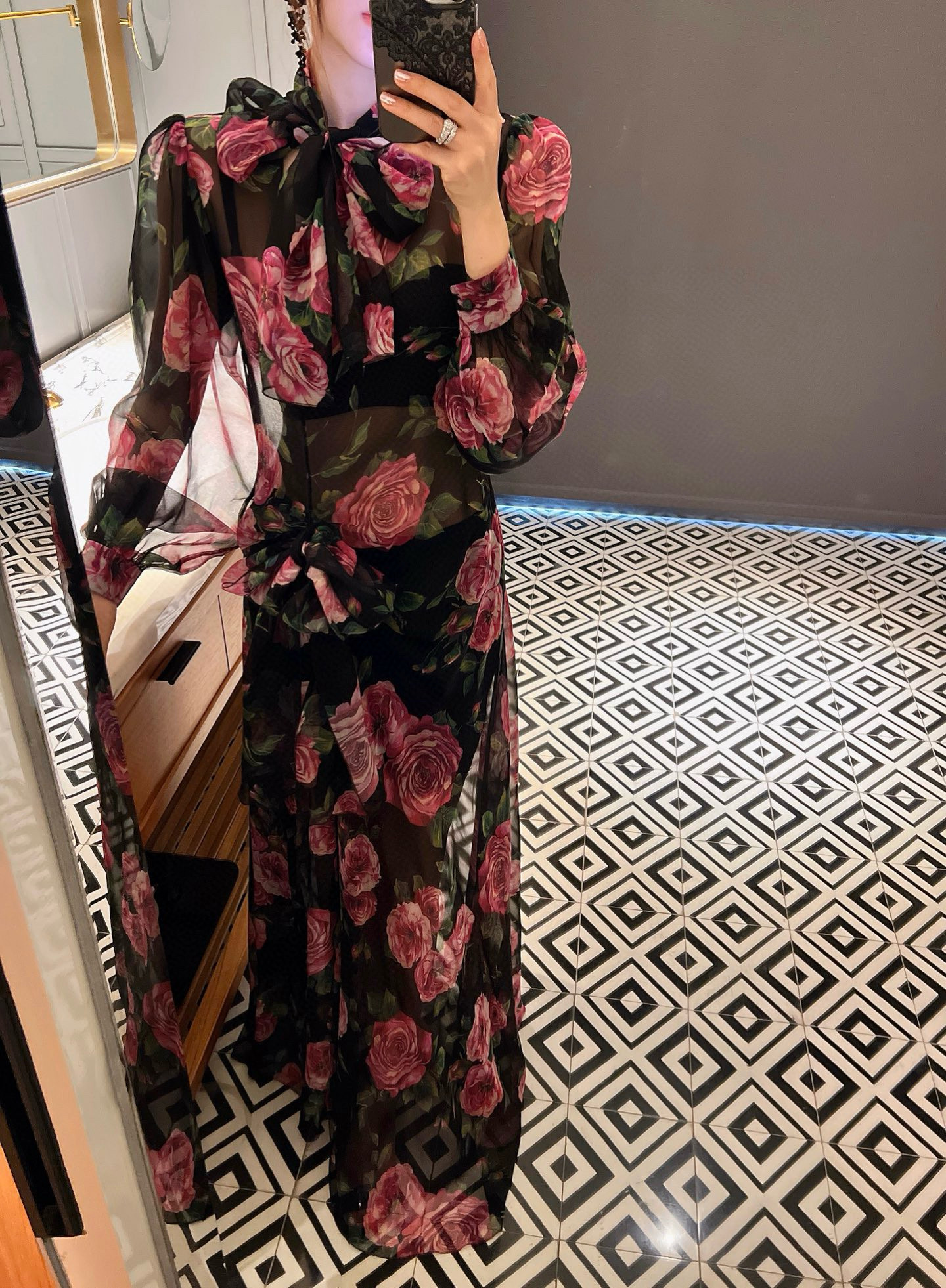 NIGO Dolce&Gabbana Women's Summer Floral Printed Half High Neck Tie Mid-Length Silk Long Sleeve Dresses Ngvp #nigo9996