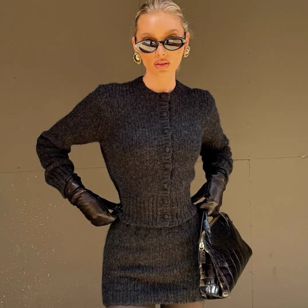 Home / Elsa / NIGO Helsa Women's Autumn And Winter Fashion Exquisite Suit Waisted Short Top Cardigan Hip Slim Daily Knit Skirt Black White Temperament Set Ngvp #nigo2475