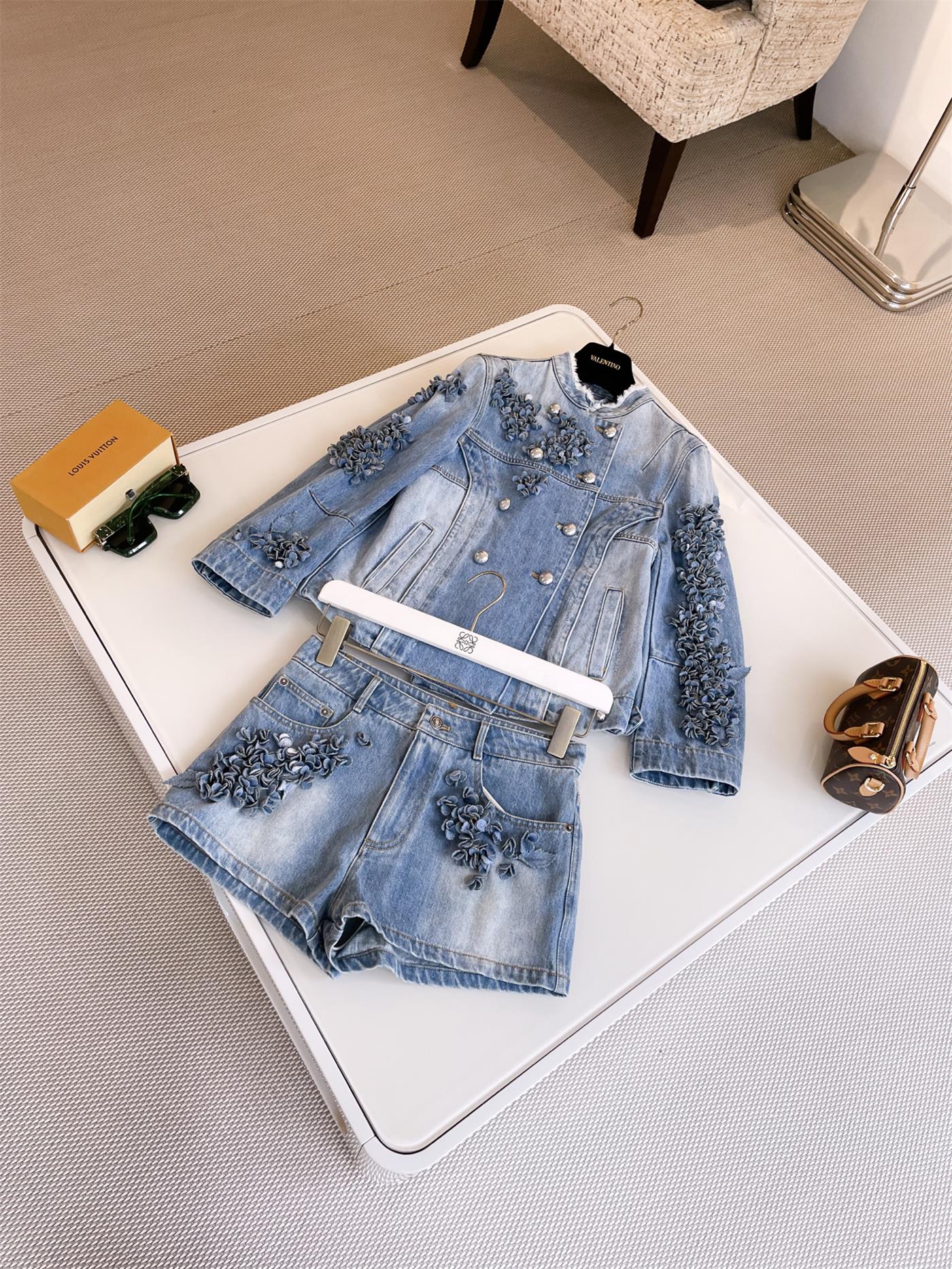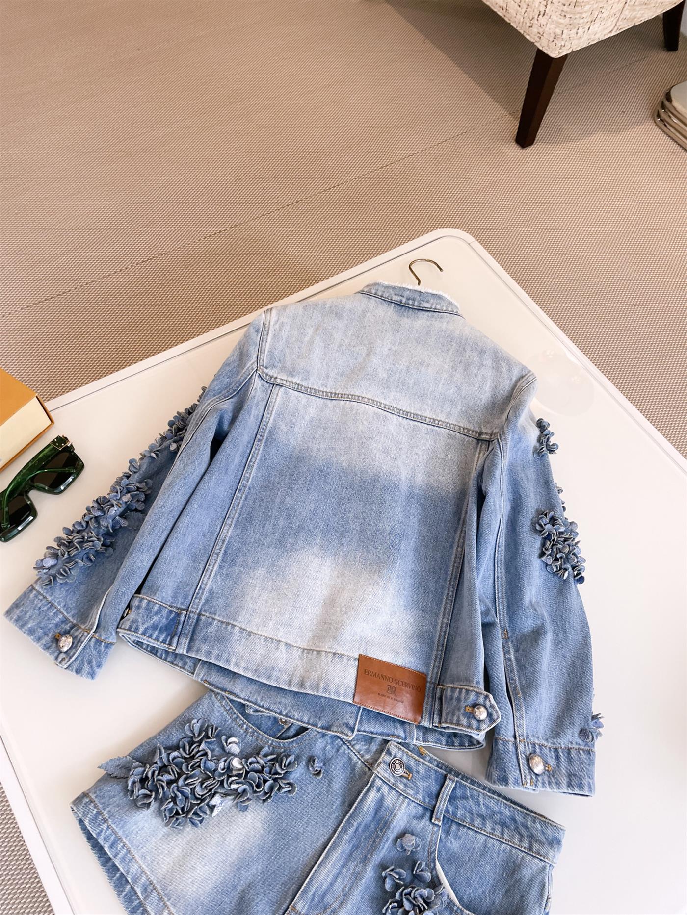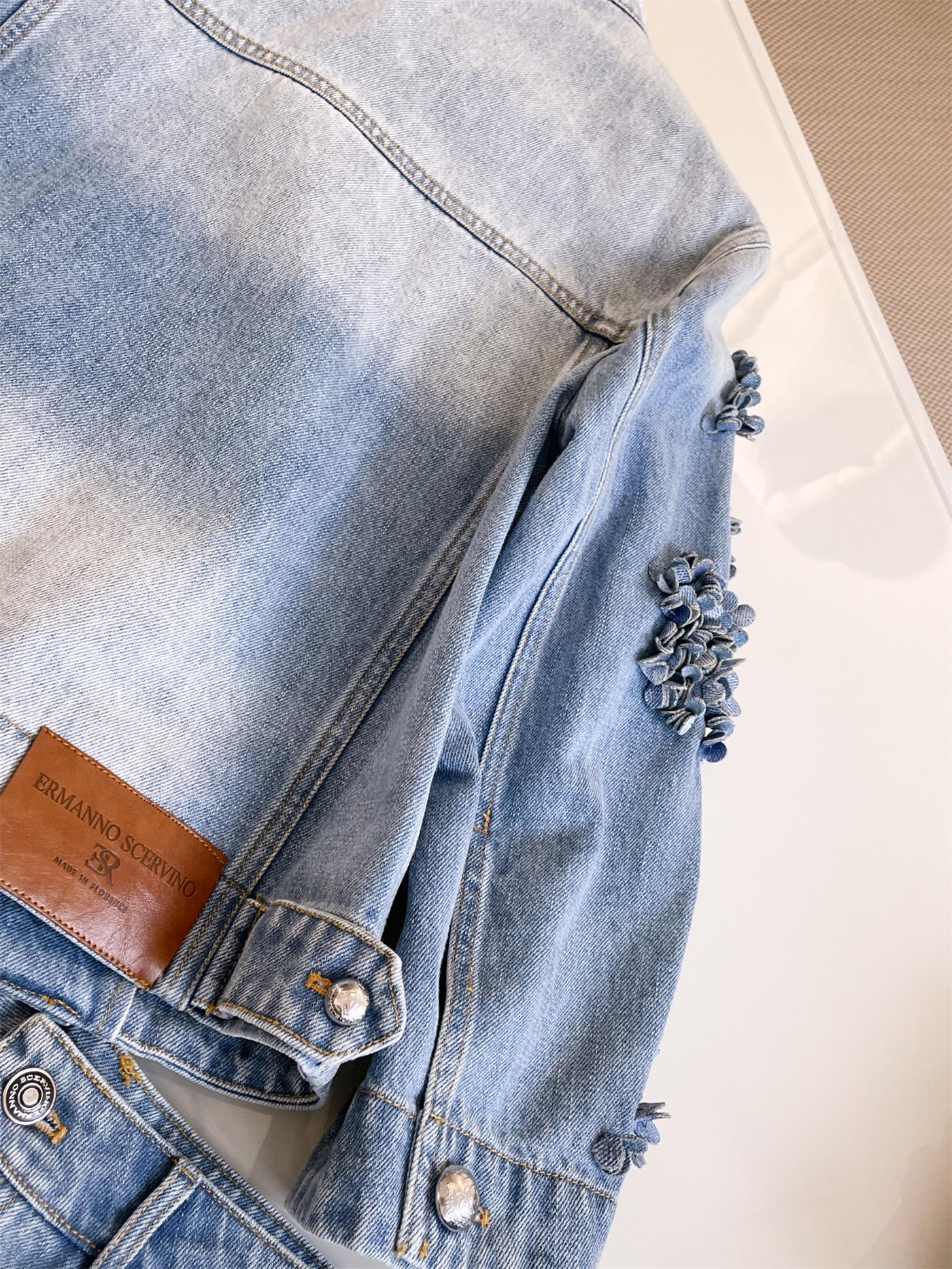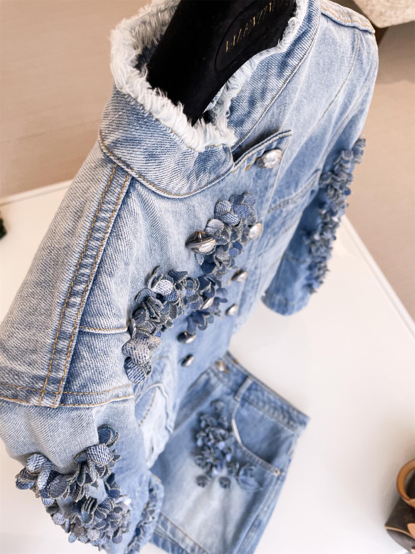 NIGO Ermanno Scervino Women's Spring and Autumn Blue Round Collar Double Breasted Long Sleeve Floral Applique Denim Jacket Jeans Shorts Set Suit #nigo75229