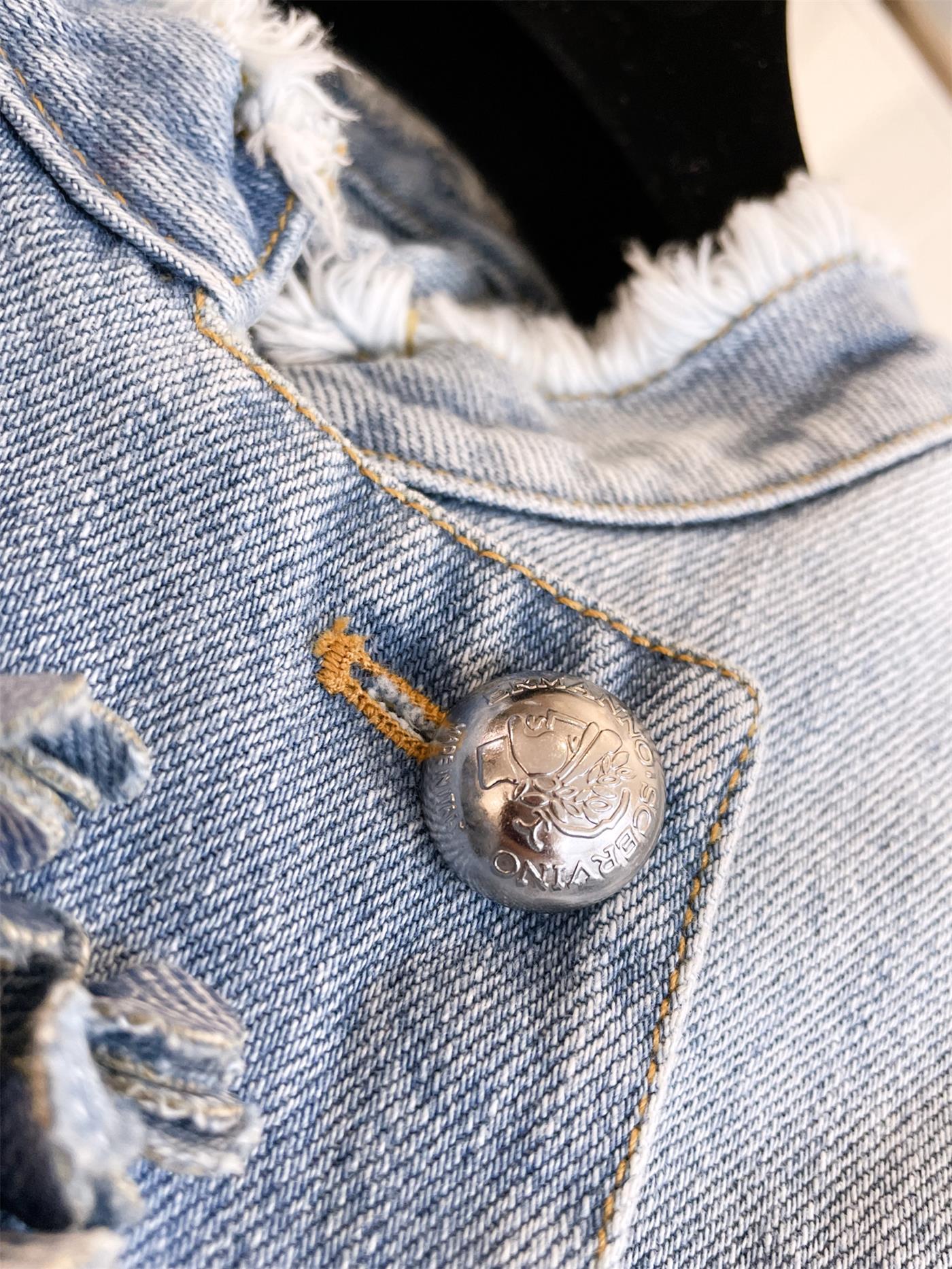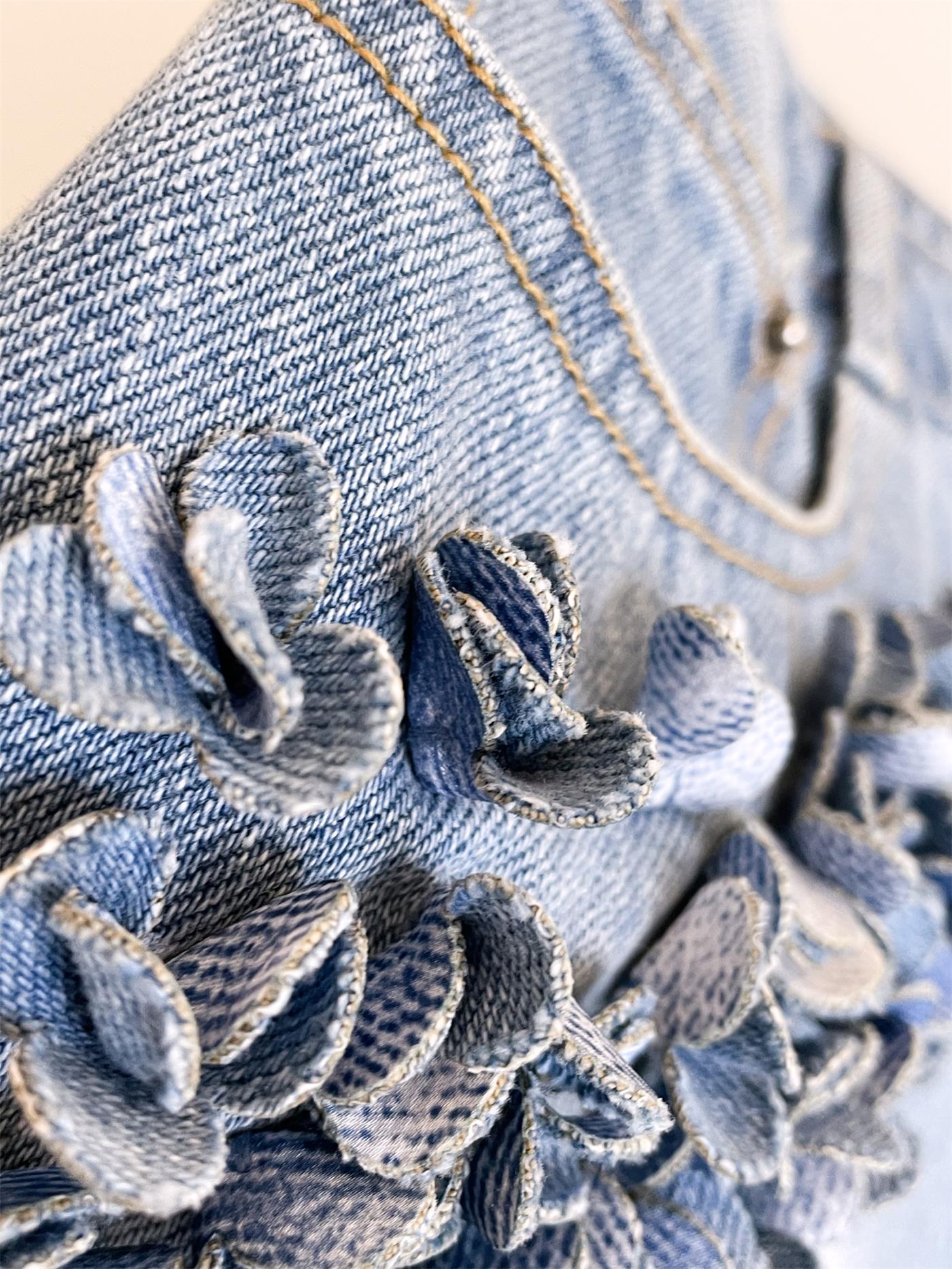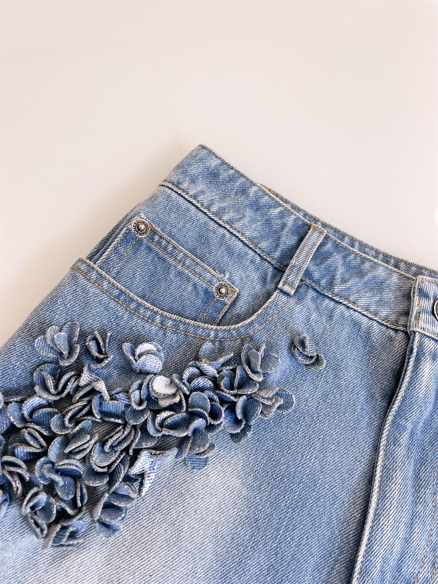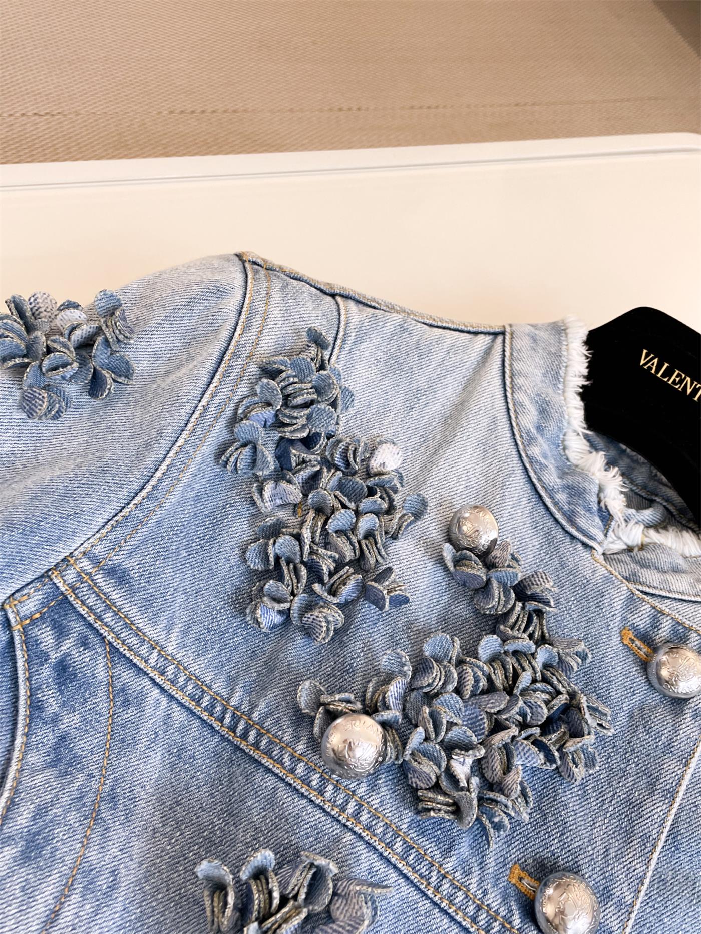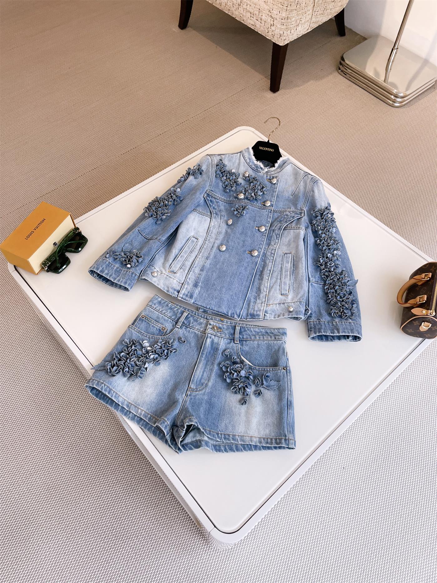 NIGO Ermanno Scervino Women's Spring and Autumn Blue Round Collar Double Breasted Long Sleeve Floral Applique Denim Jacket Jeans Shorts Set Suit #nigo75229