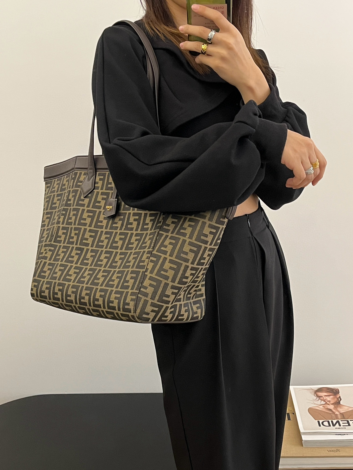 NIGO Fendi Origami Medium Handbag Brown FF Jacquard Fabric Handbag Women's Luxury Trend Clutch Temperament Fashion Bag Bags 8BS083AFPMF1GL7 #nigo81635