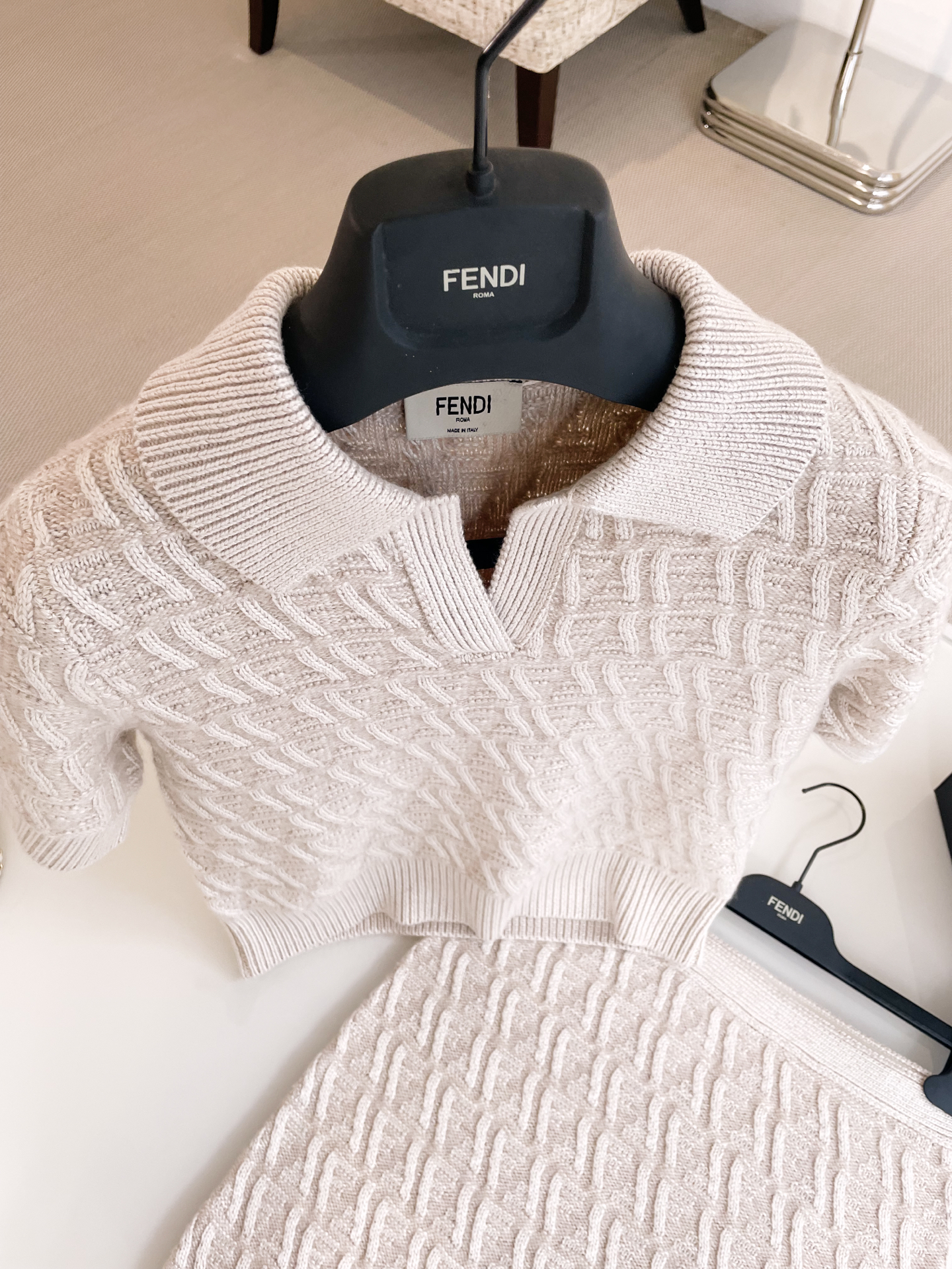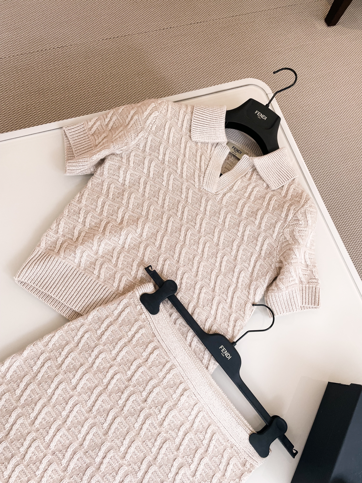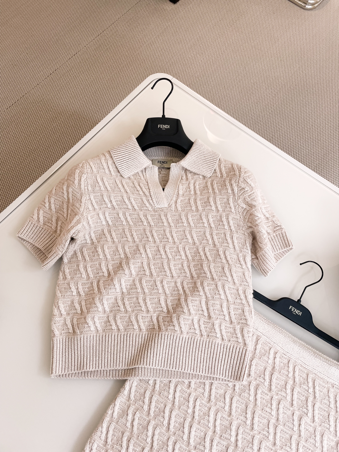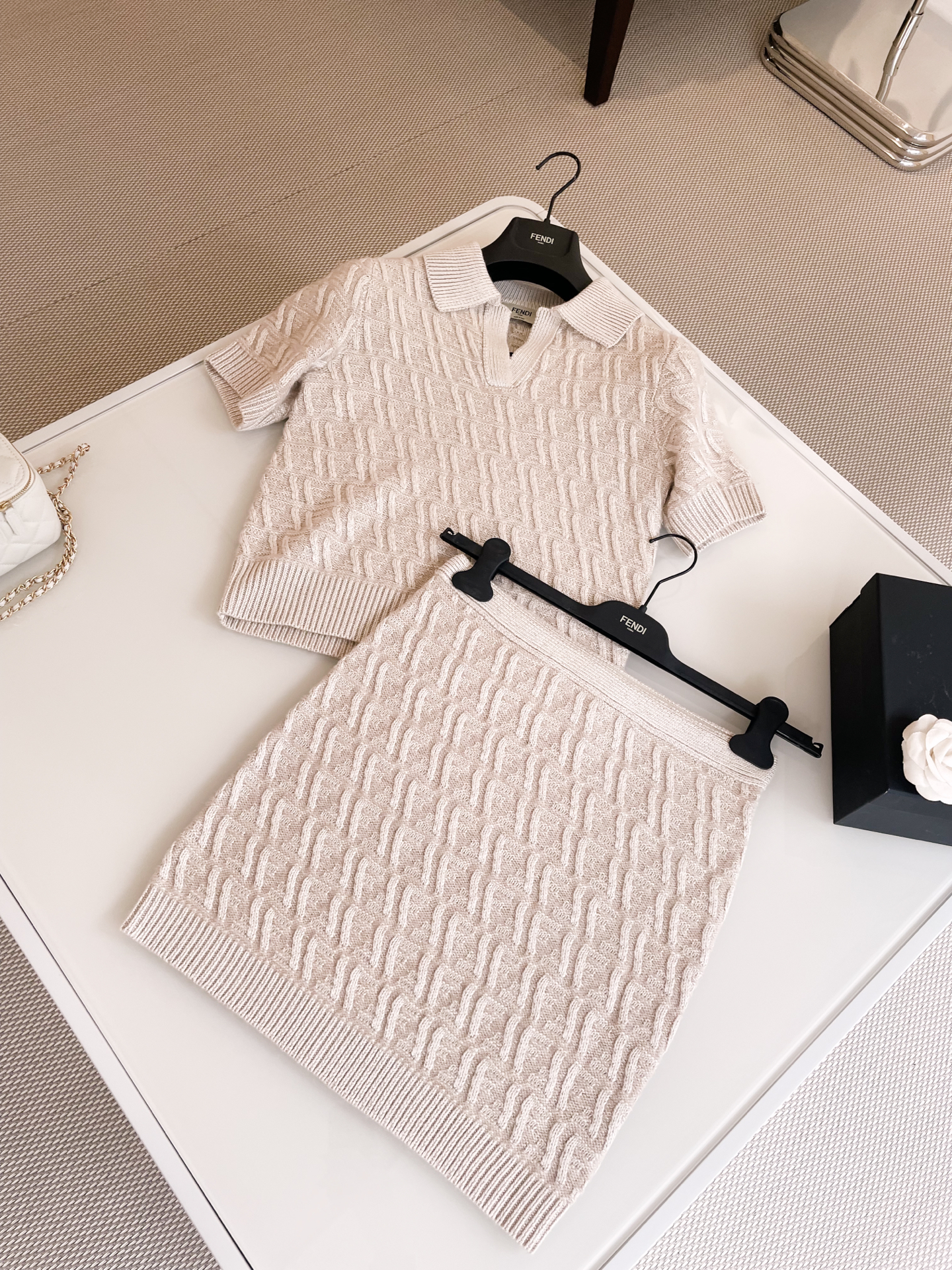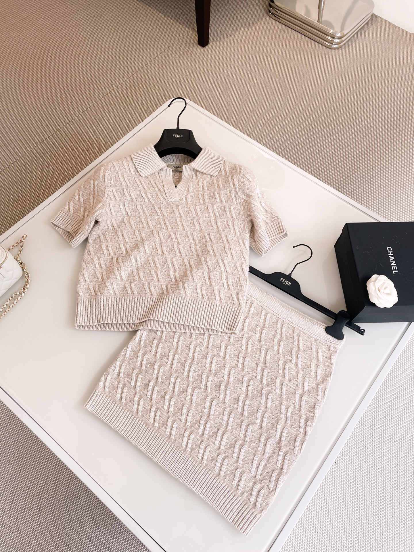 NIGO Fendi Women‘s Summer Solid Color Jacquard Ribbed V-Neck Short Sleeve Sweater Top Casual Short Skirt Set Suit #nigo74982