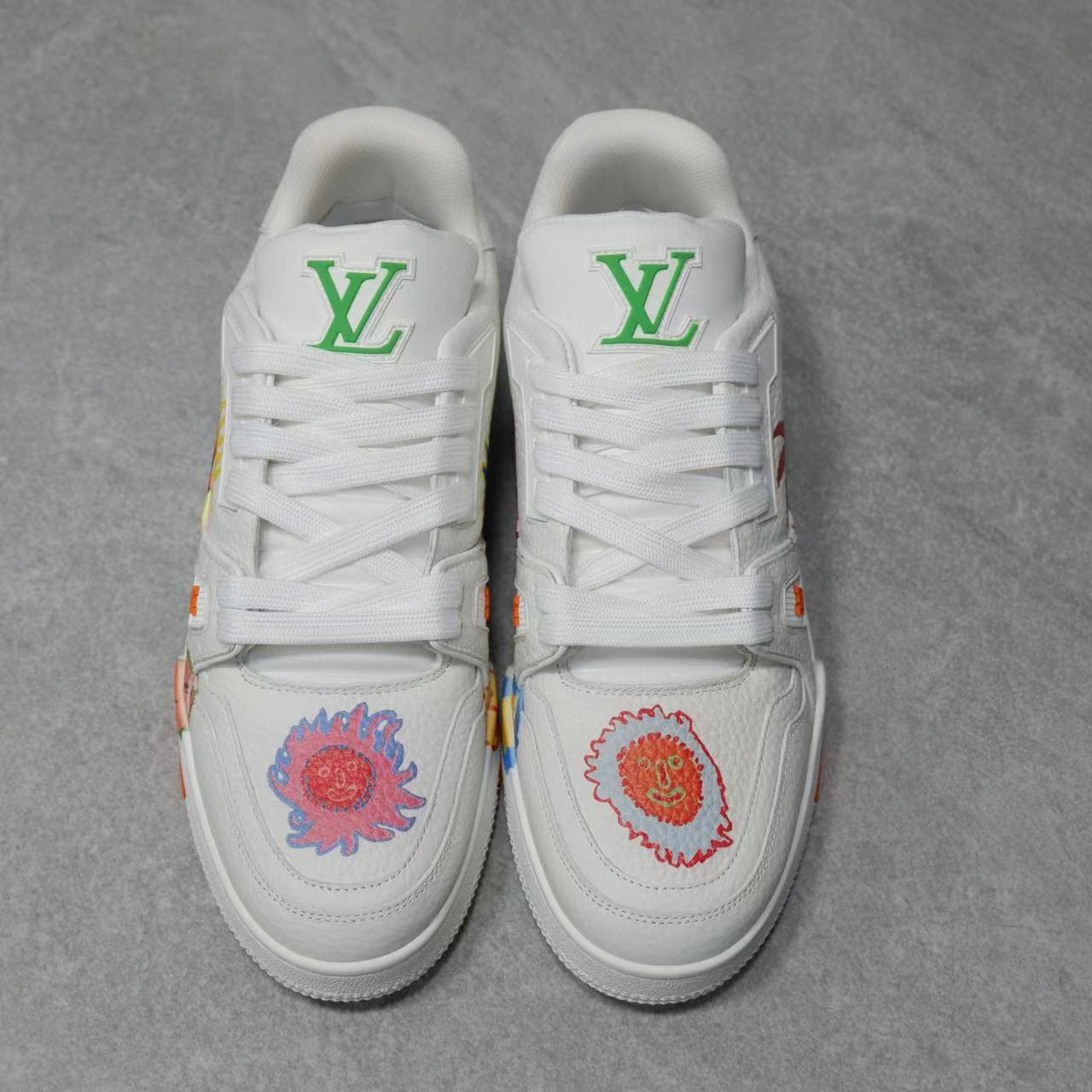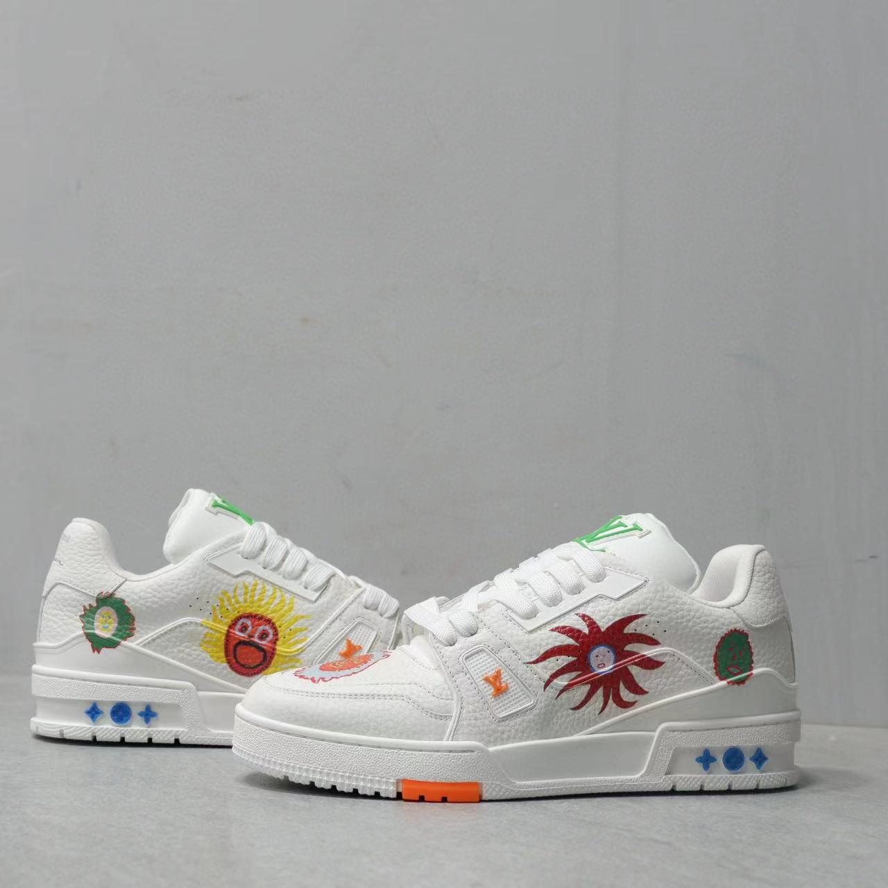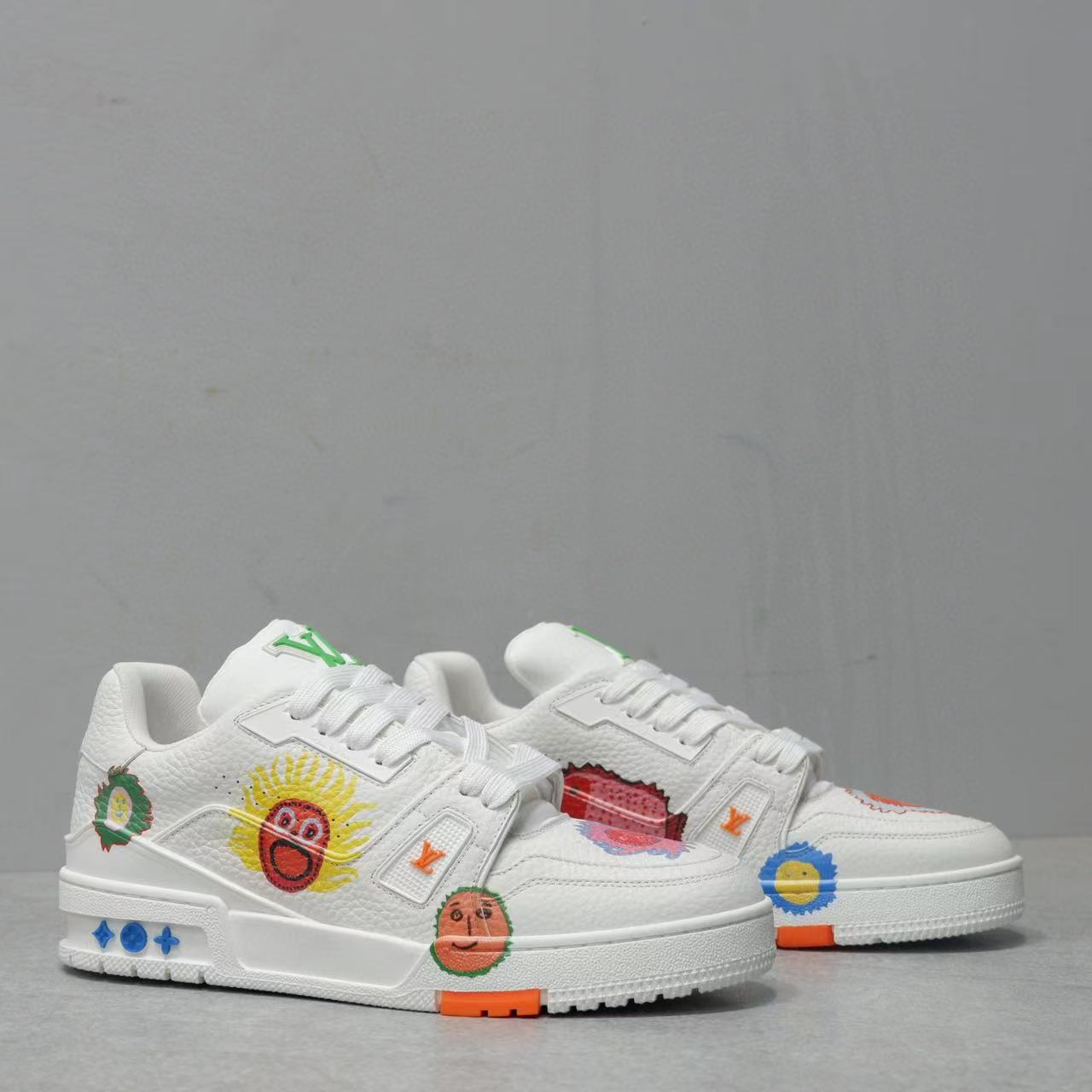 NIGO Louis Vuitton Trainer Men's Women's Graffiti Pattern White Leather Lace Up Low Top Board Shoes Sneakers #nigo98454