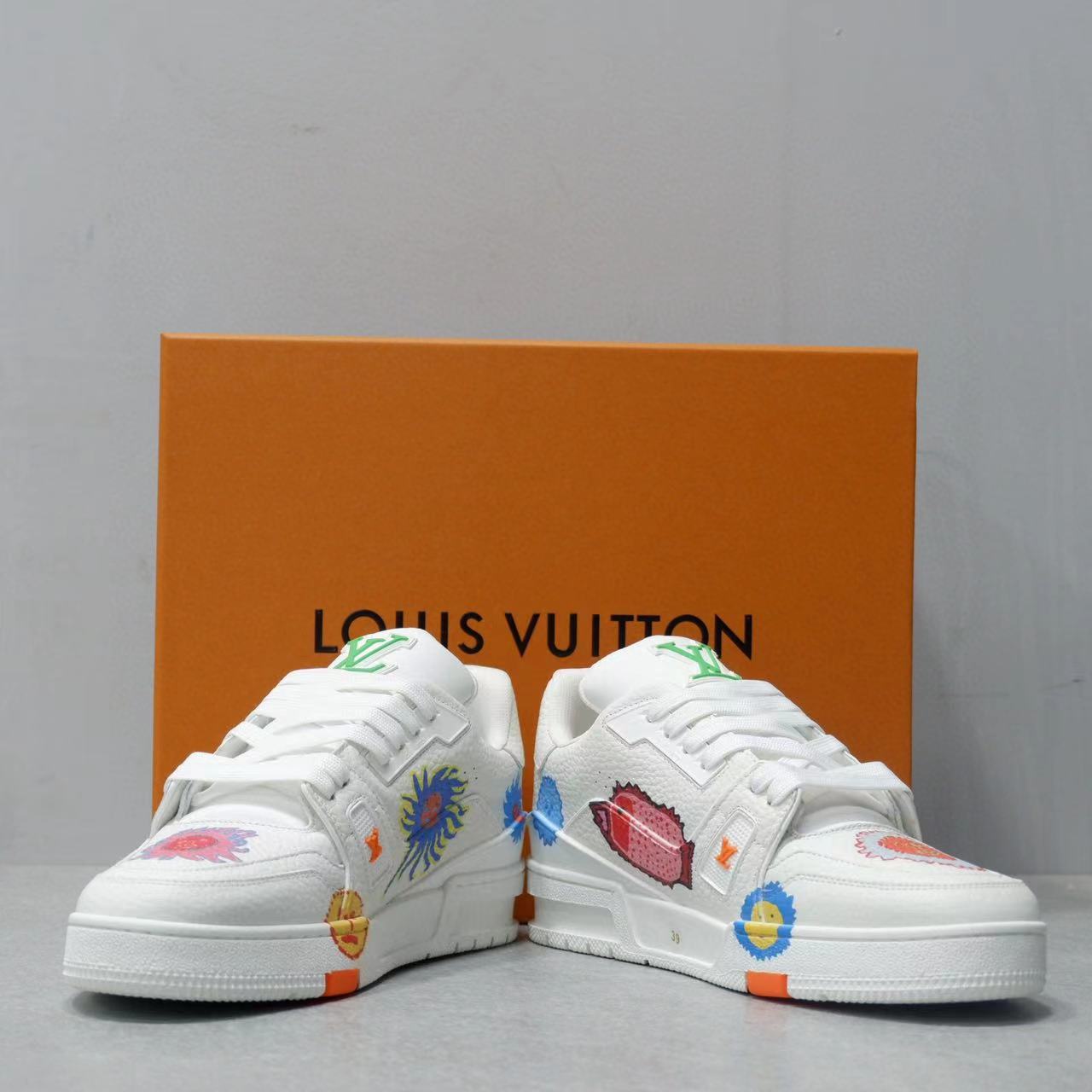 NIGO Louis Vuitton Trainer Men's Women's Graffiti Pattern White Leather Lace Up Low Top Board Shoes Sneakers #nigo98454