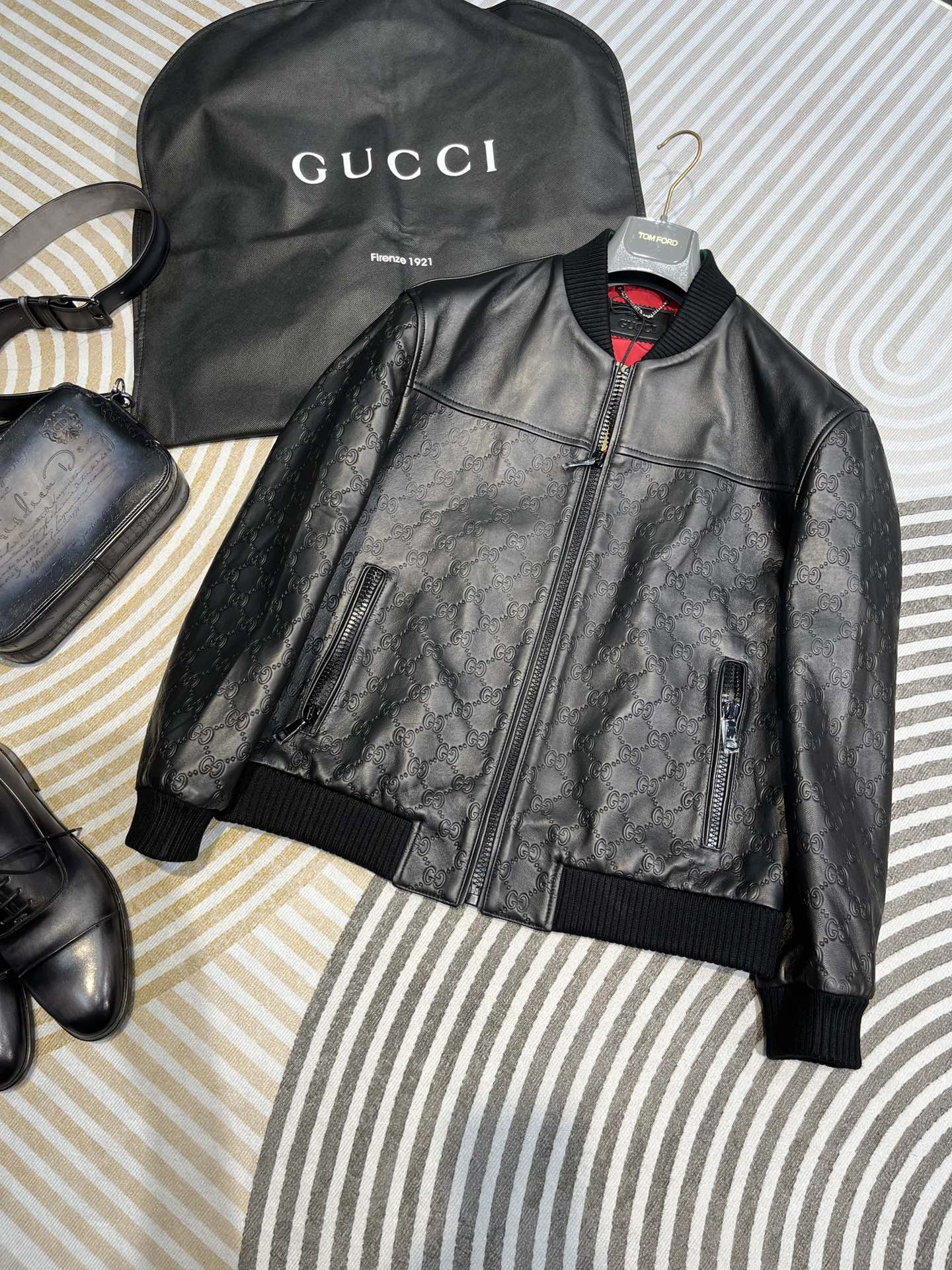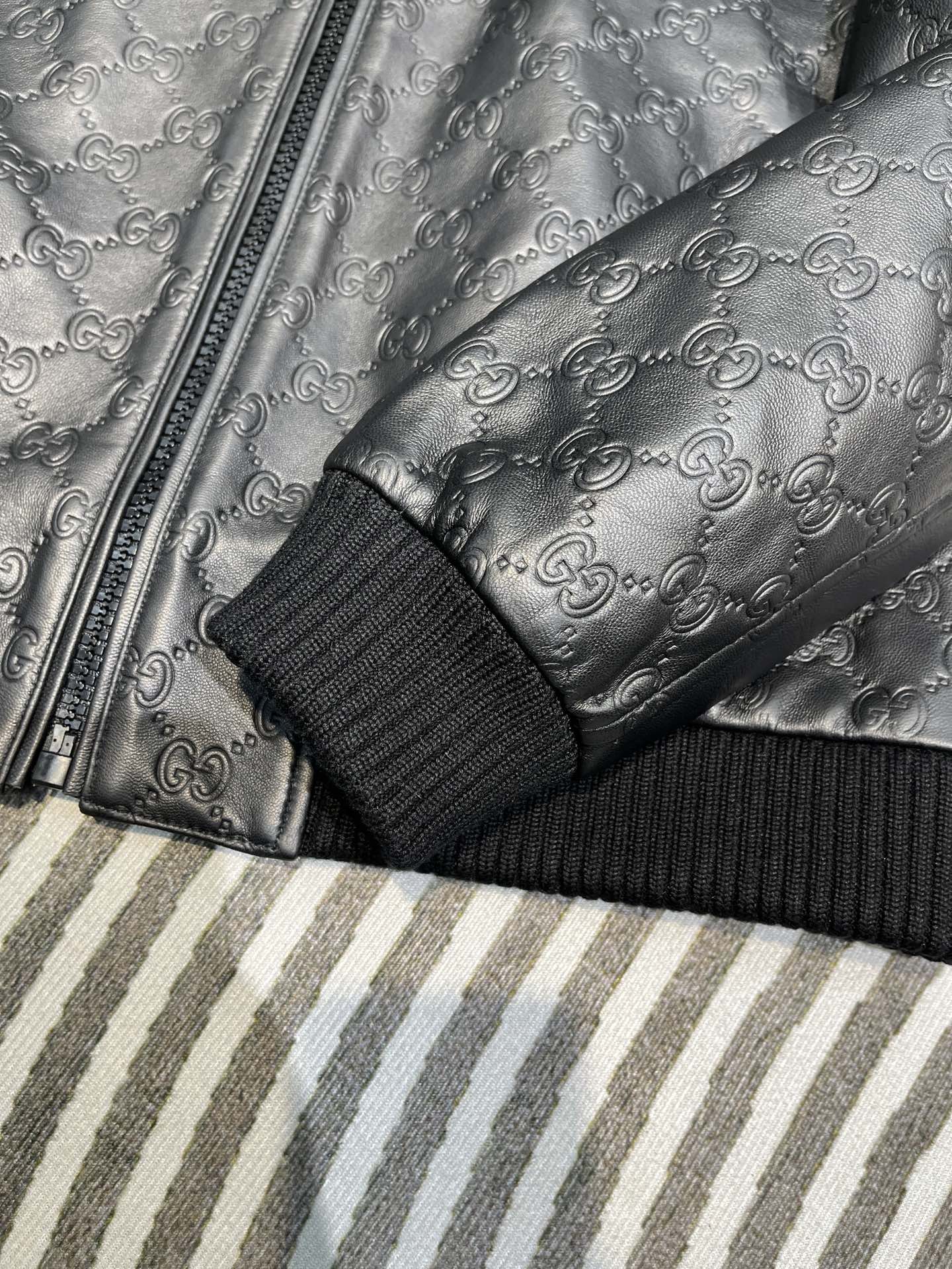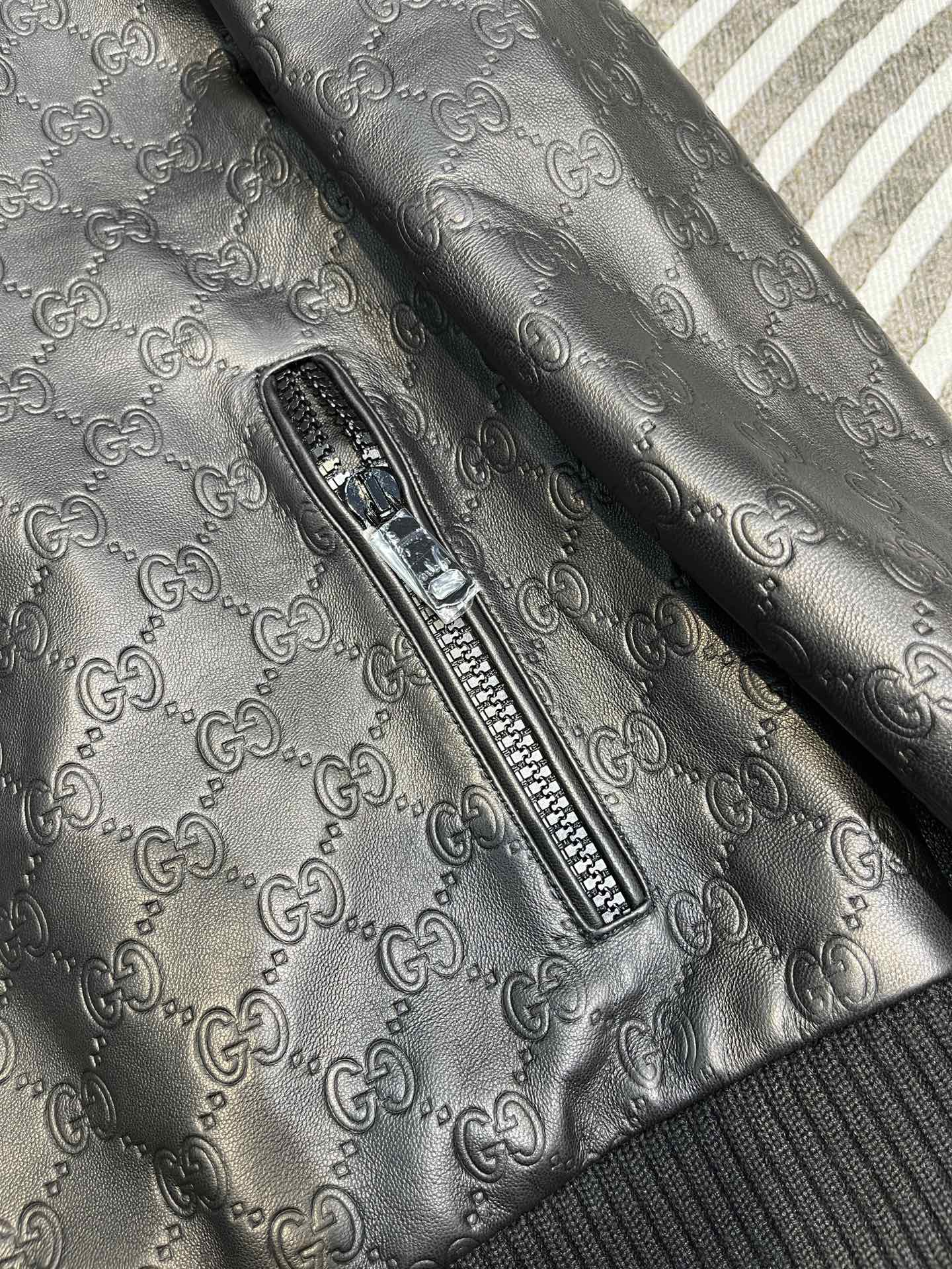 NIGO Gucci Men's Spring And Autumn Black Embossed Logo Printed Zipper Leather Baseball Jersey Long Sleeve Jacket #nigo72616