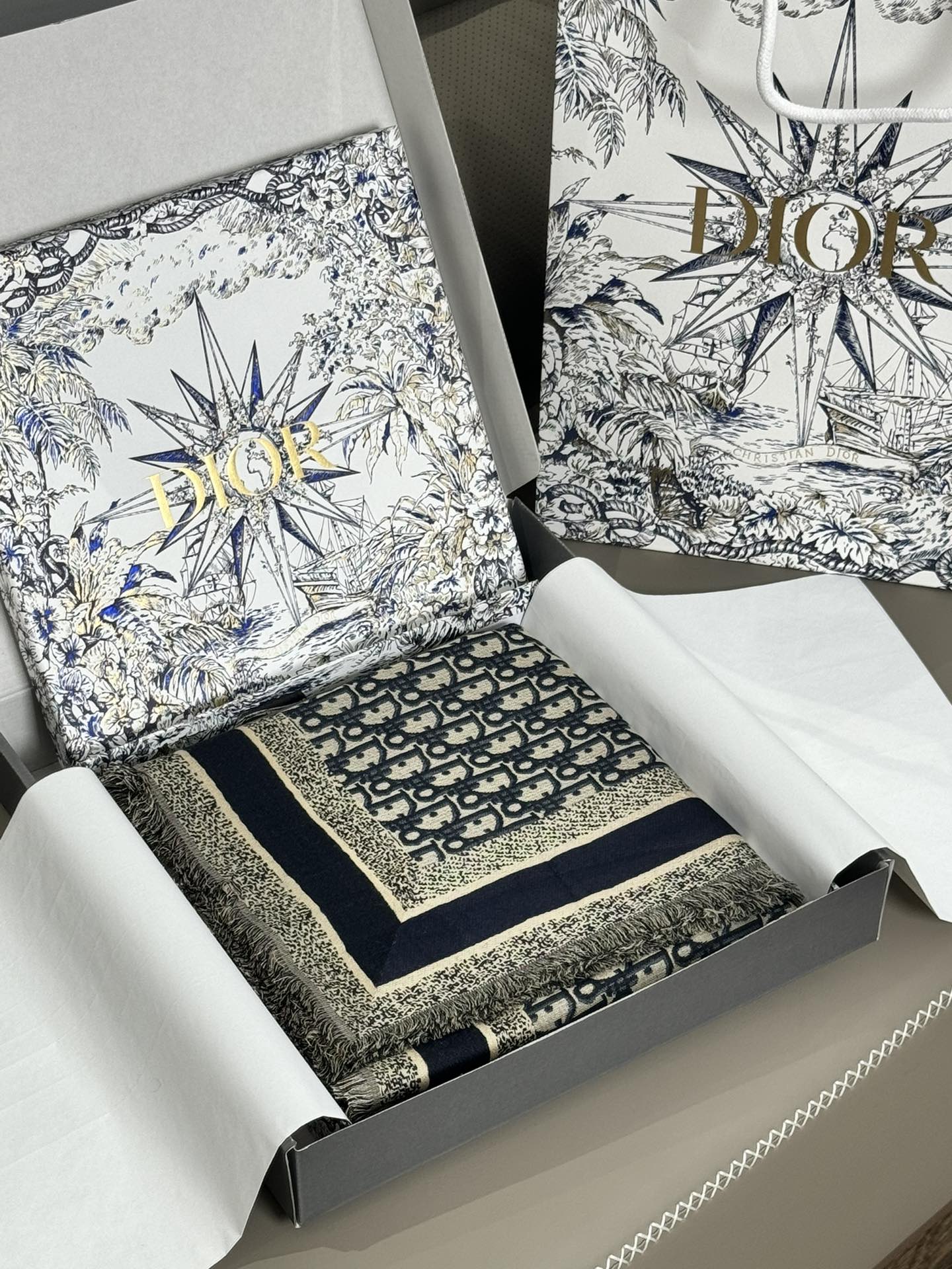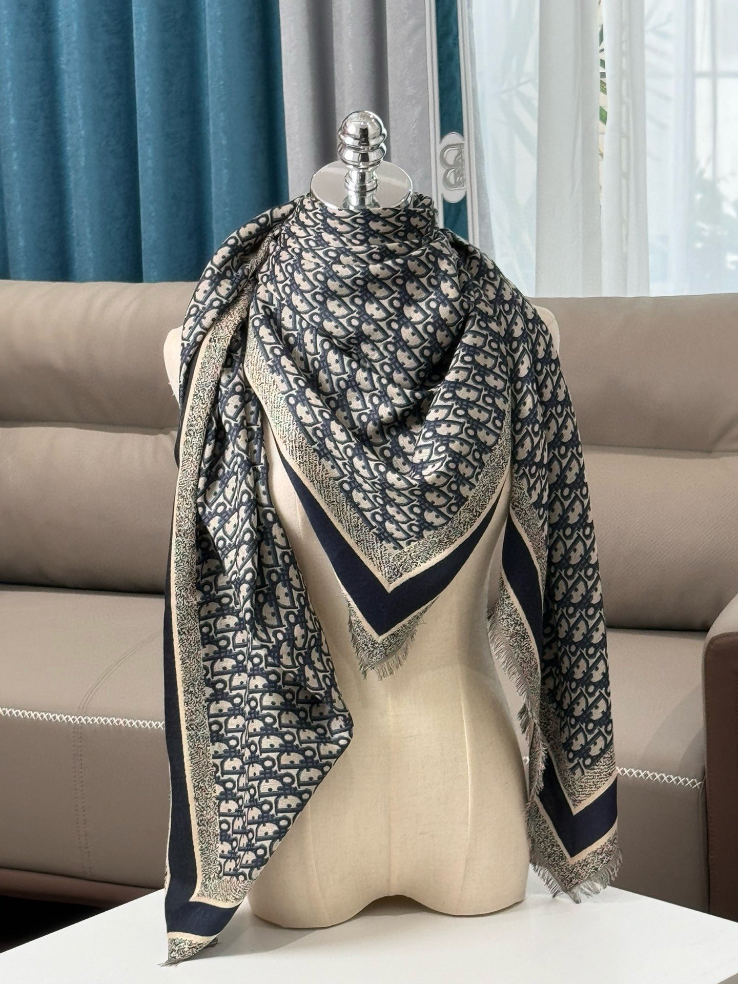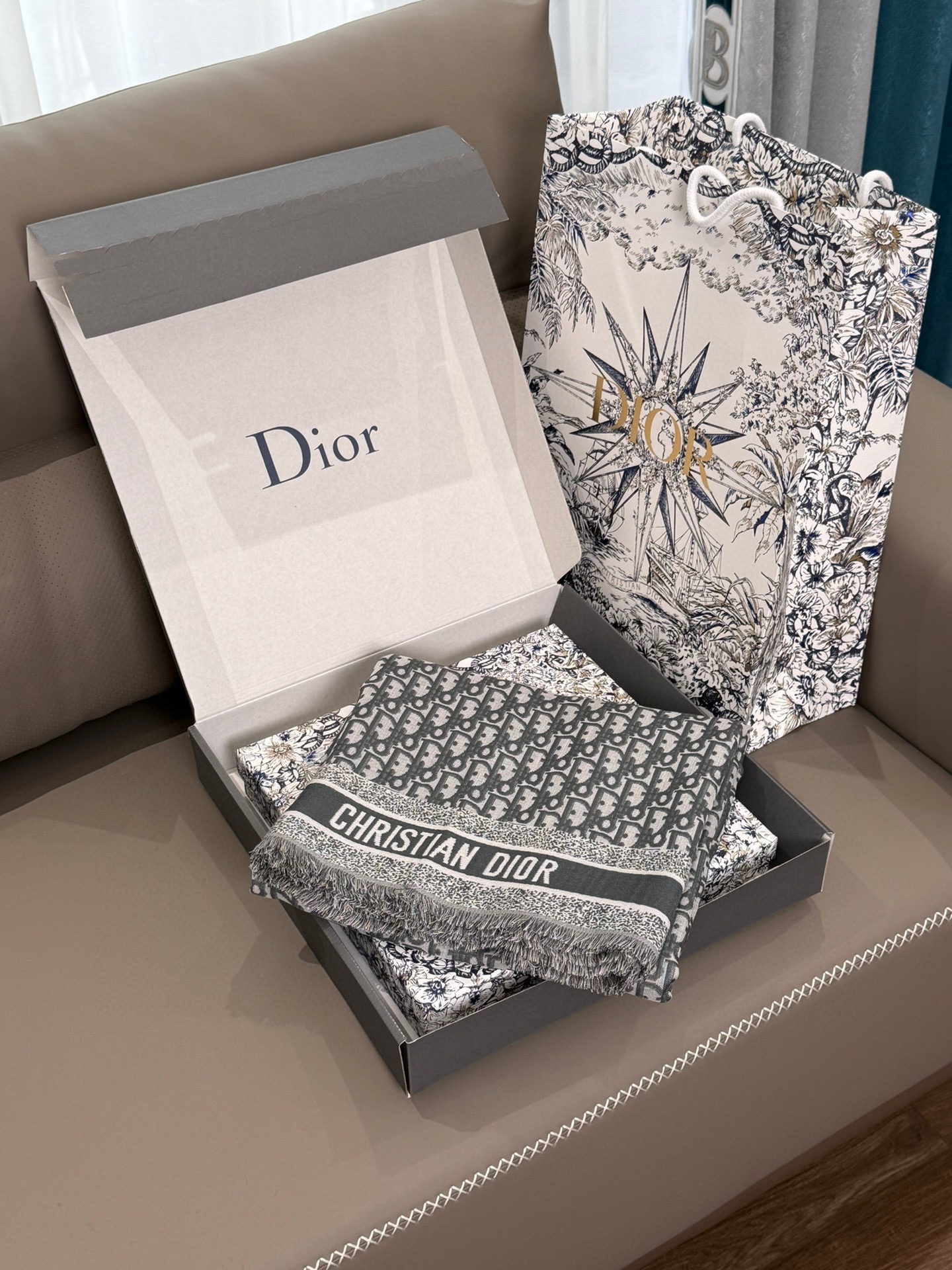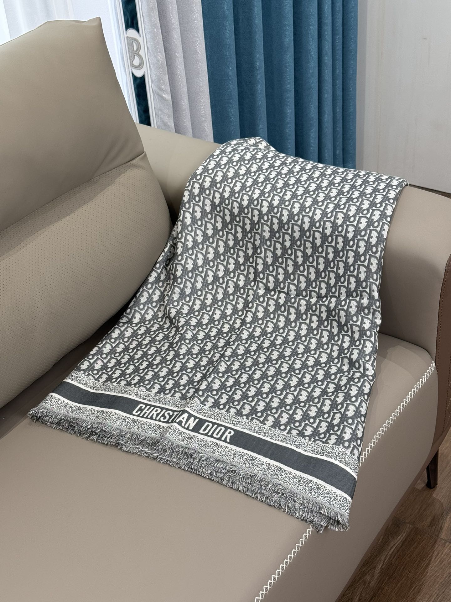 NIGO Dior Women's Gray Monogrammed Wool, Mulberry Silk & Cotton Blend Shawl Scarf #nigo72748