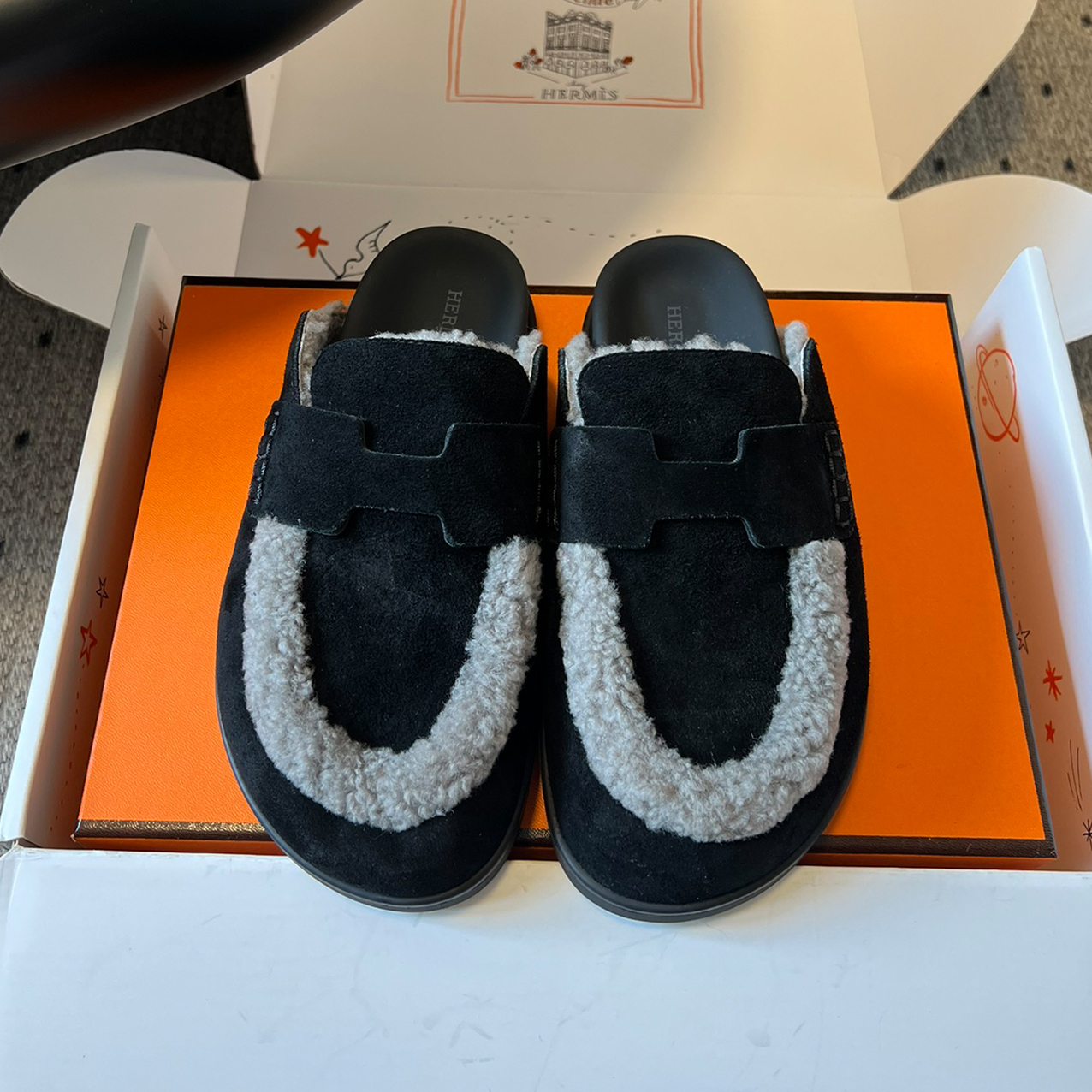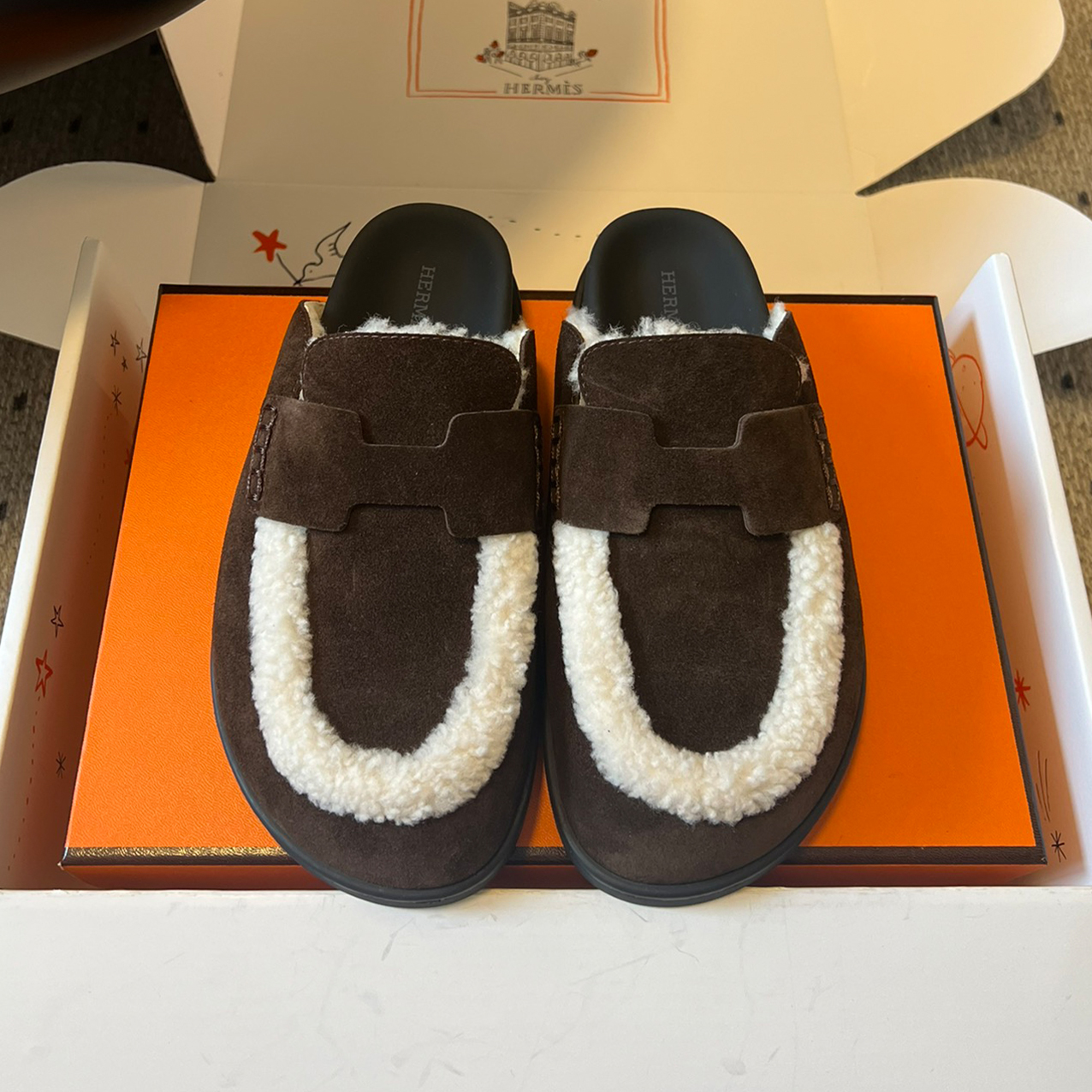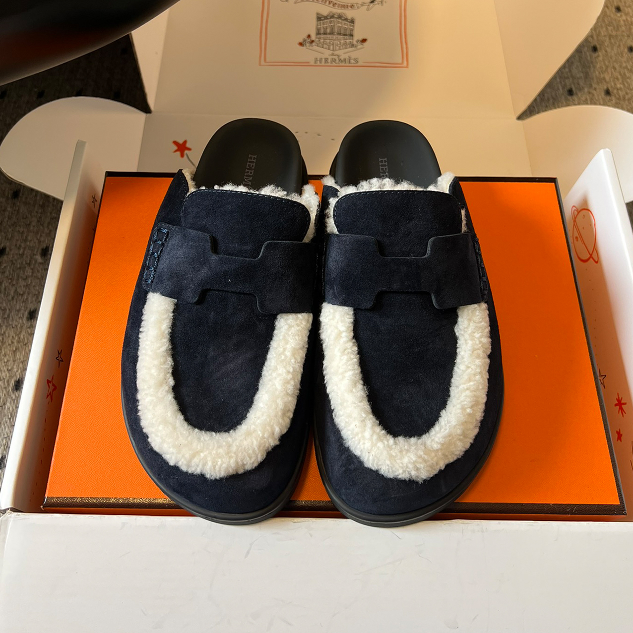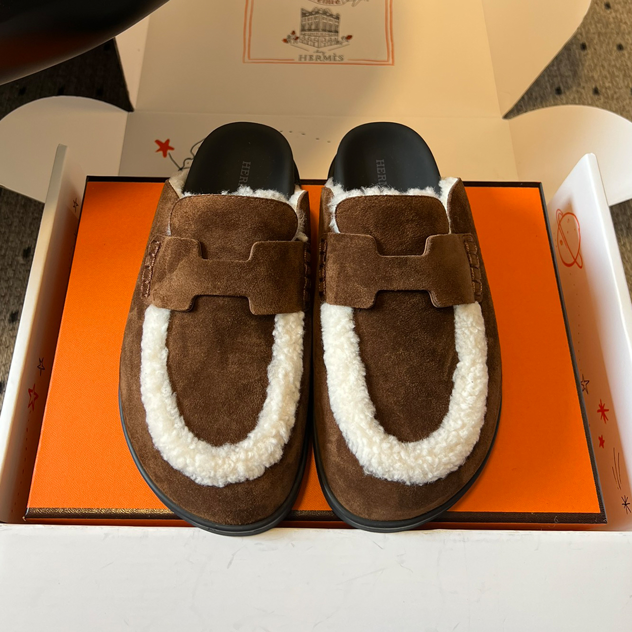 NIGO Hermes Men's And Women's Winter Boken Shoes Round Toe Flat Heel Slippers Solid Color Suede Mule Go Shoes #nigo81519