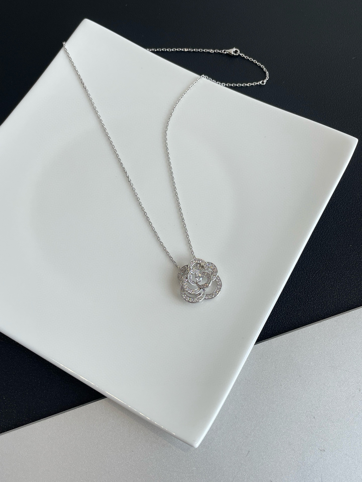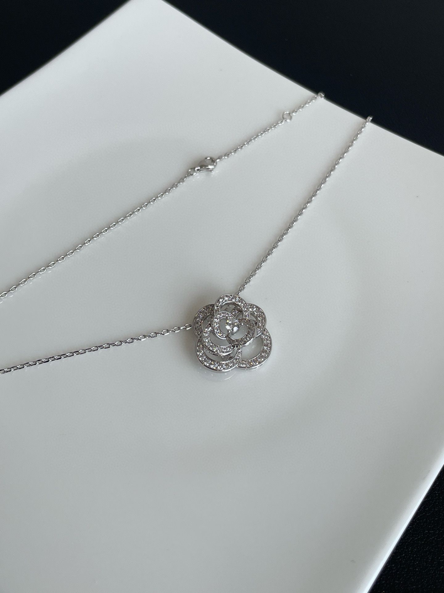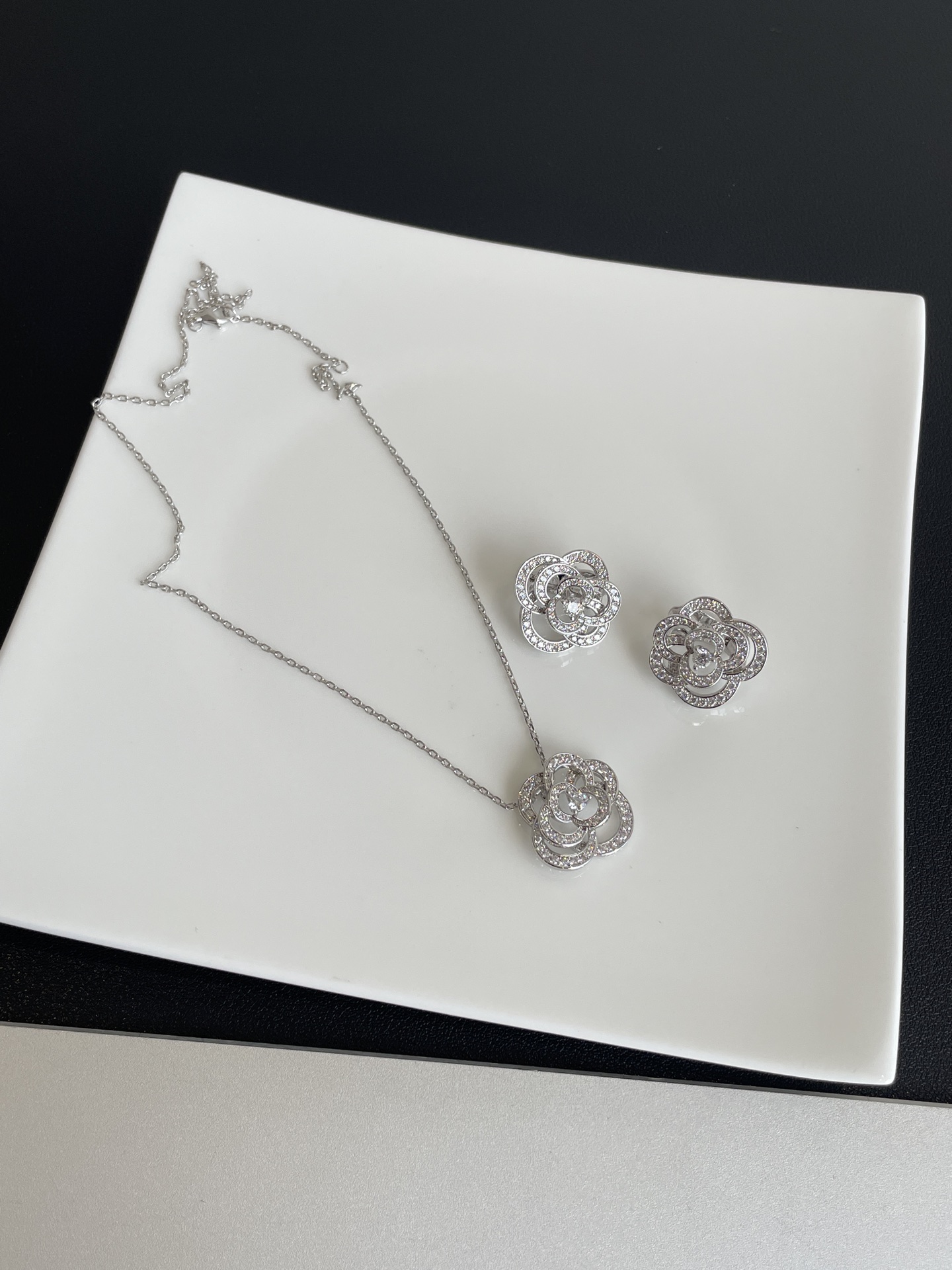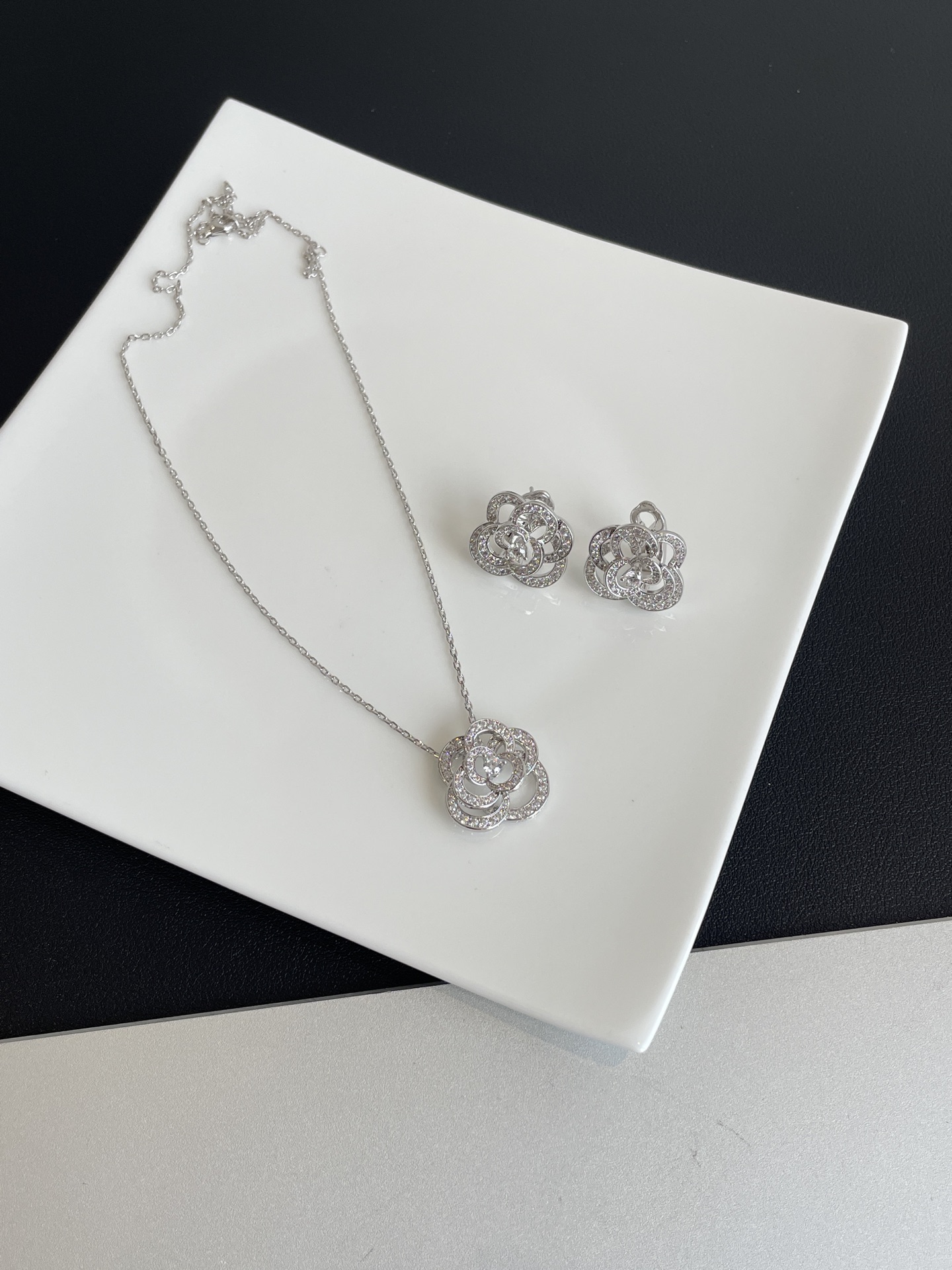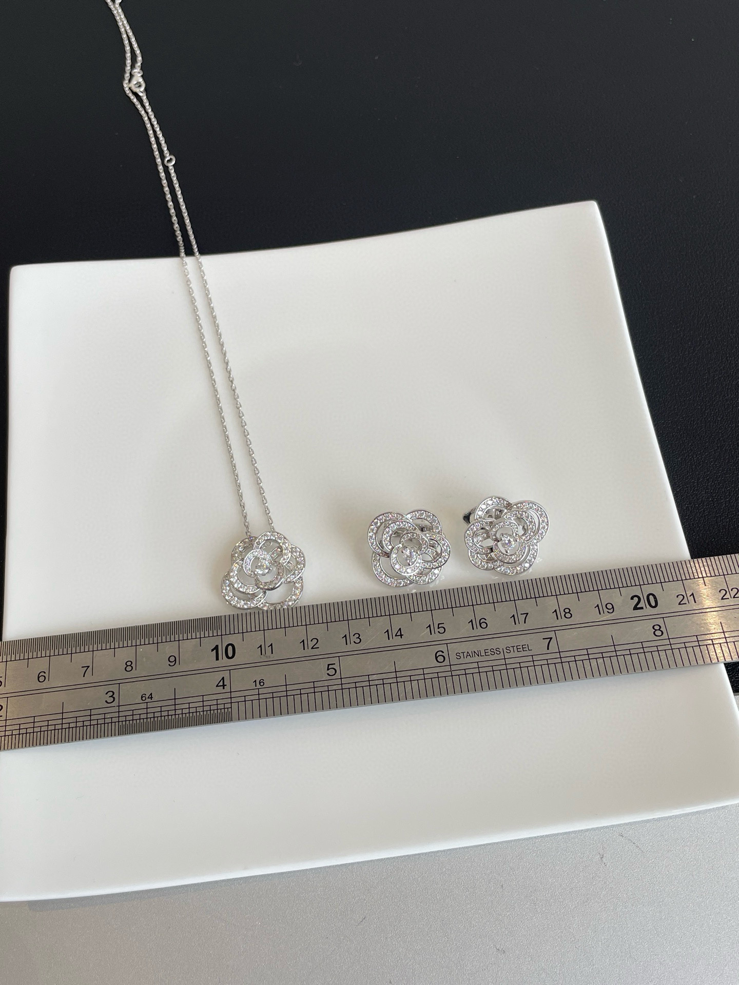 NIGO Chanel FIL DE CAMÉLIA Women's Silver Diamond-Studded Openwork Floral Design Necklace and Earrings Jewellery Accessories #nigo76967