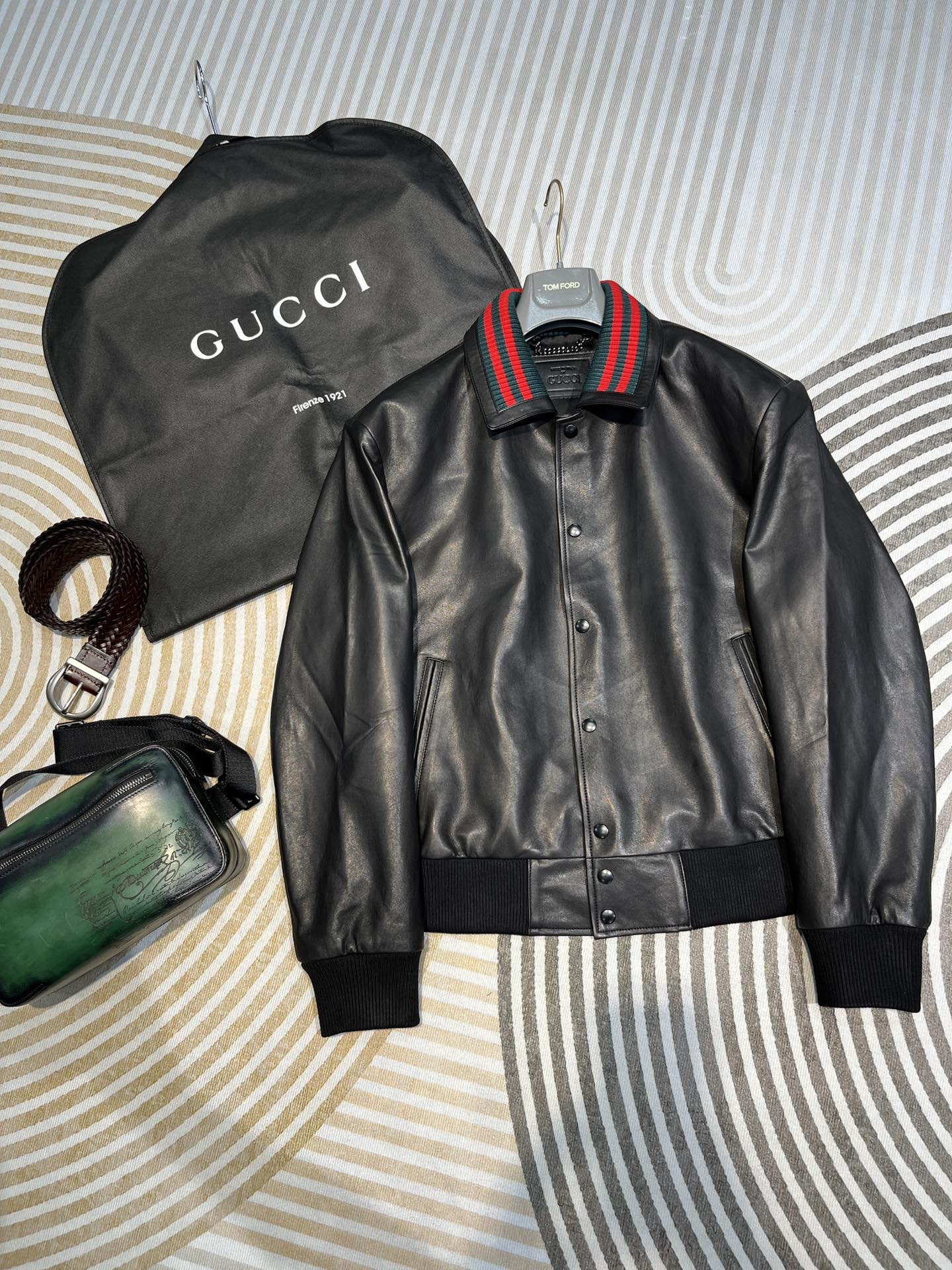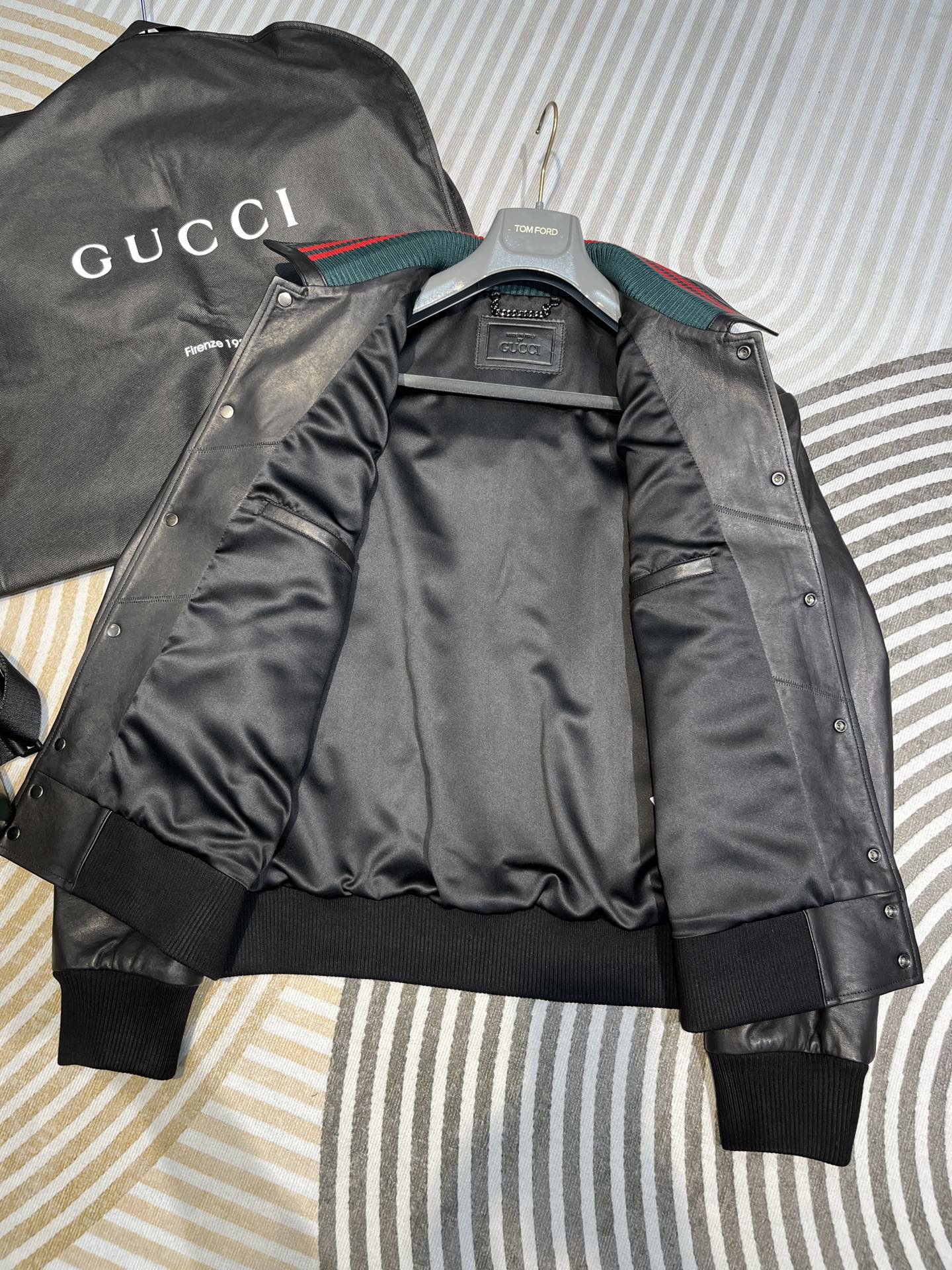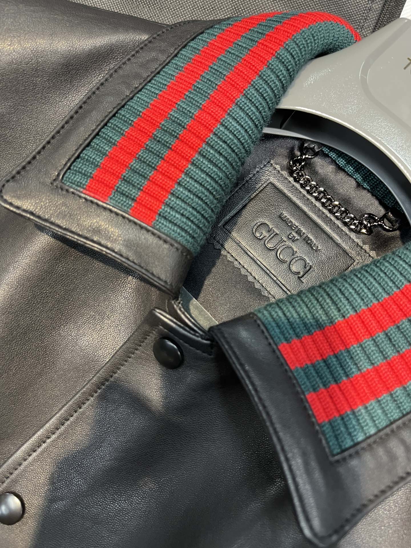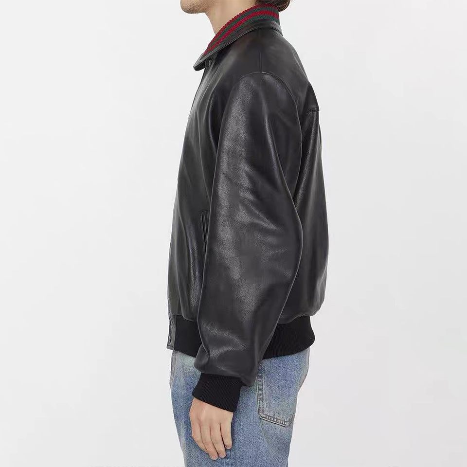 NIGO Gucci Men's Fall/Winter Striped Lapel Single Breasted Fitted Long Sleeve Black Leather Jacket Coat #nigo99964