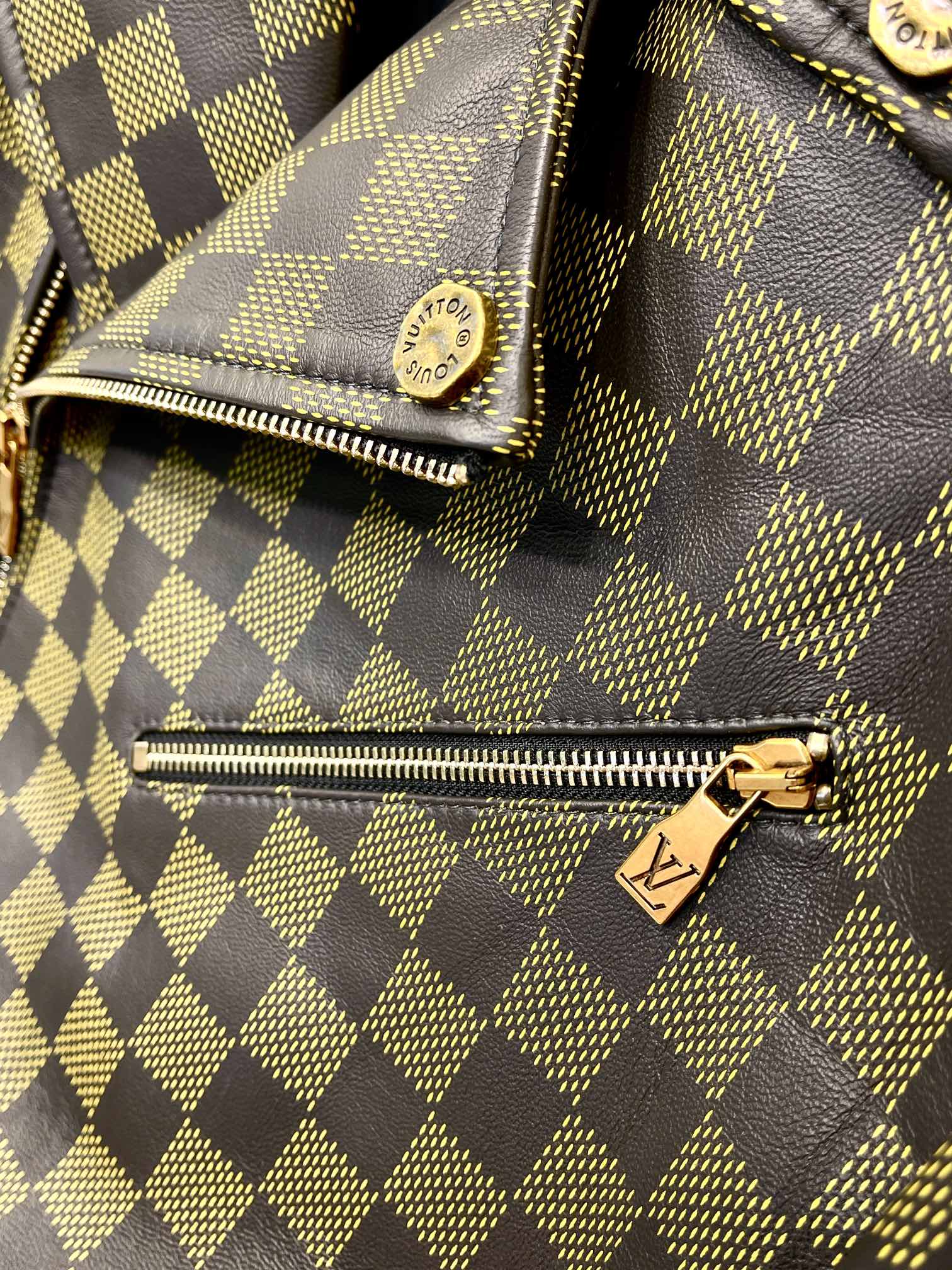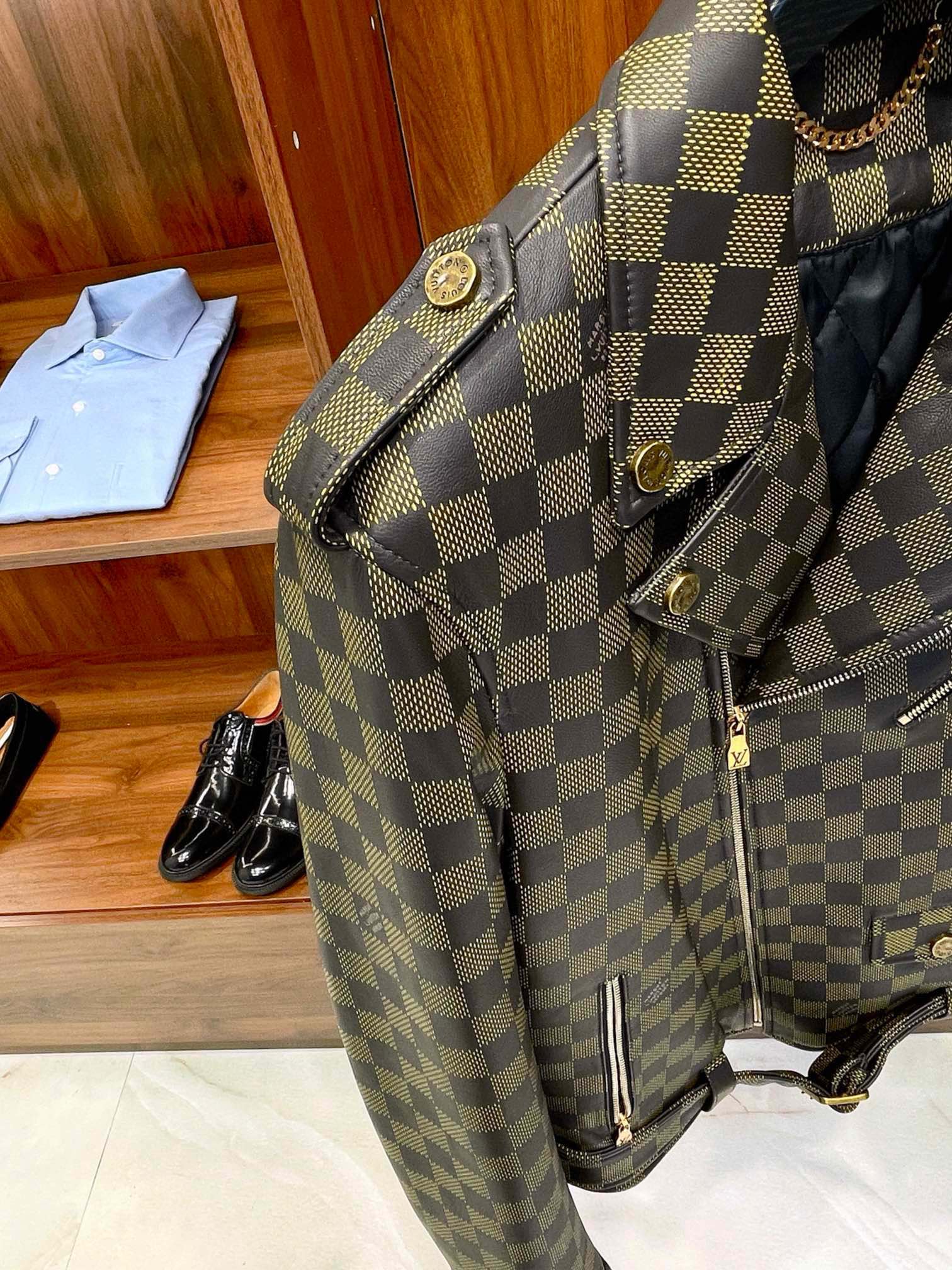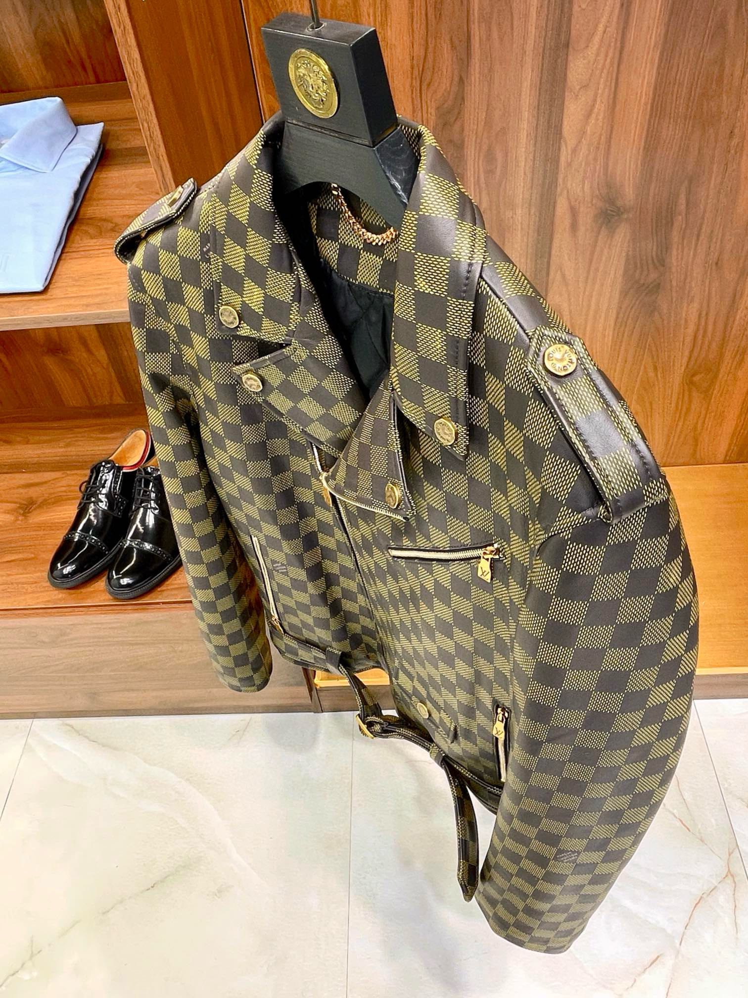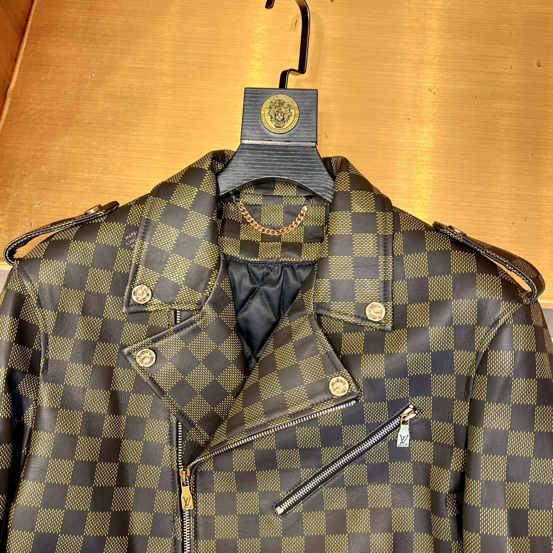 NIGO Louis Vuitton Men's Autumn and Winter Checkerboard Print Zipper Short Lapel Long Sleeve Leather Jacket #nigo73267