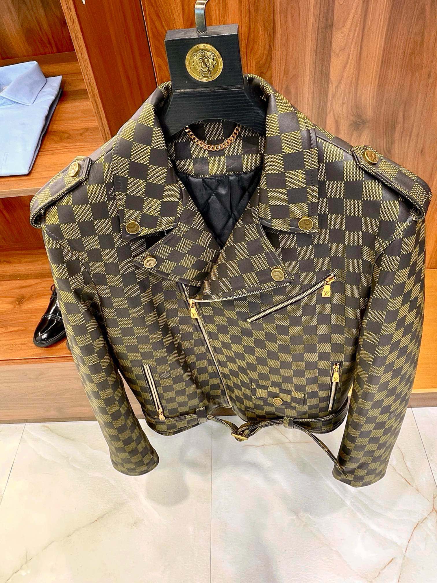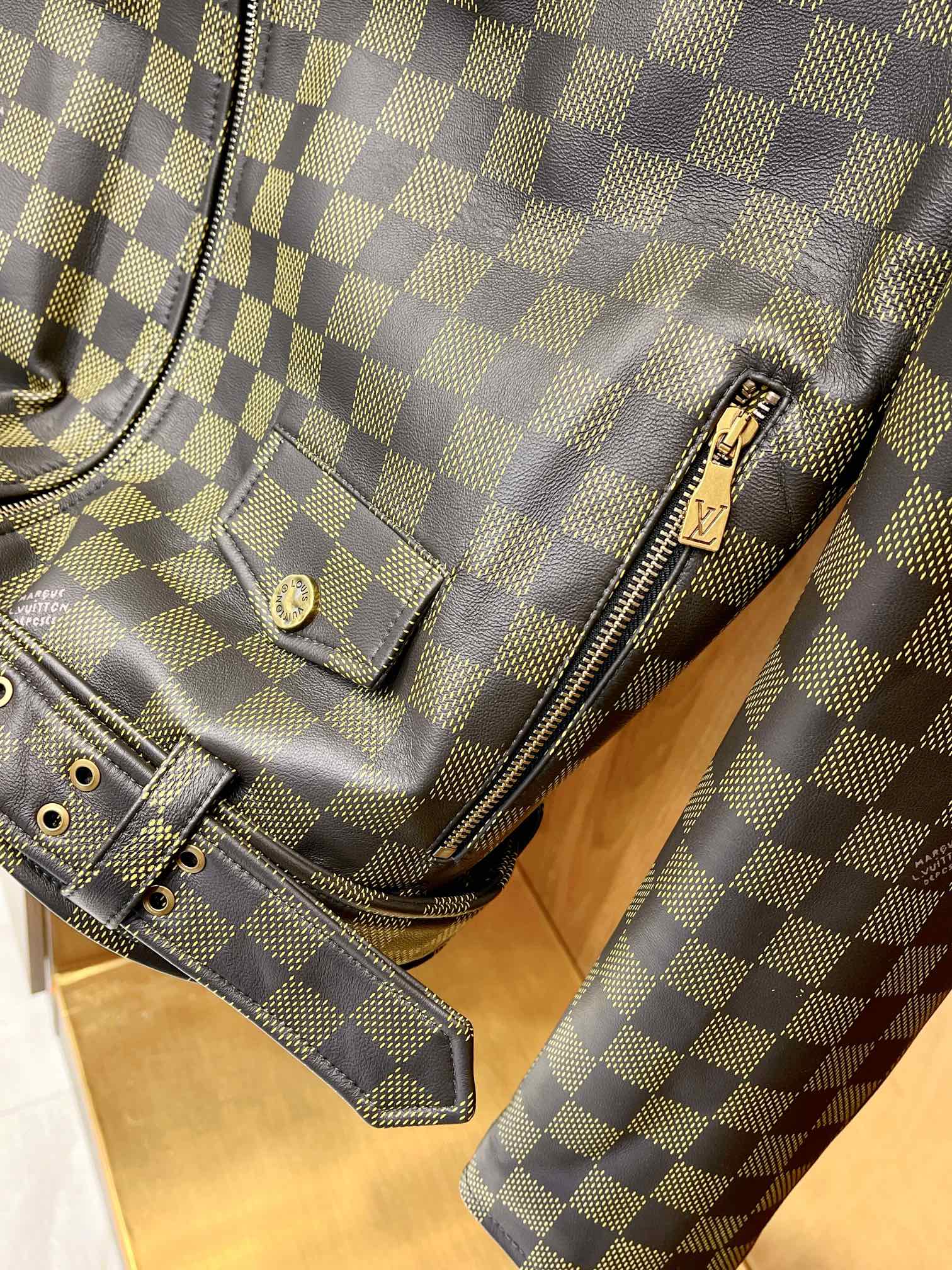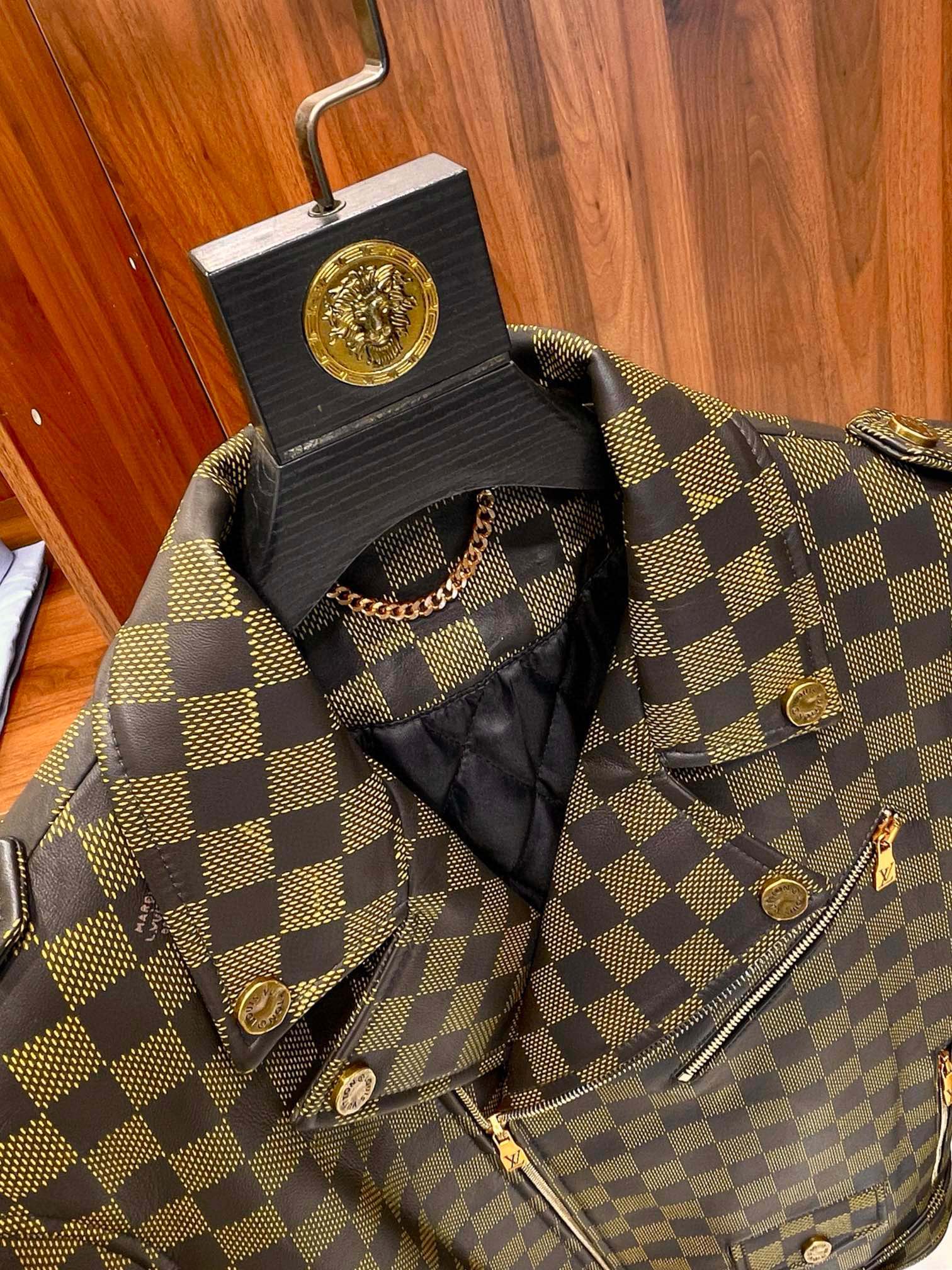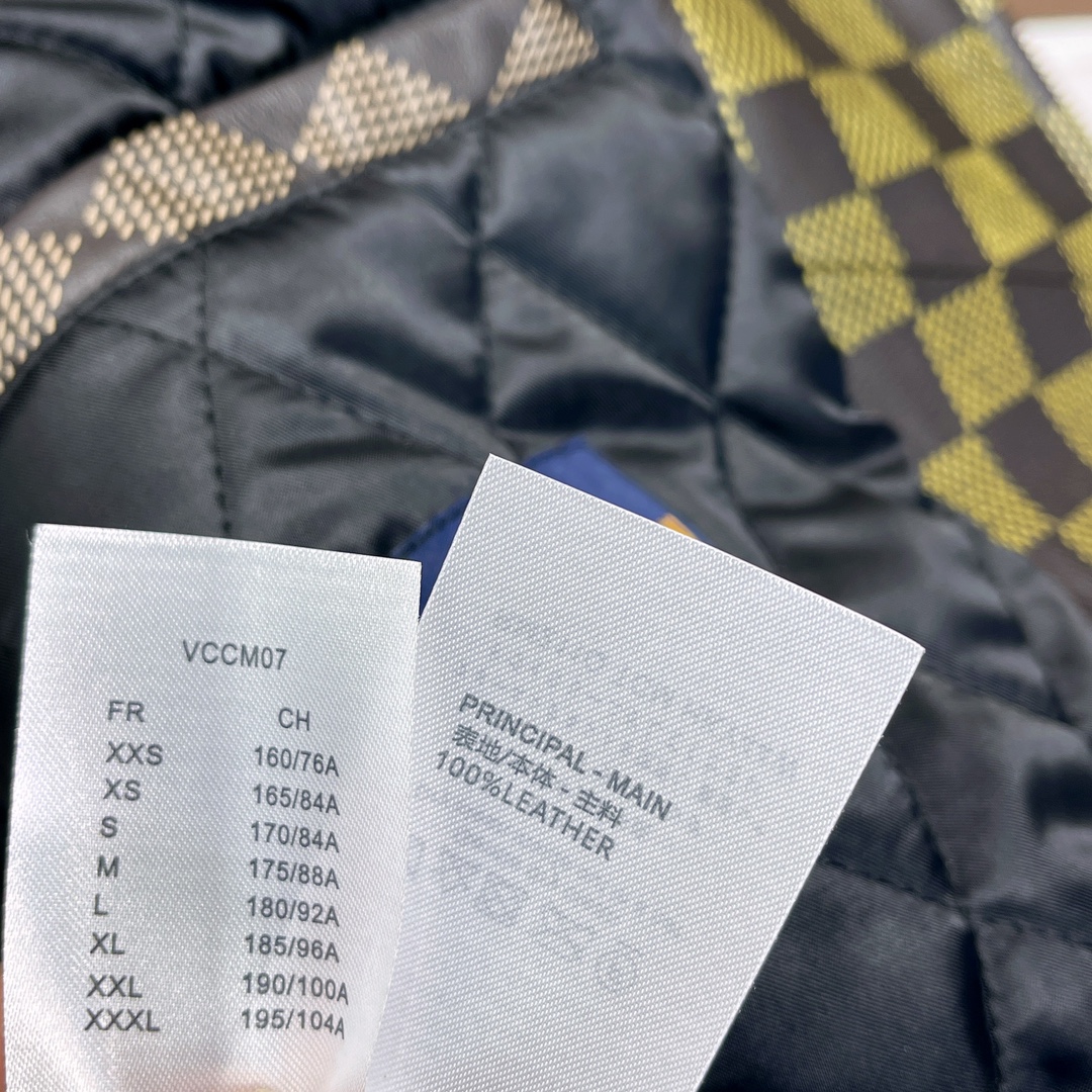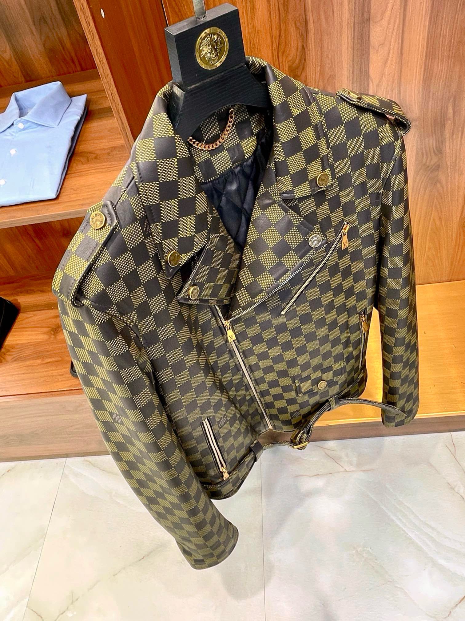 NIGO Louis Vuitton Men's Autumn and Winter Checkerboard Print Zipper Short Lapel Long Sleeve Leather Jacket #nigo73267