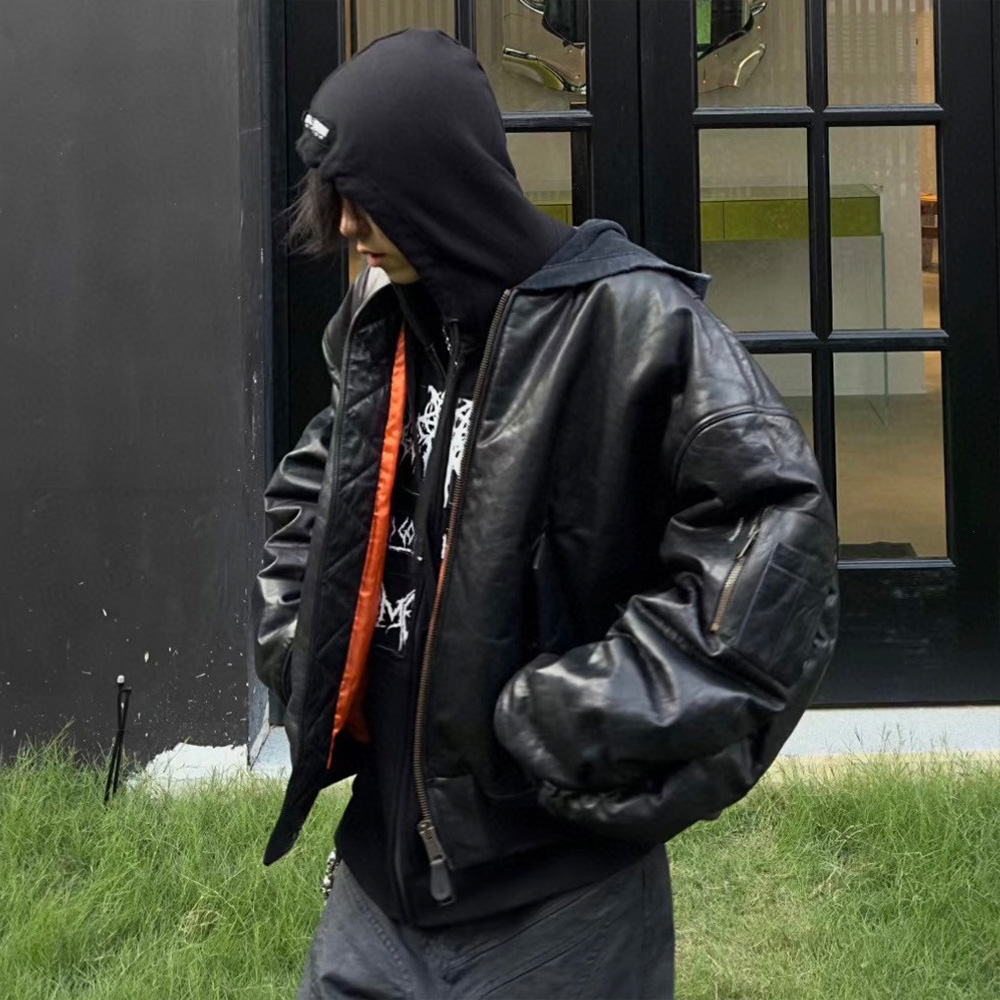 NIGO THUG CLUB Men's Winter Dyed Logo Printed Zipper Hem Drawstring Fitted Short Hooded Leather Jacket Ngvp #nigo6998