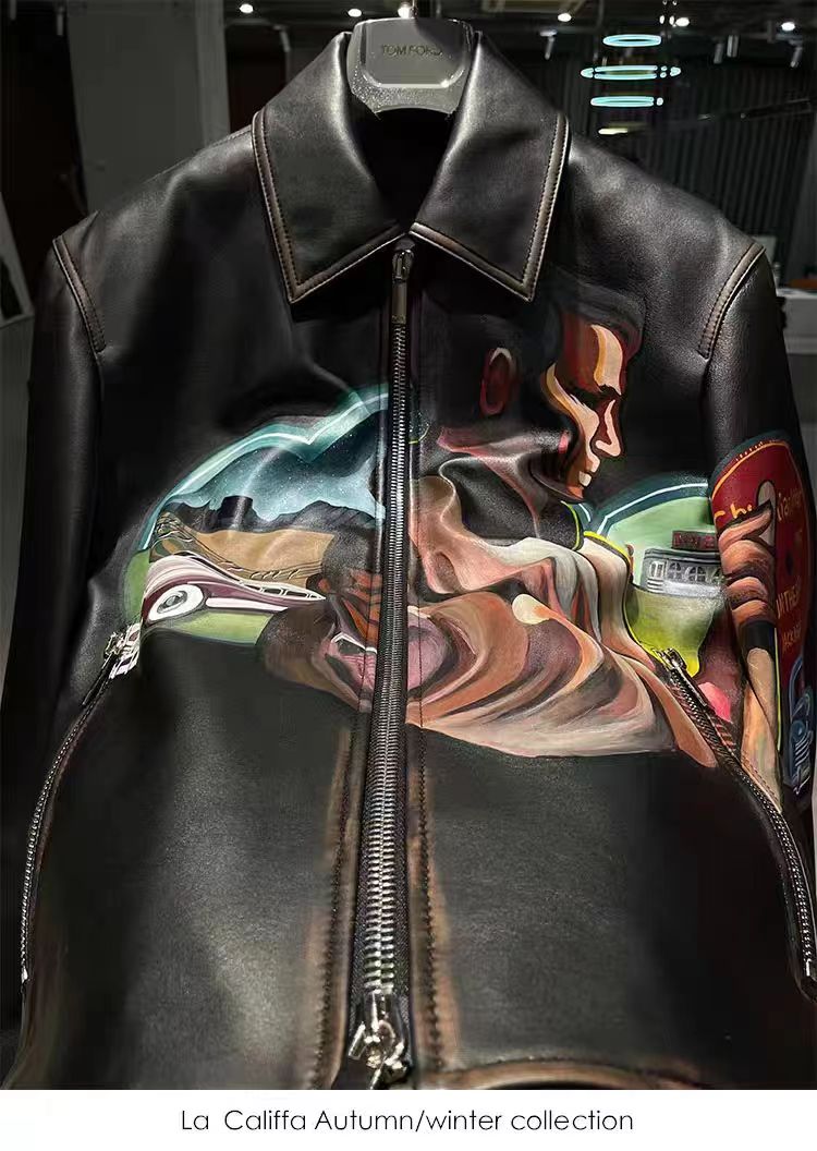 NIGO Dior Men's Fall/Winter Character Print Brown Zipper Lapel Leather Jacket #nigo72144
