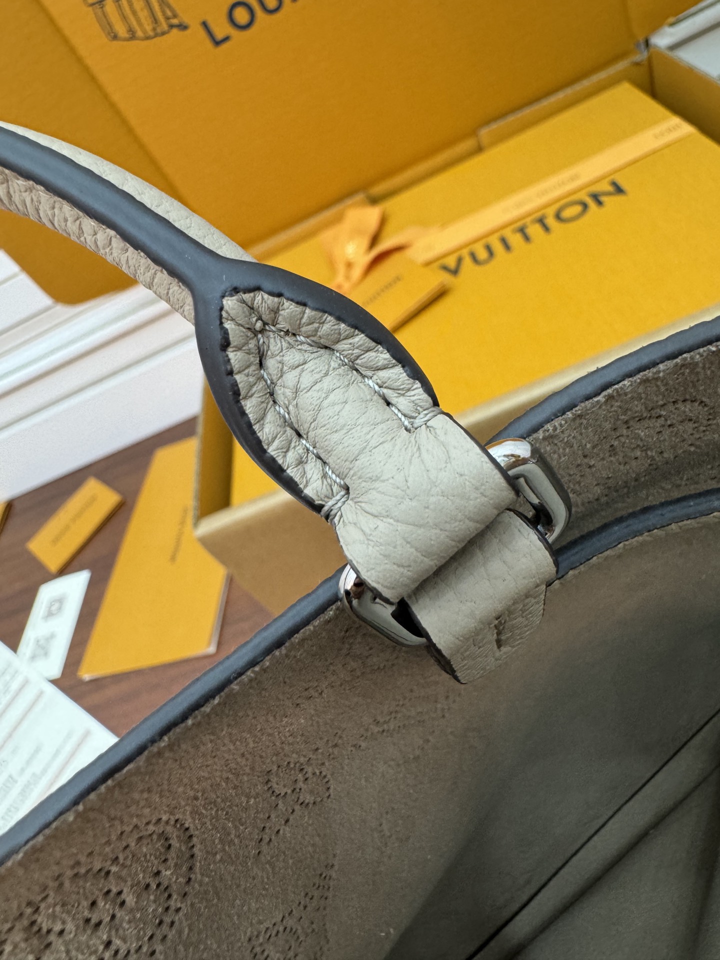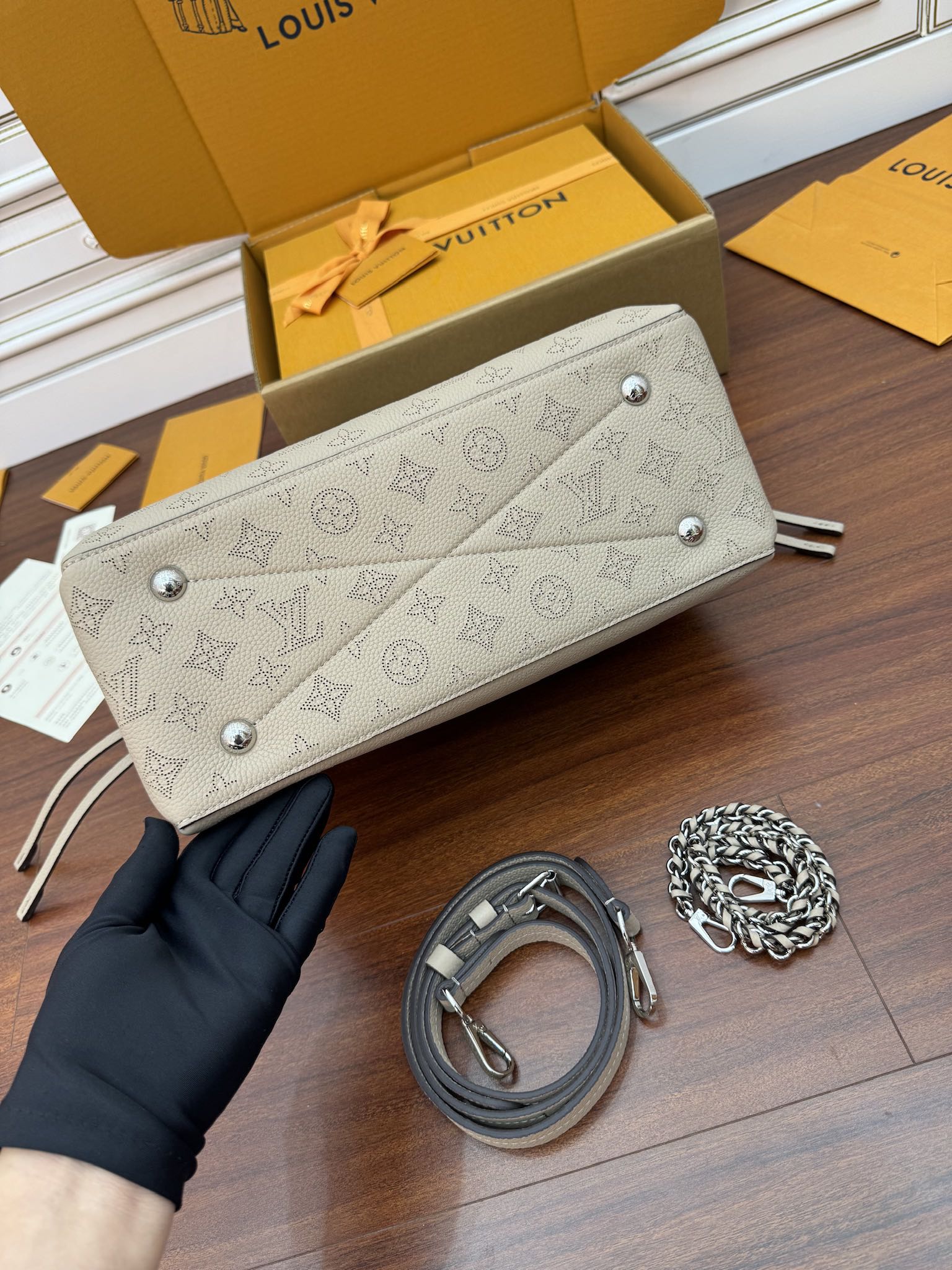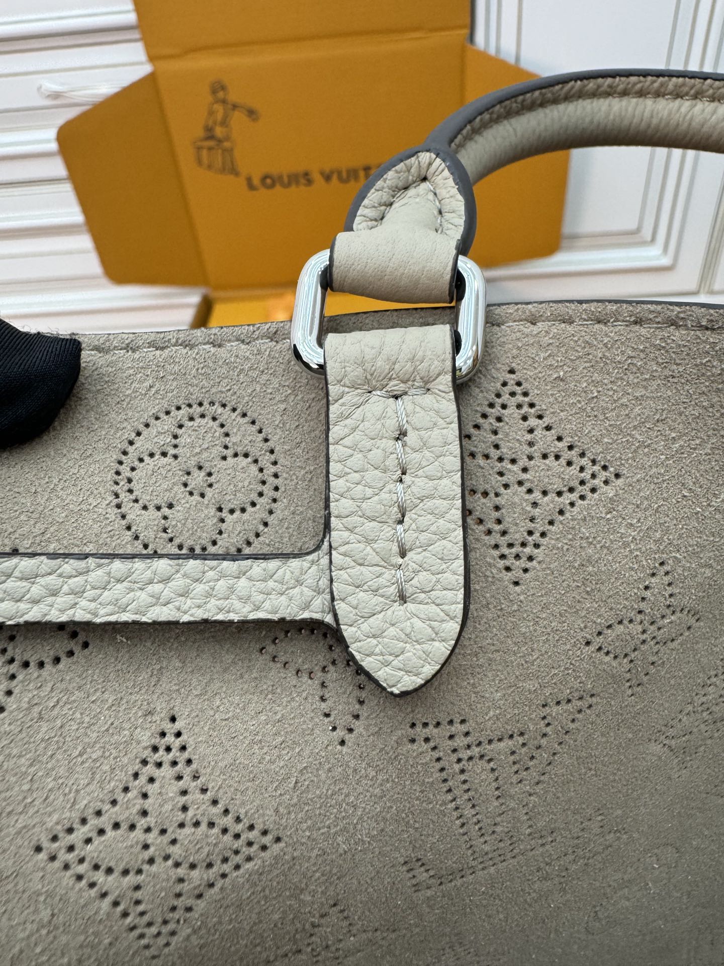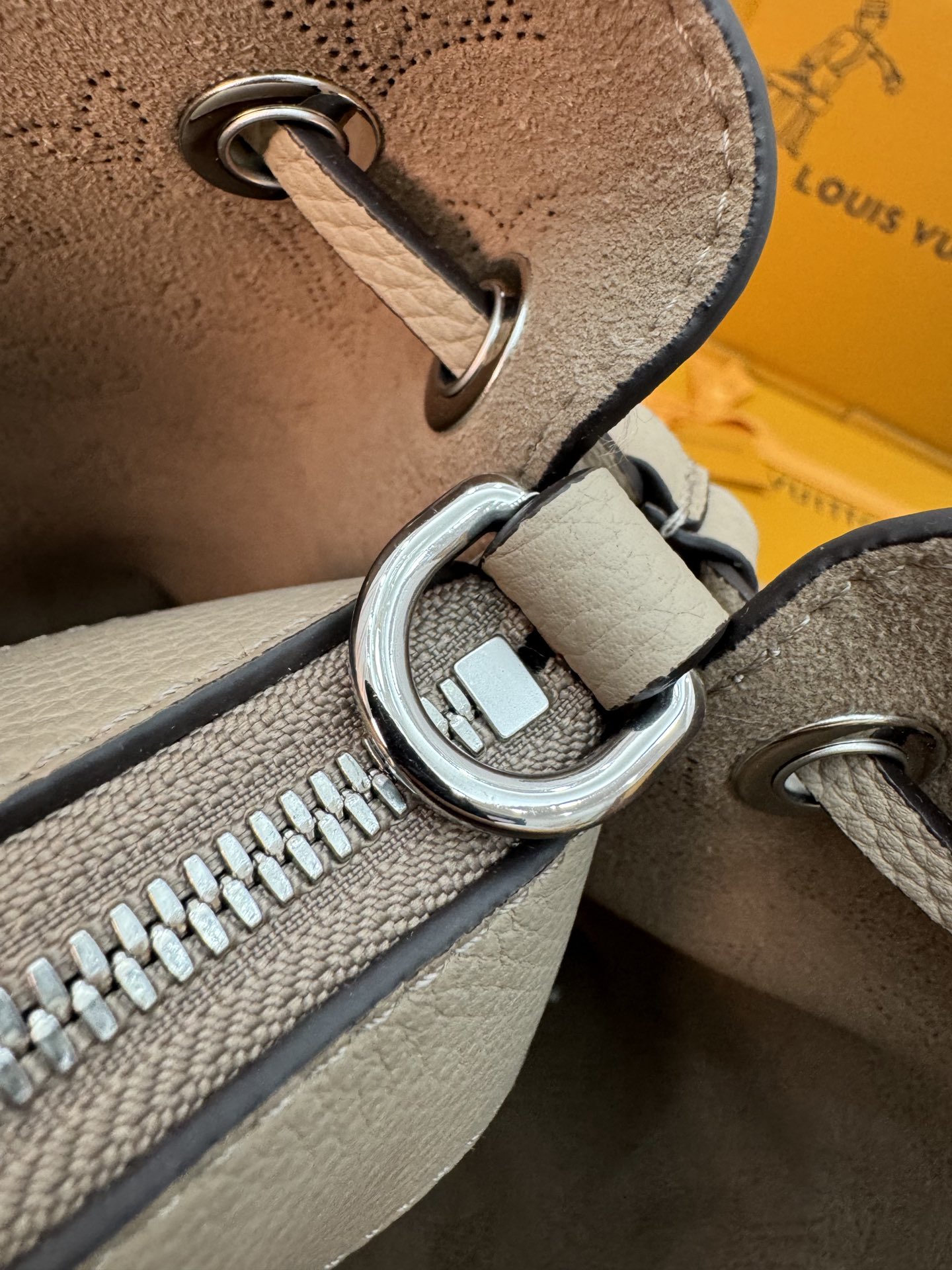 NIGO Louis Vuitton Bella Women's Gray Detachable Adjustable Shoulder Strap Hollow Logo Perforated Calfskin Drawstring Bucket Tote Bag Bags #nigo99644