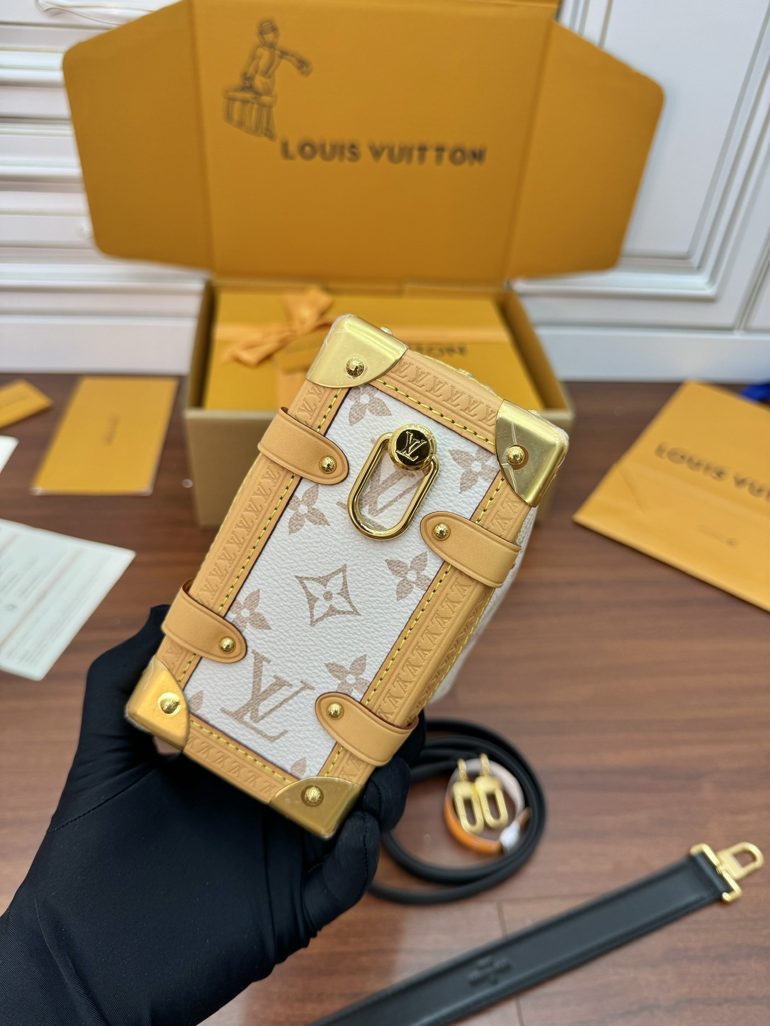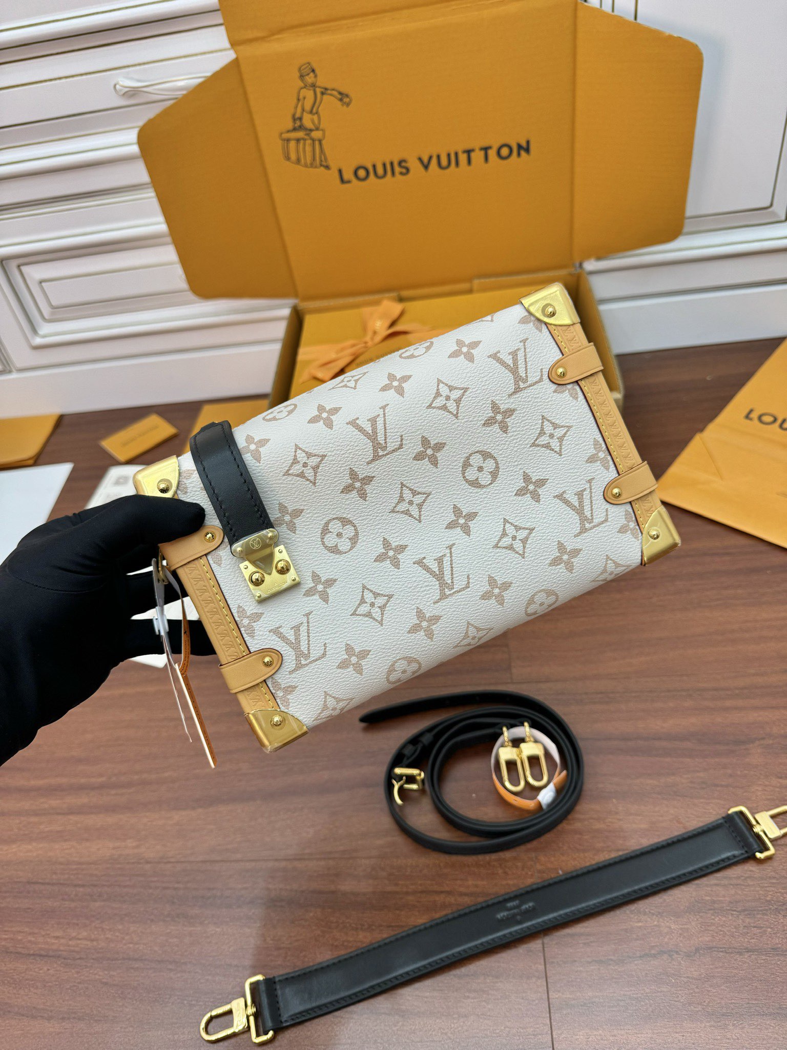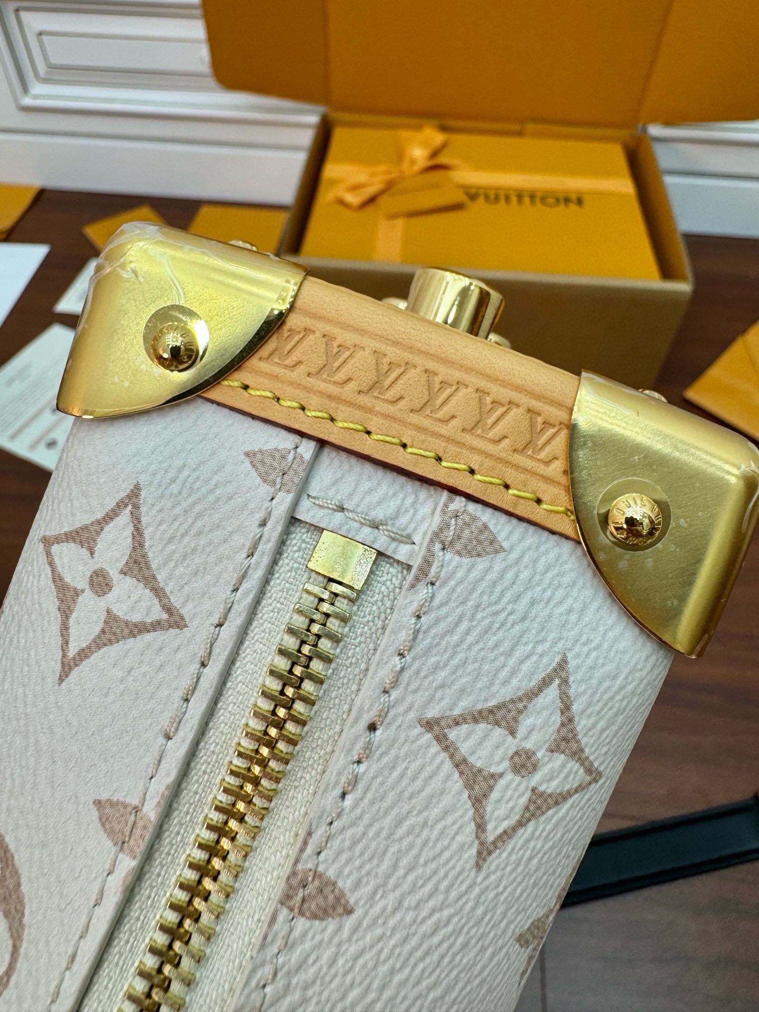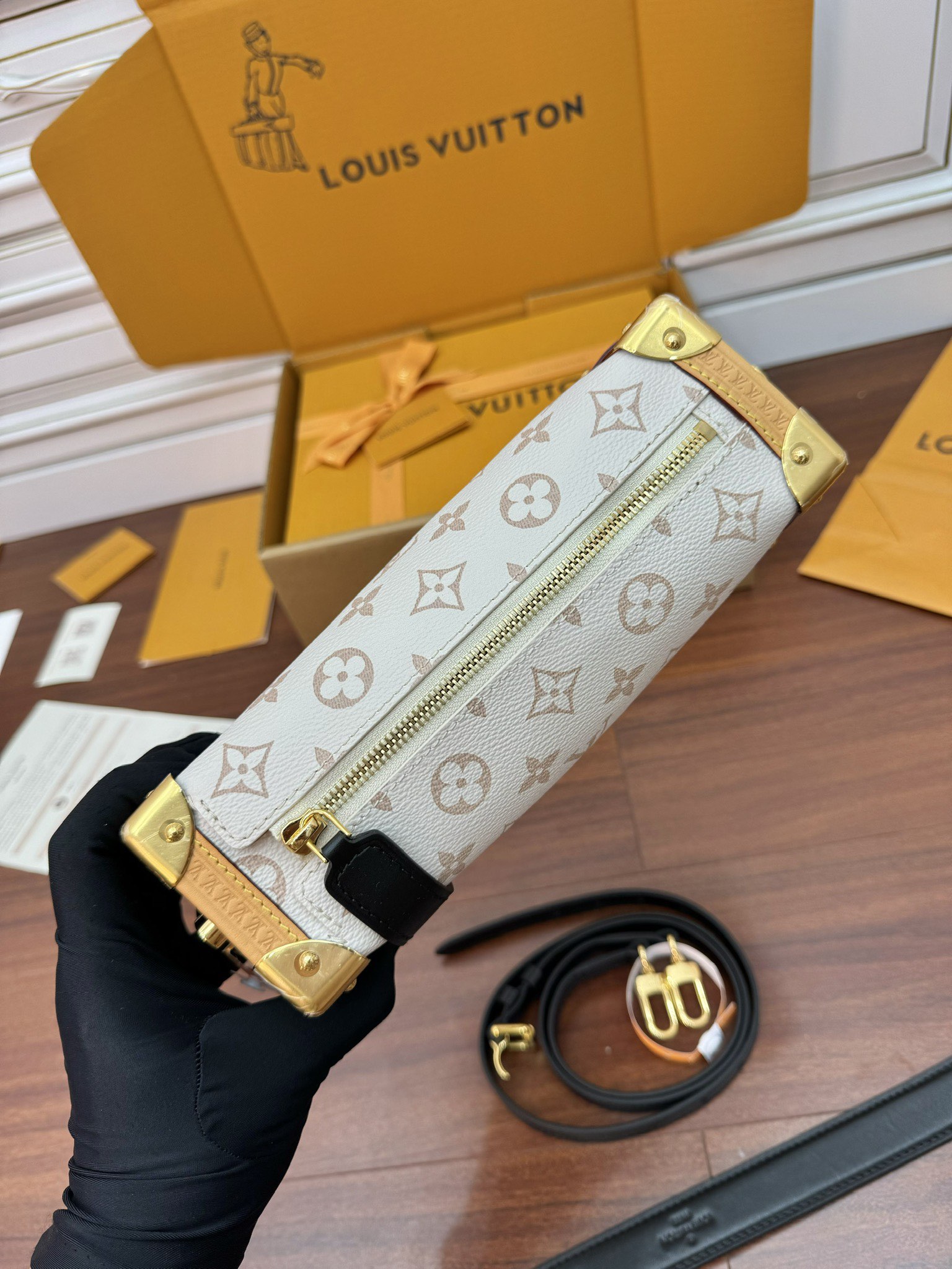 NIGO Side Trunk Louis Vuitton Women's Beige Removable Adjustable Shoulder Strap S Lock Zipper Closure Canvas Spell Leather Handbag Shoulder Slanting Bag #nigo72524