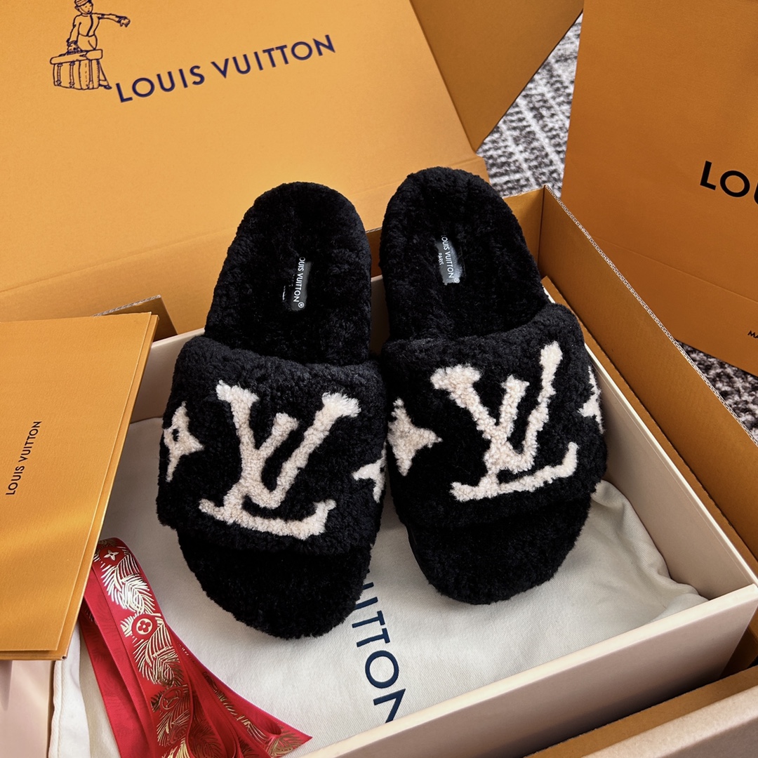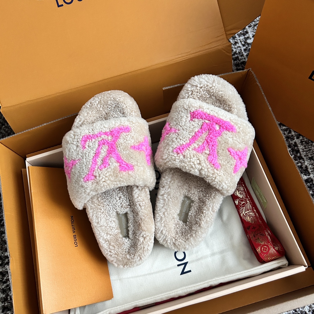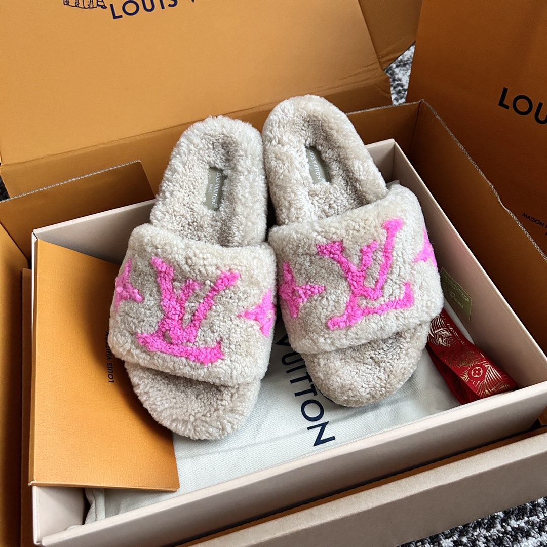 NIGO Louis Vuitton Women's Fall/Winter Fashion Casual Round Toe Open Toe Flat Thong Wool Slippers Shoes #nigo78811