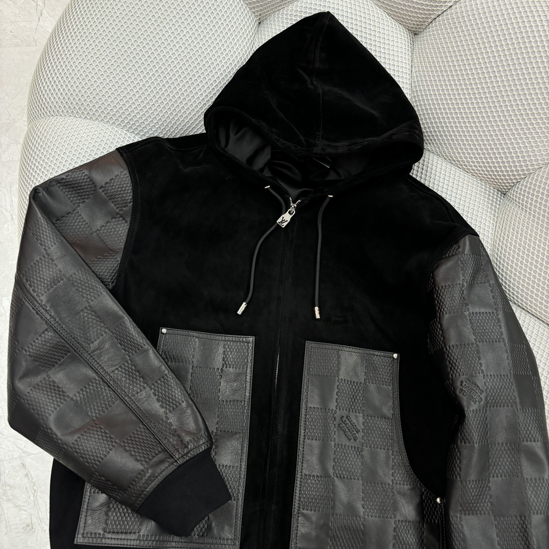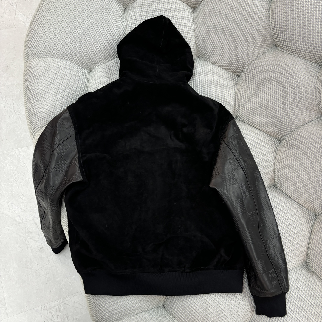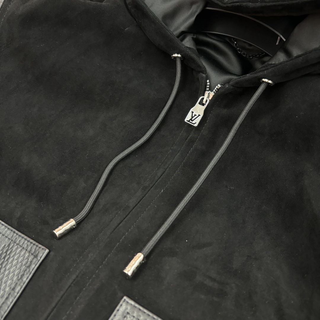 NIGO Louis Vuitton Men's Fall And Winter Black Suede Patchwork Hooded Drawstring Zipper Long Sleeve Jacket #nigo73125