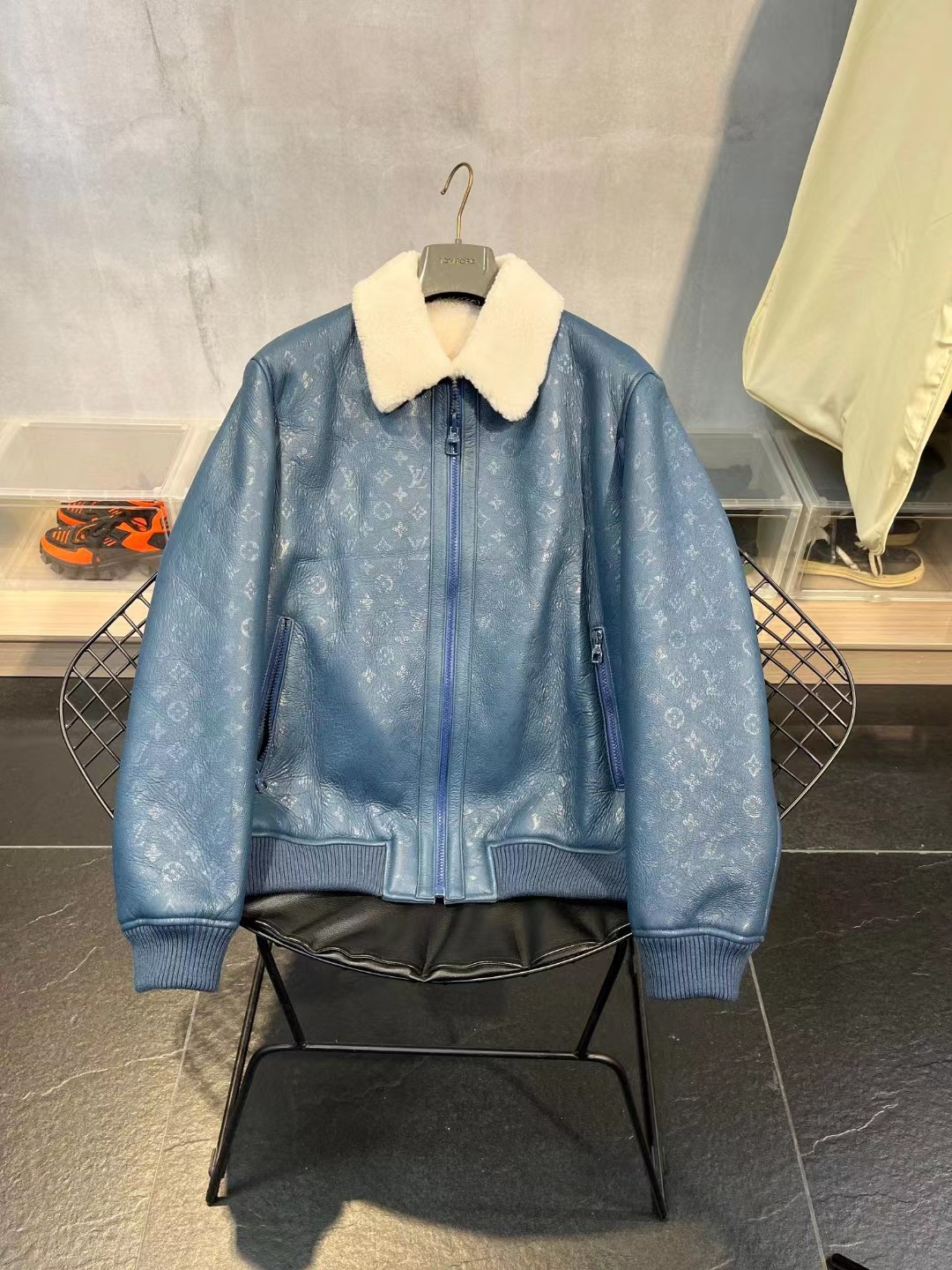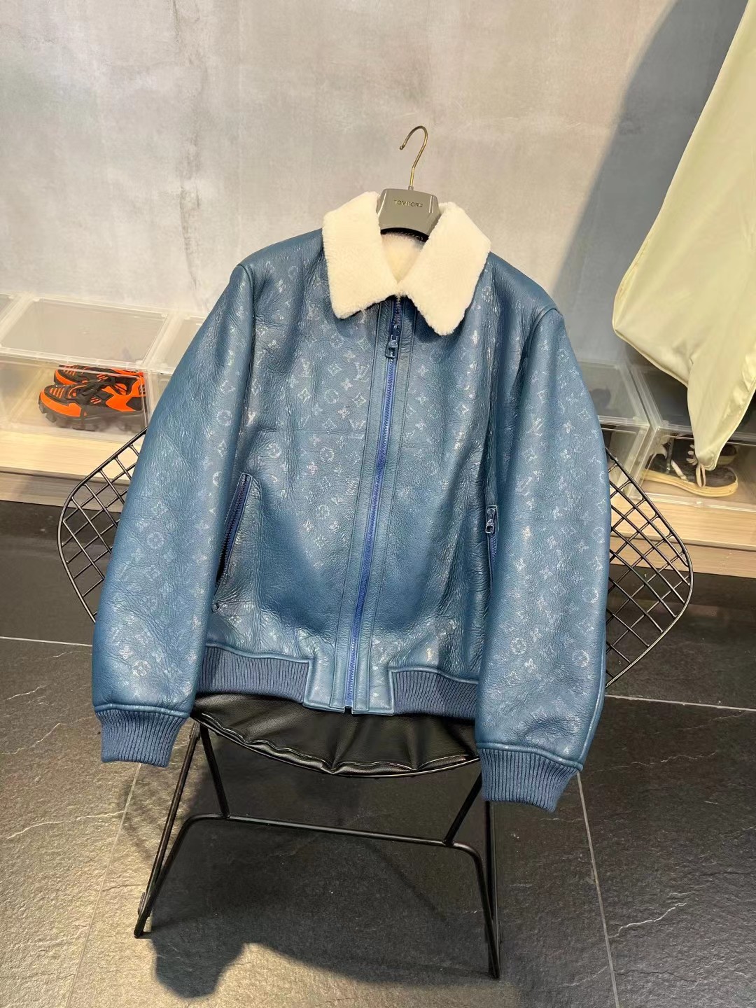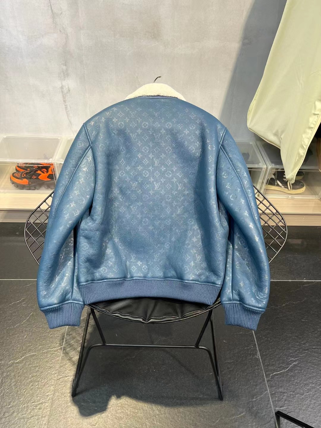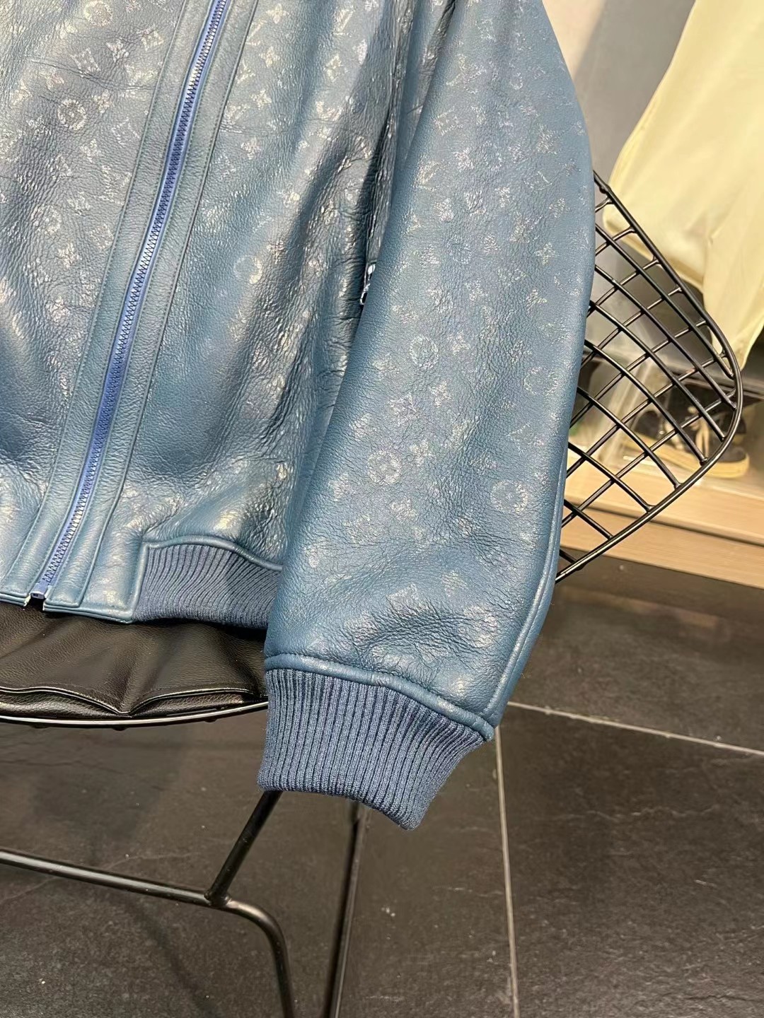 NIGO Louis Vuitton Men's Winter Wool Lining Blue Dark Logo Print Leather Zip Jacket #nigo97752