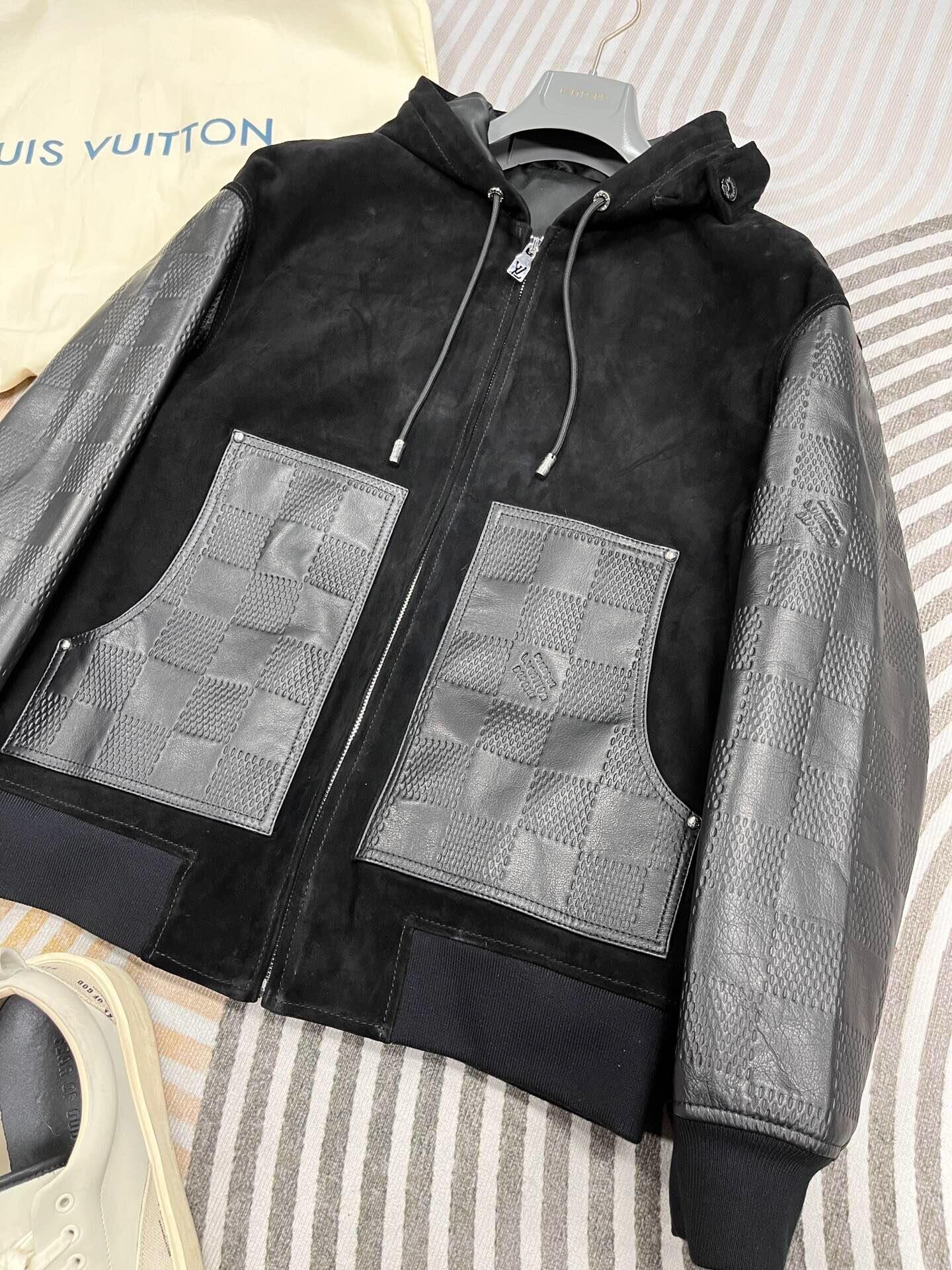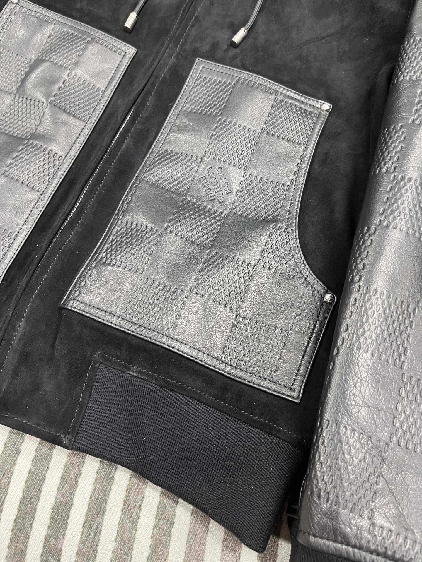 NIGO Louis Vuitton Men's Fall And Winter Black Suede Patchwork Hooded Drawstring Zipper Long Sleeve Jacket #nigo73342