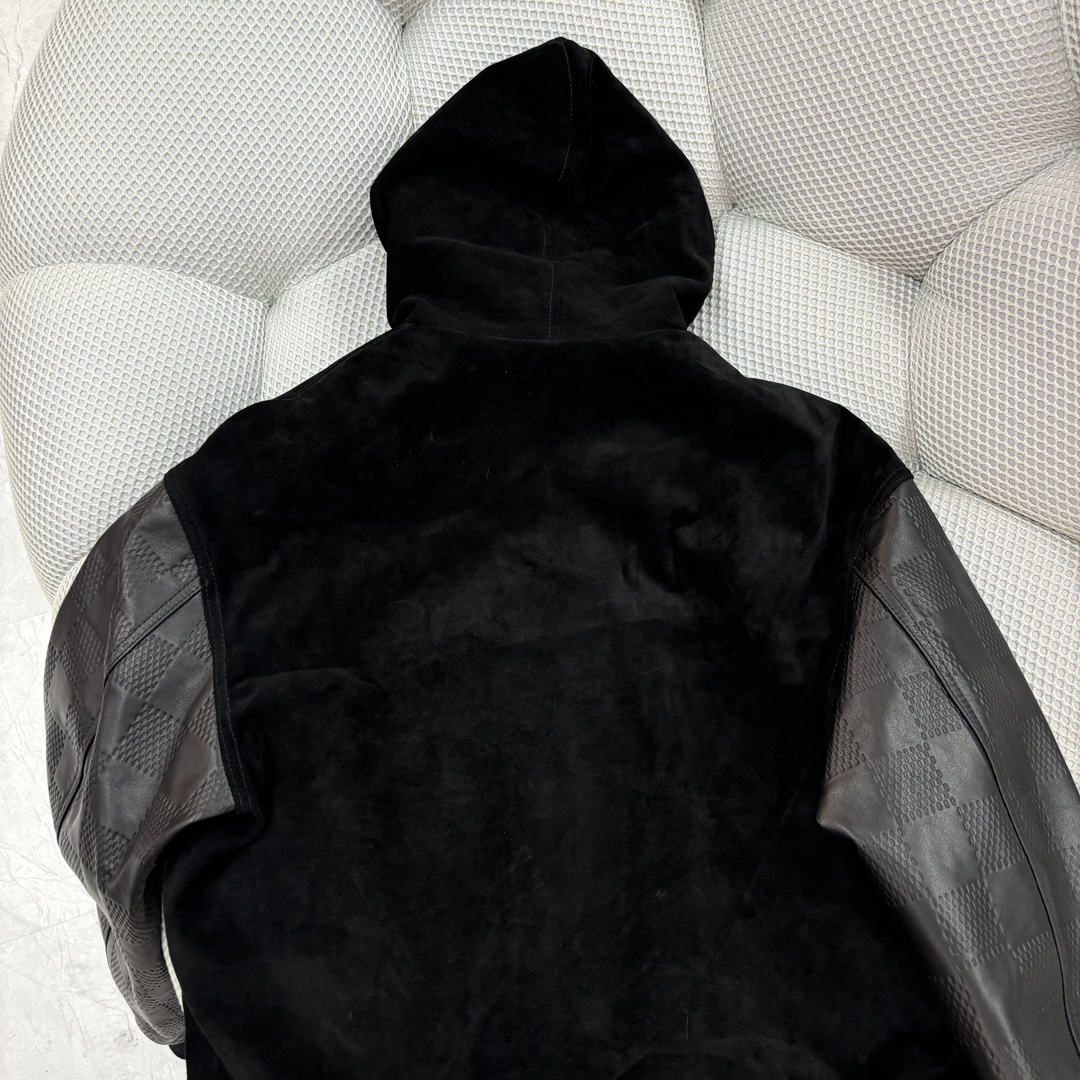 NIGO Louis Vuitton Men's Fall And Winter Black Suede Patchwork Hooded Drawstring Zipper Long Sleeve Jacket #nigo73125