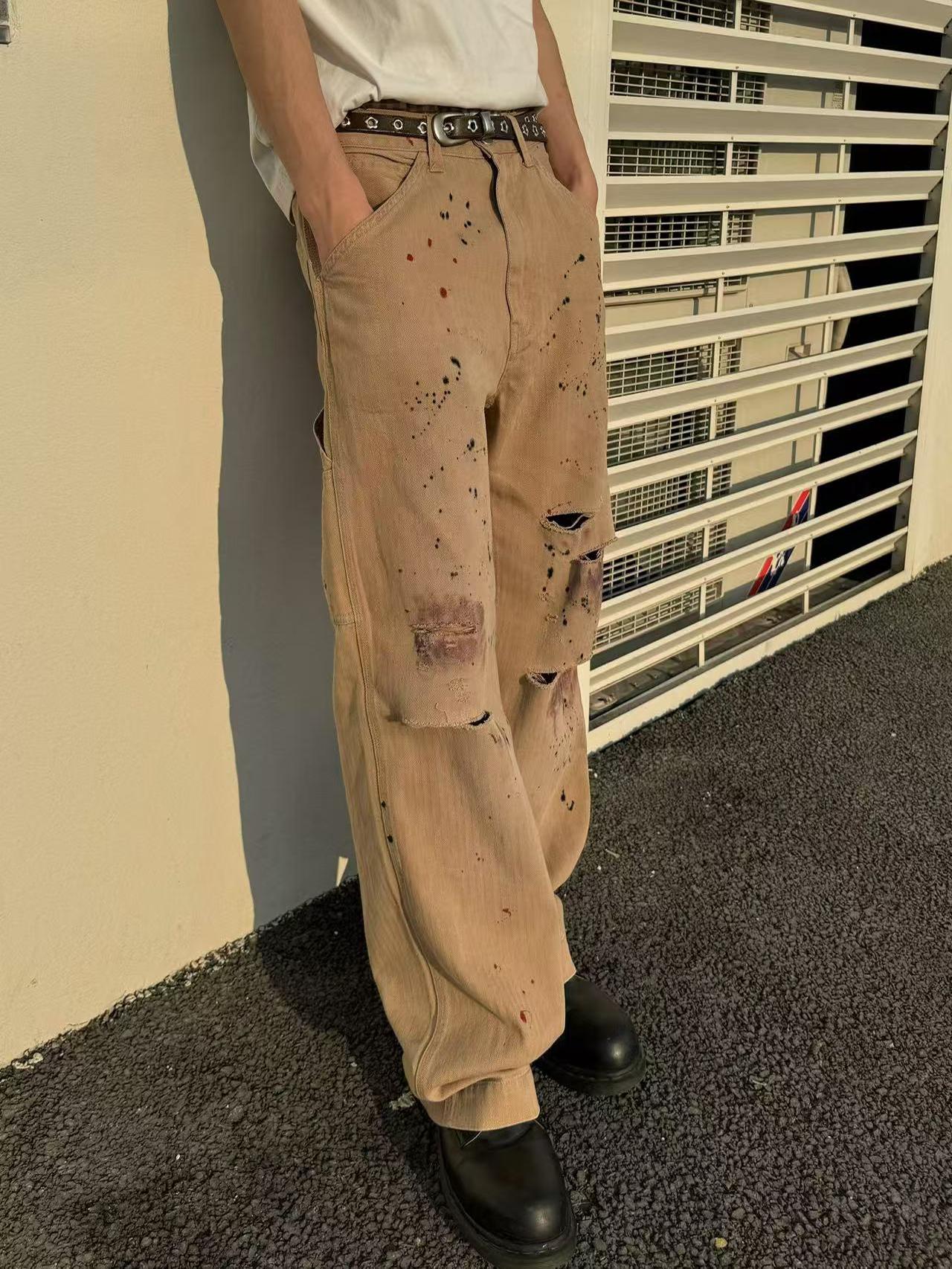 NIGO Men's Four Seasons Washed And Old Destruction Wide-Legged Pants Work Pants Casual Solid Color Pants Ngvp #nigo1141