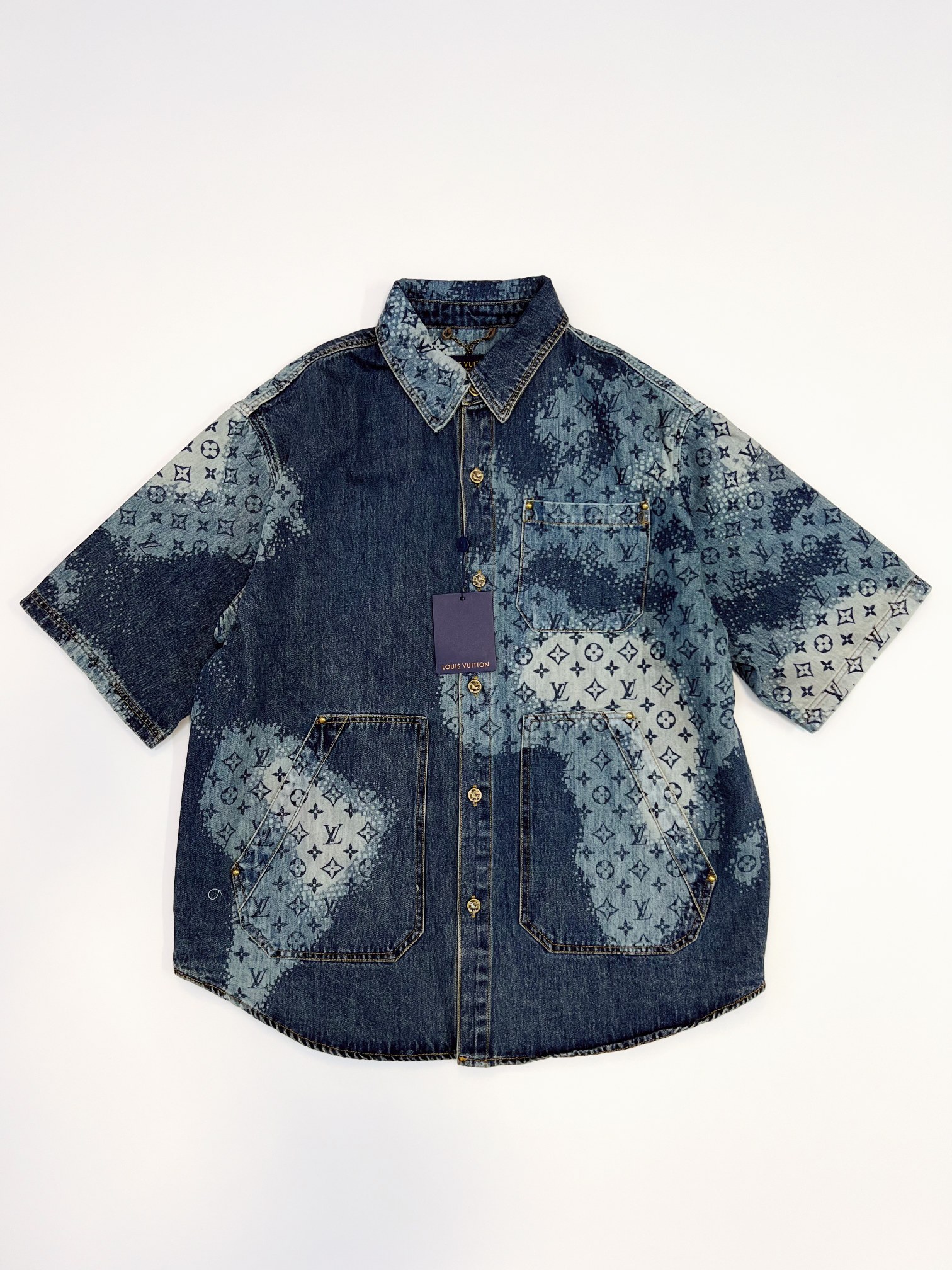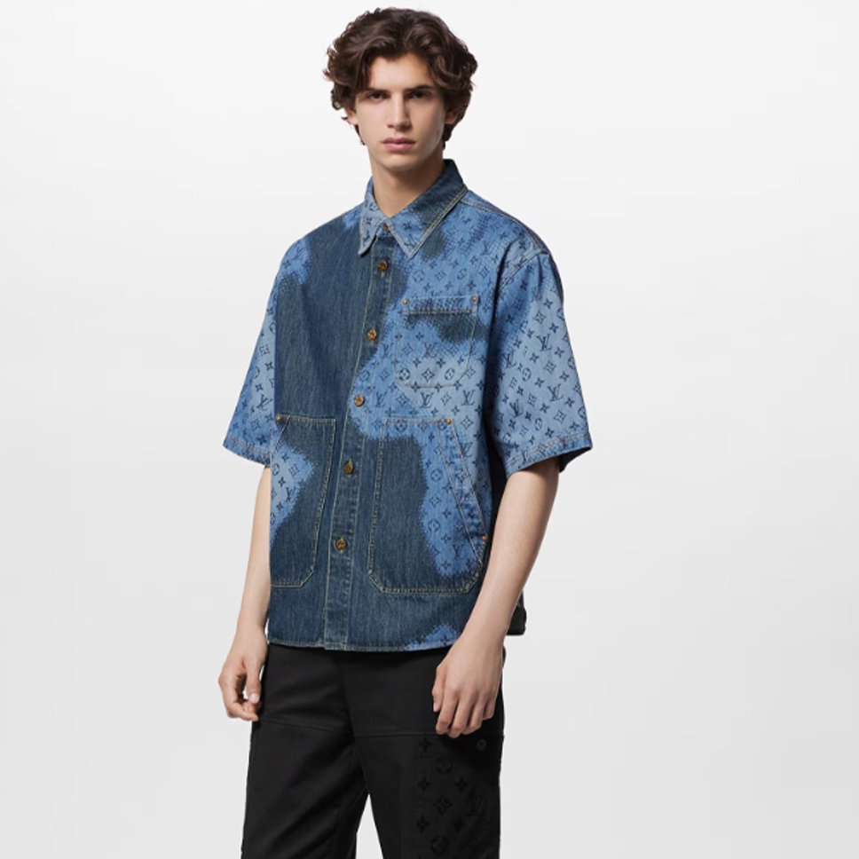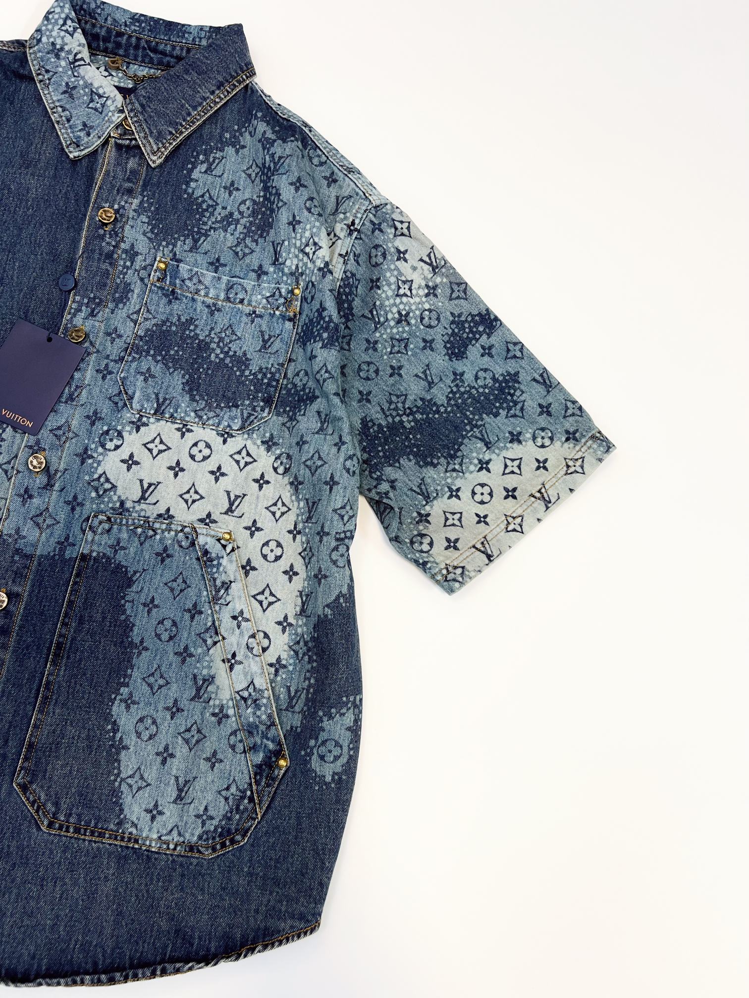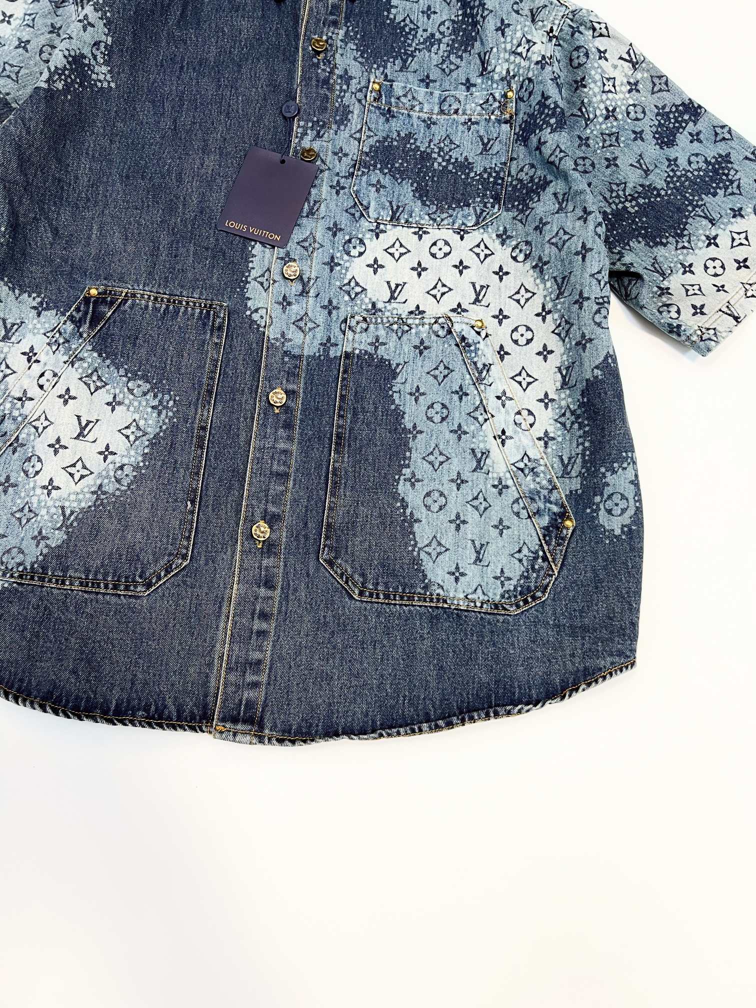NIGO Louis Vuitton Men's Summer Blue Letter All Over Print Single Breasted With Short Sleeve Denim Jacket Style Shirt #nigo72124