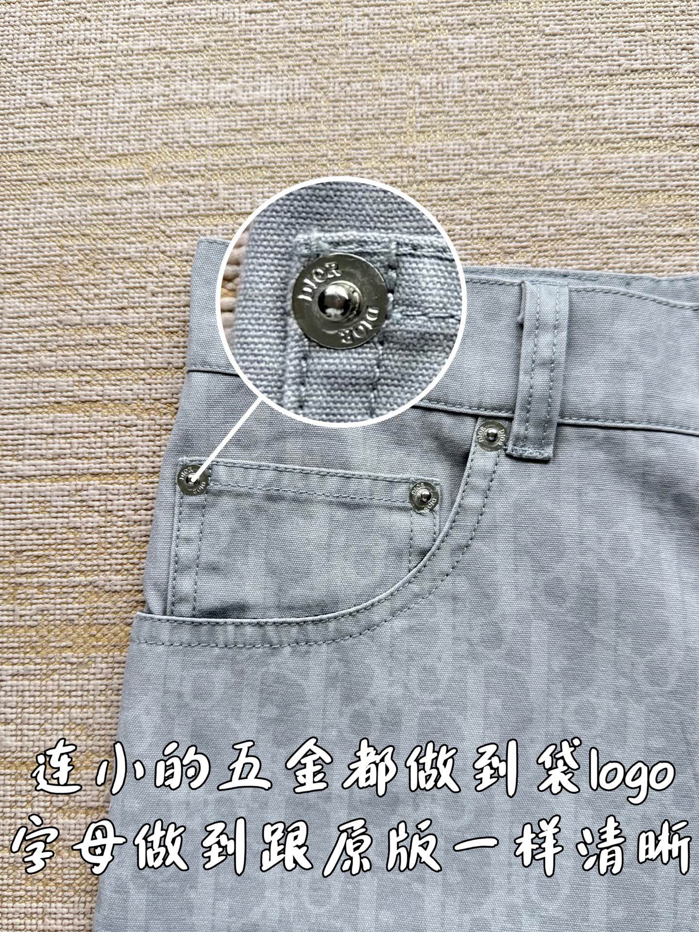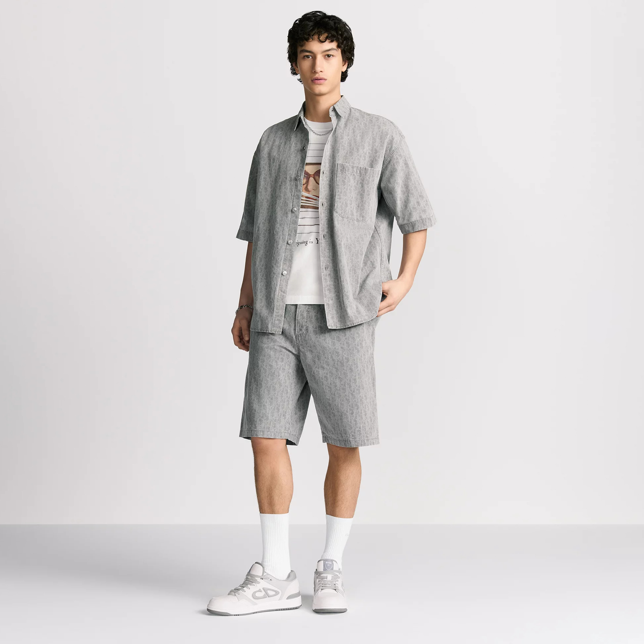 NIGO Dior Men's Spring Summer Grey Cotton Denim Oblique Printed Lapel Single Breasted Shirt Denim Straight Wide Leg Shorts Set Suit #nigo81256