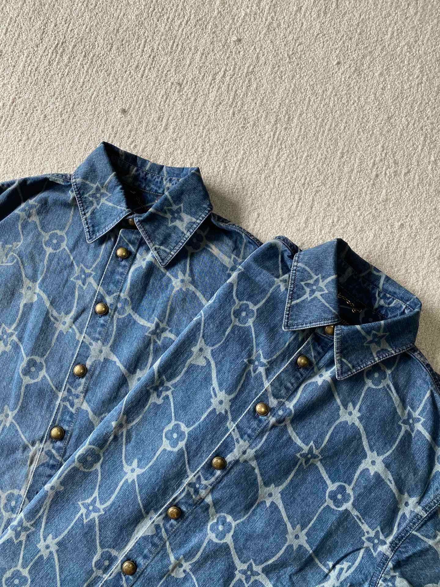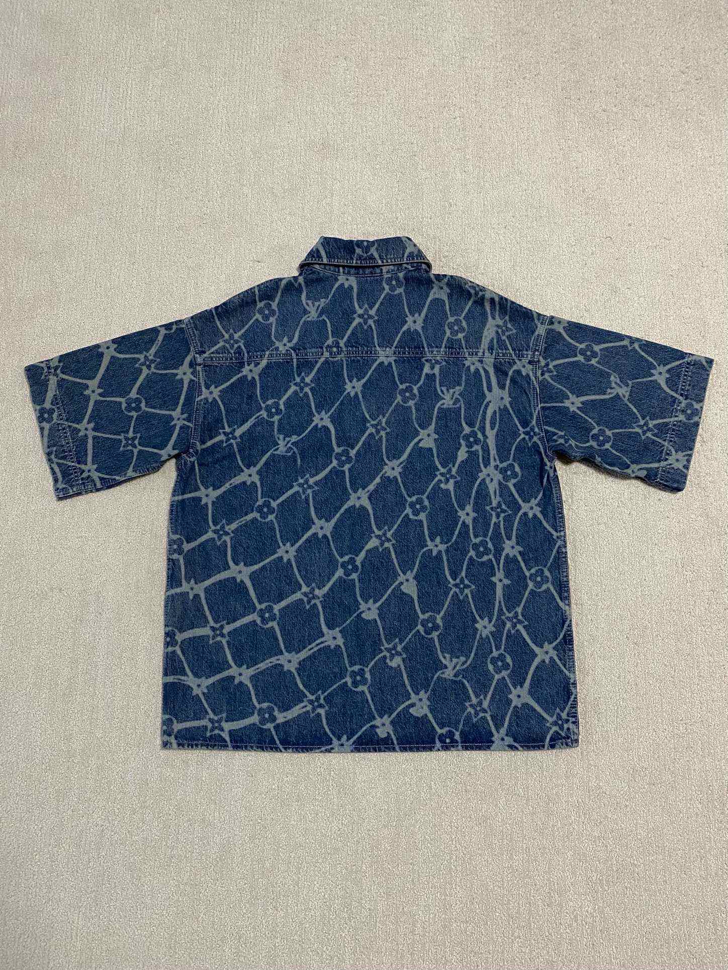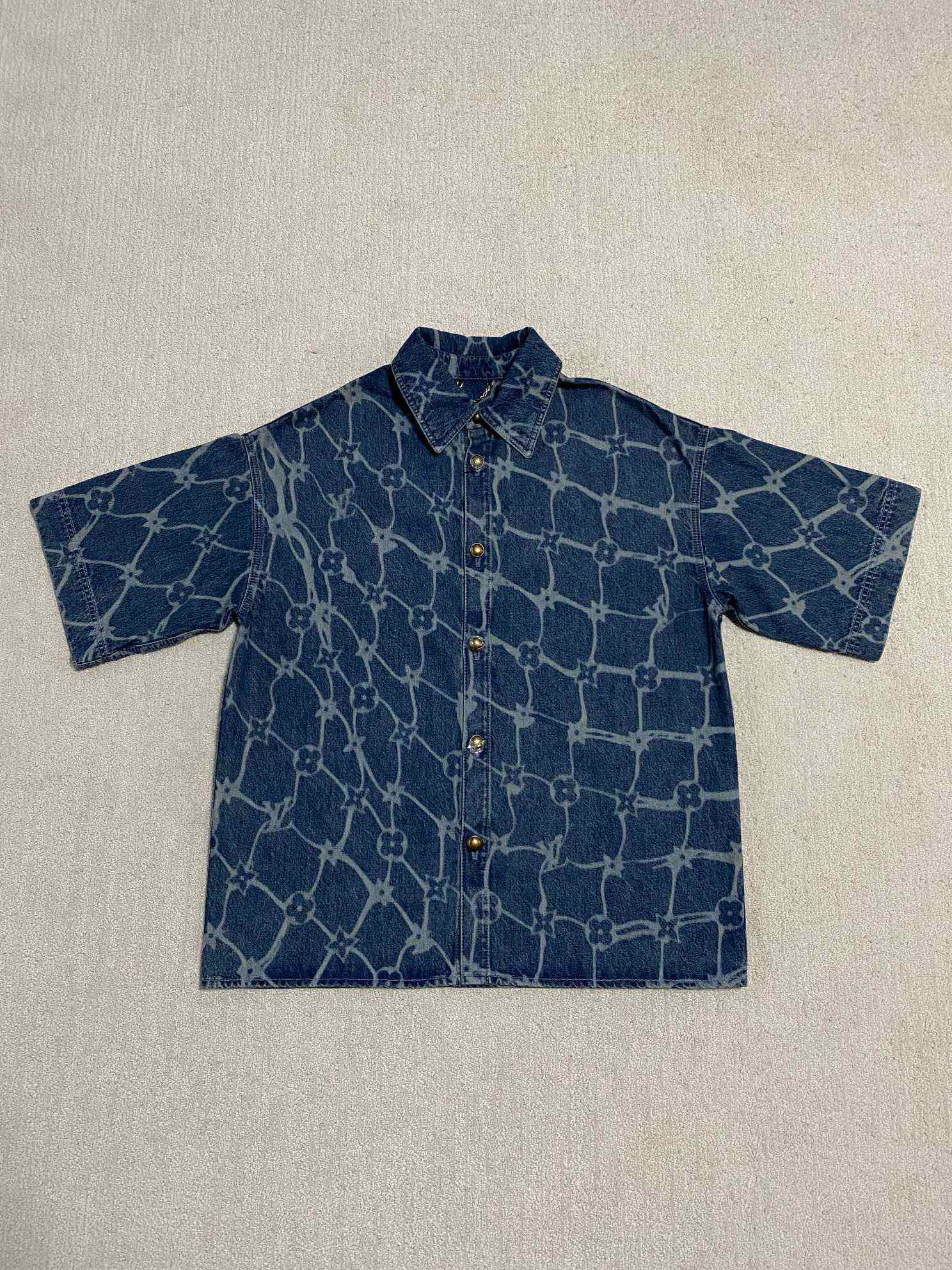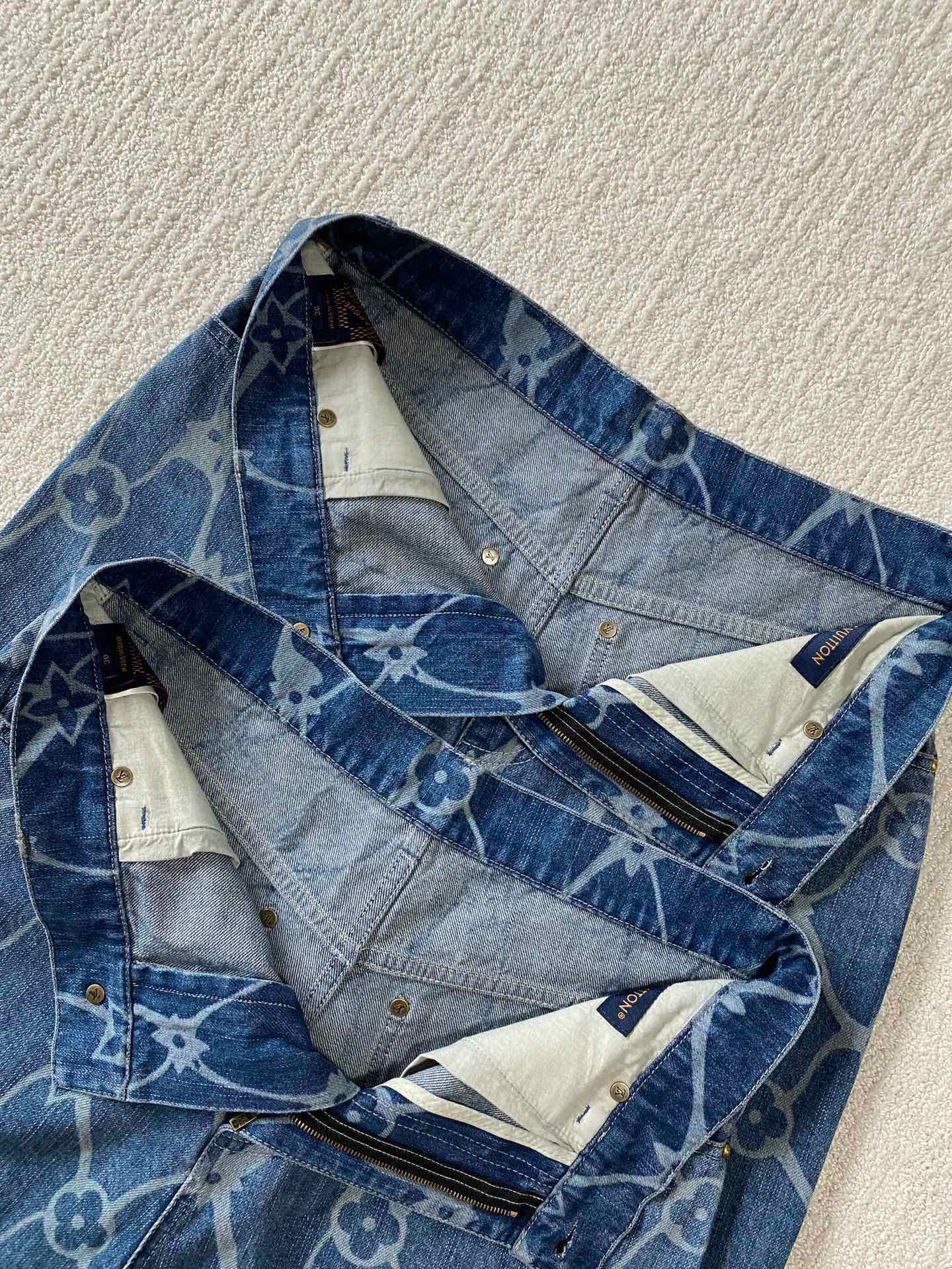 NIGO Louis Vuitton Men's Summer Blue Logo Printed Lapel Single Breasted Denim Short Sleeve Shirt Zipper Straight Jeans Shorts Set Suit #nigo99785