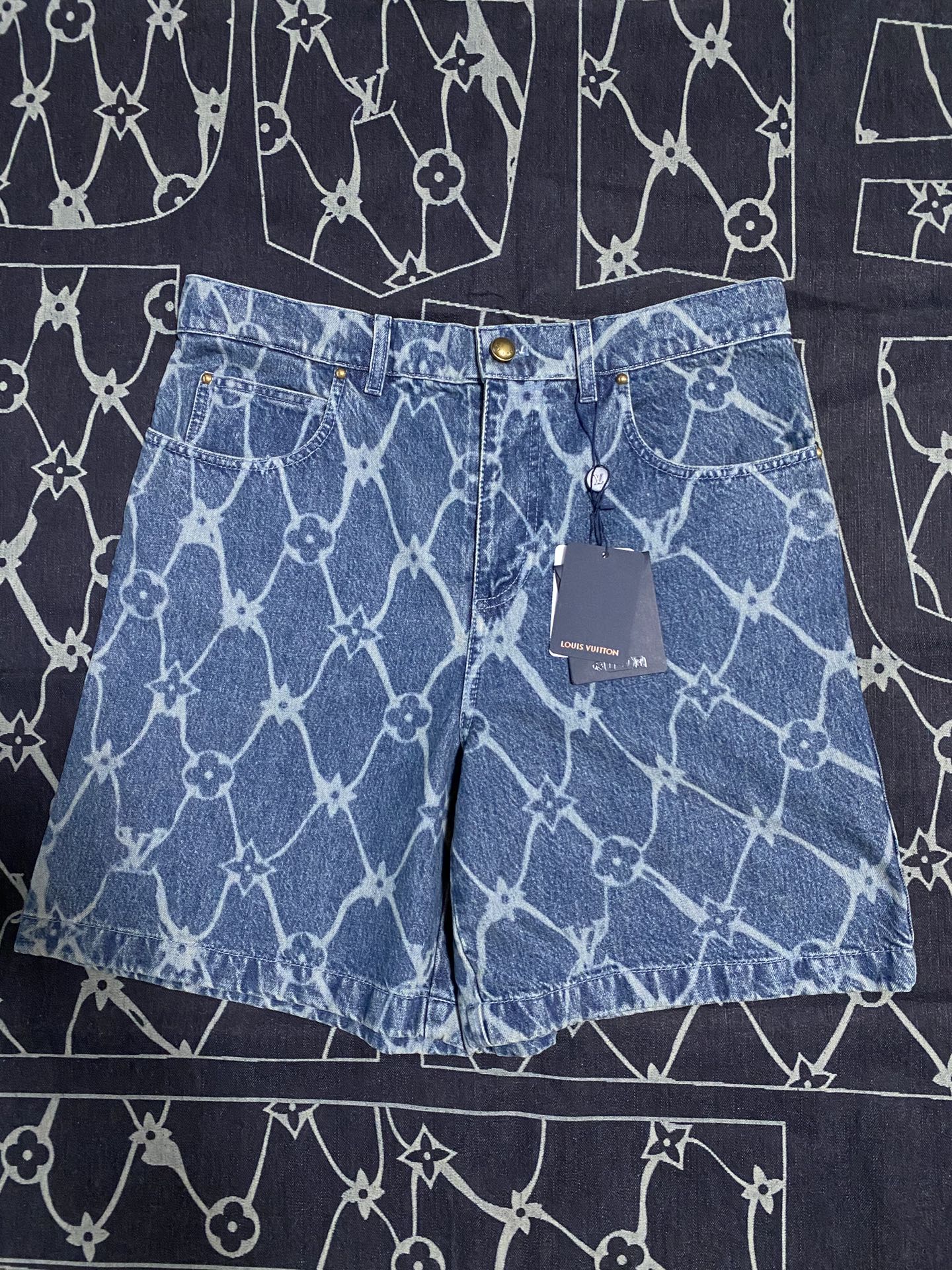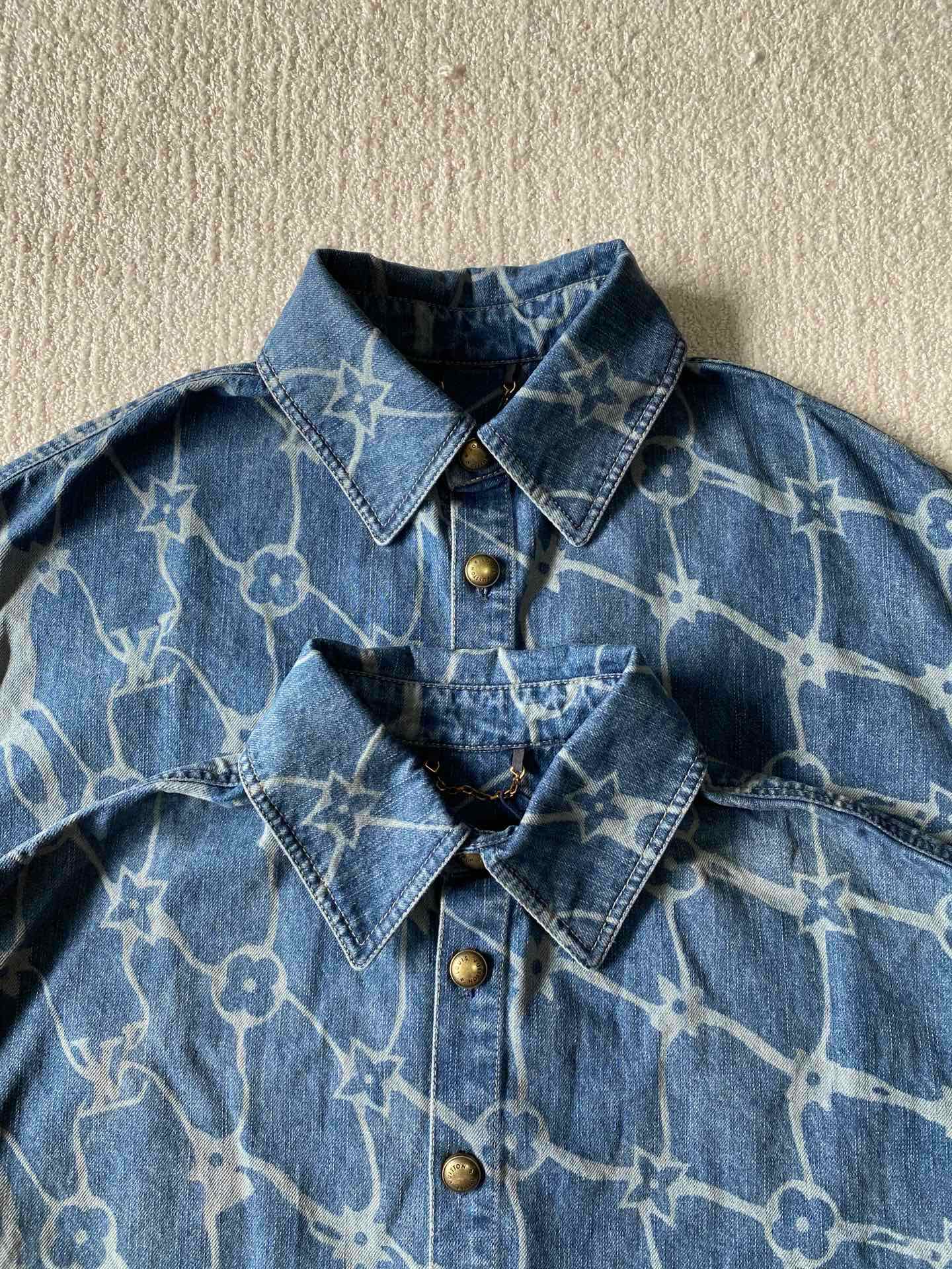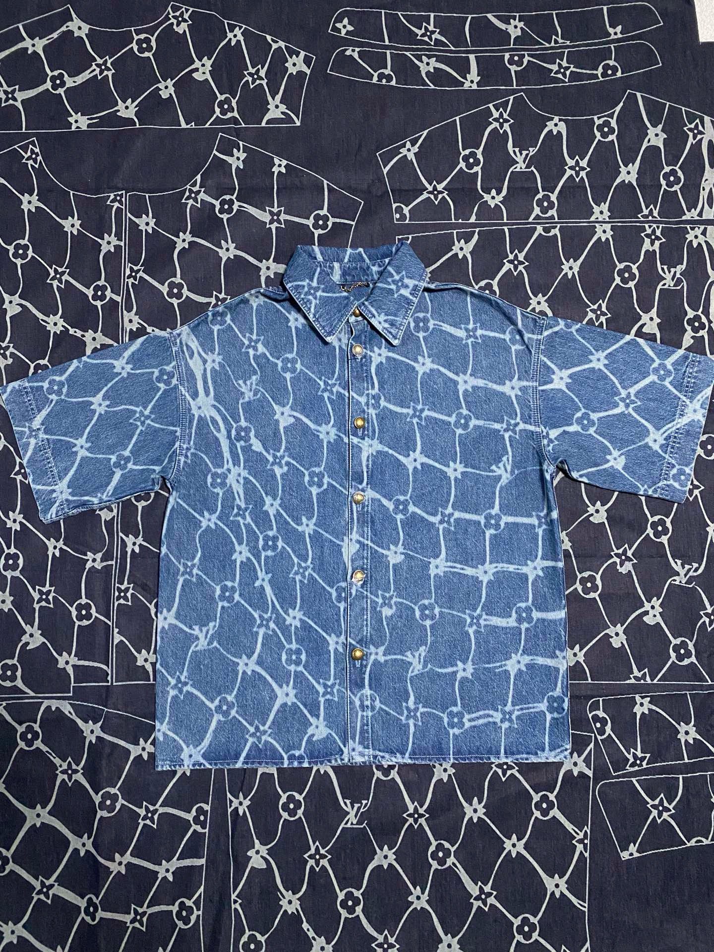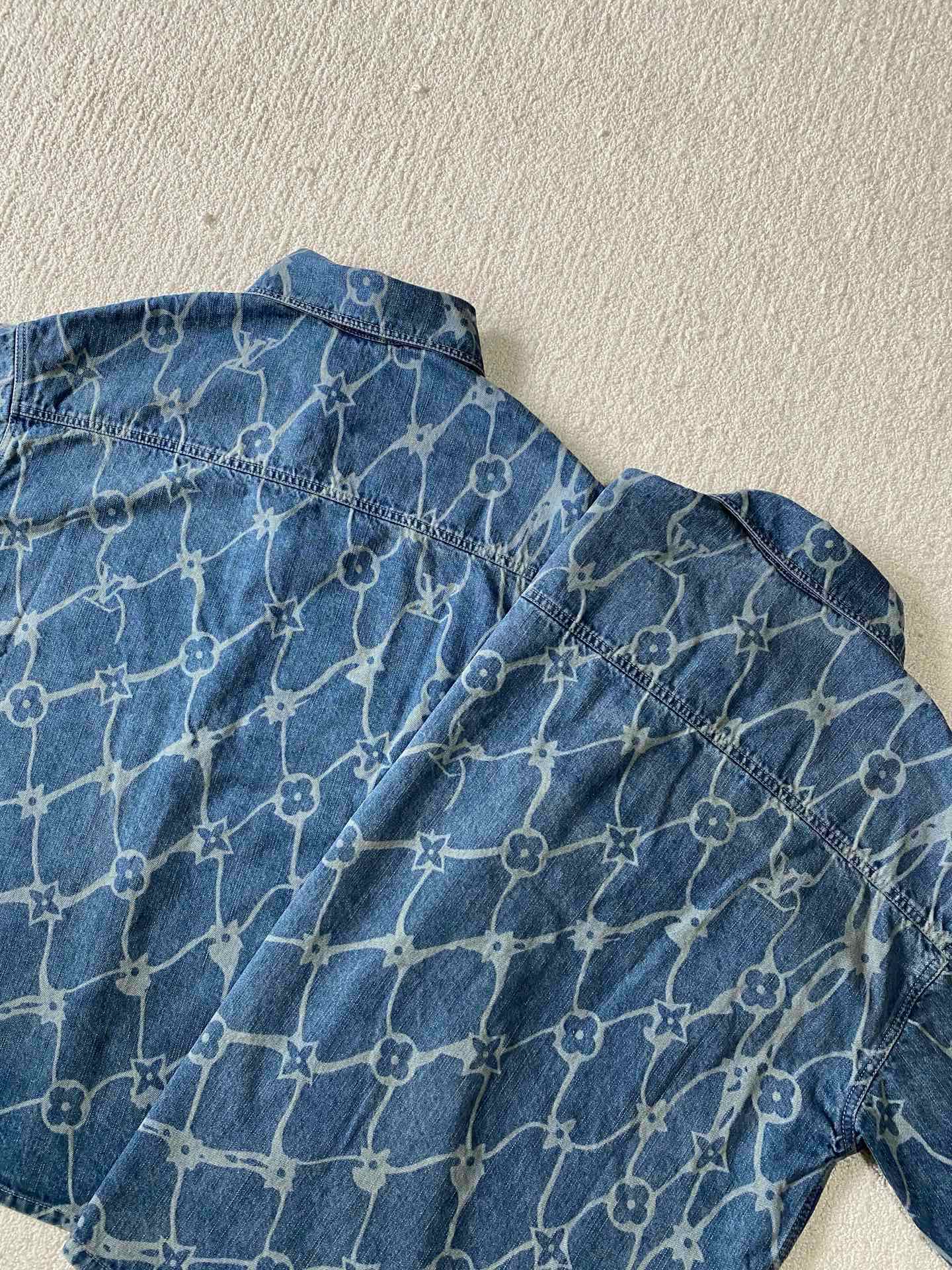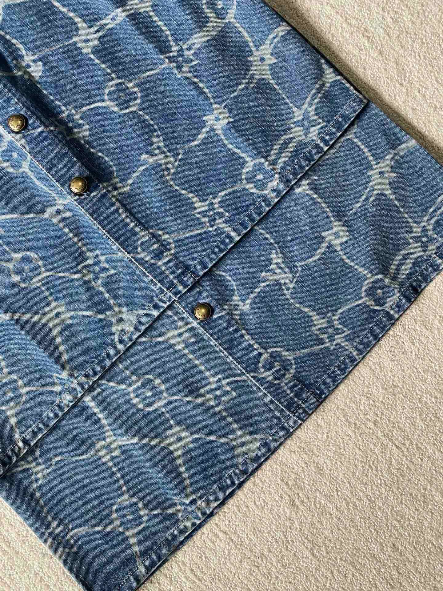 NIGO Louis Vuitton Men's Summer Blue Logo Printed Lapel Single Breasted Denim Short Sleeve Shirt Zipper Straight Jeans Shorts Set Suit #nigo99785