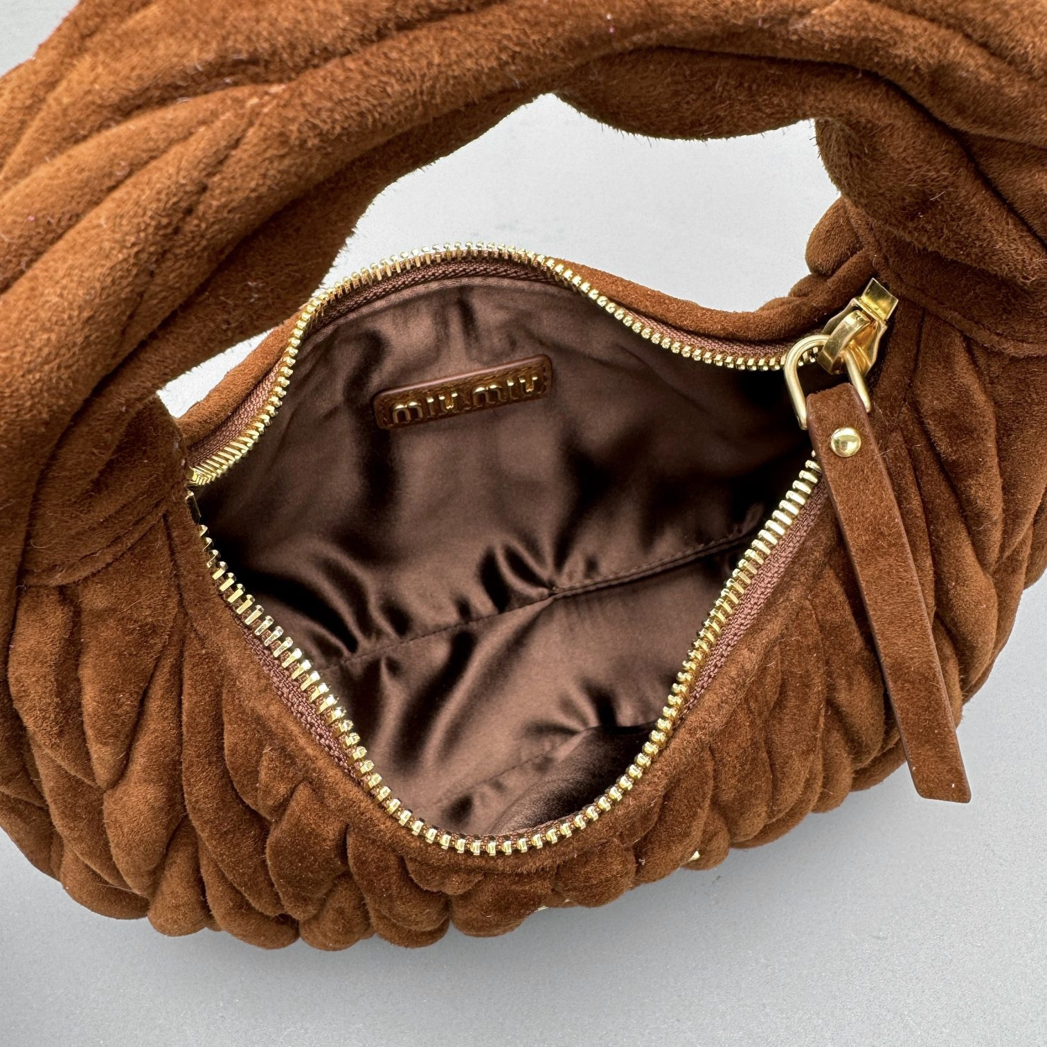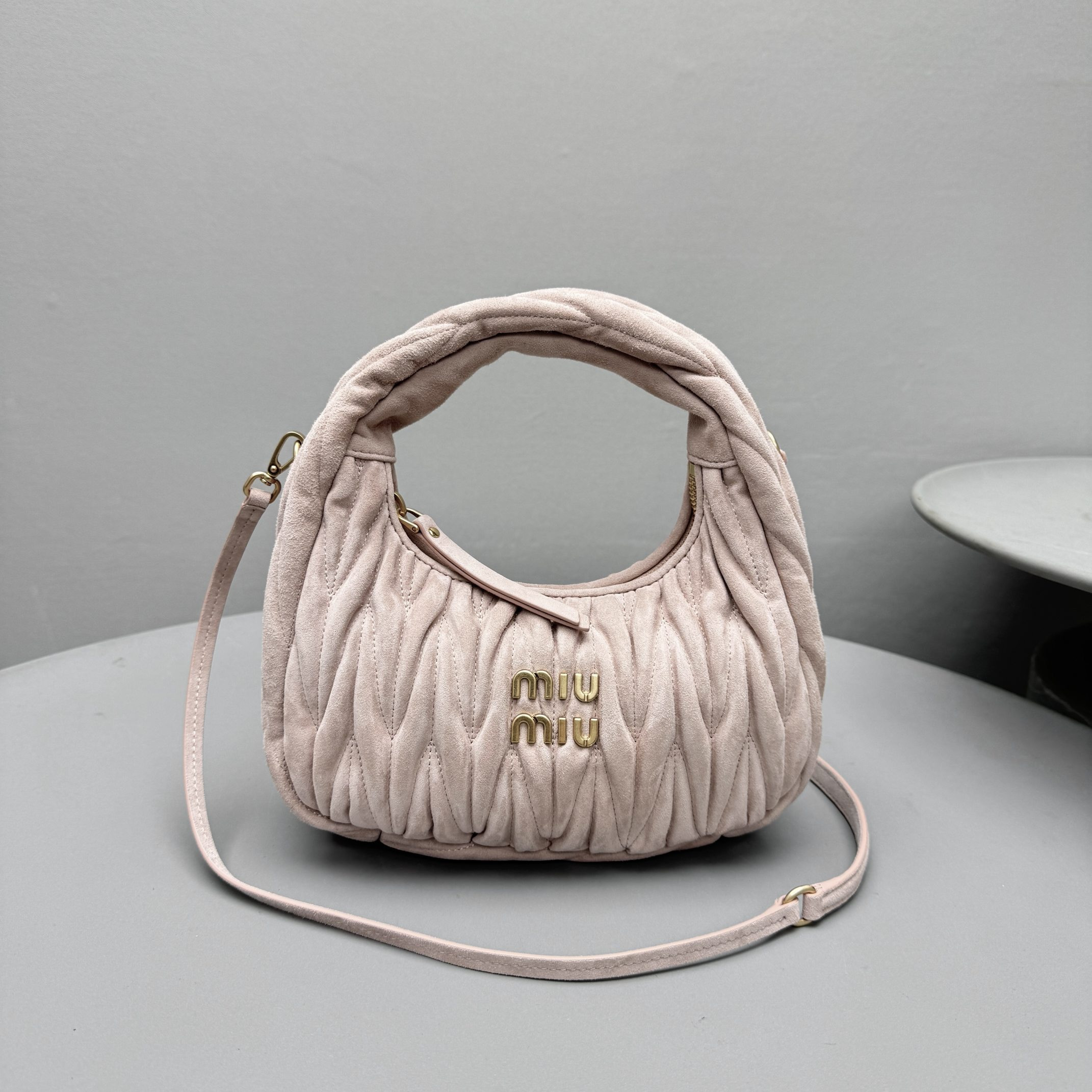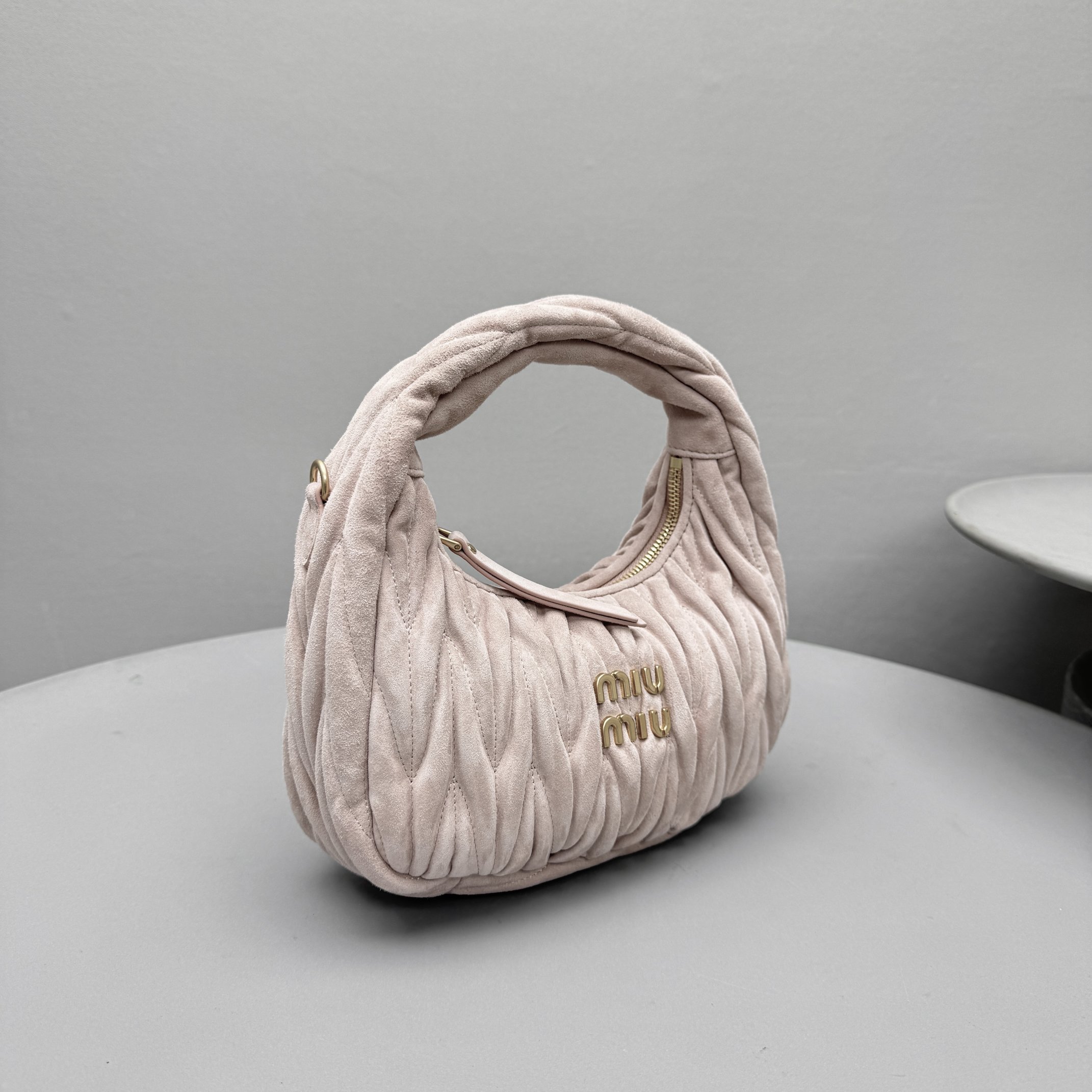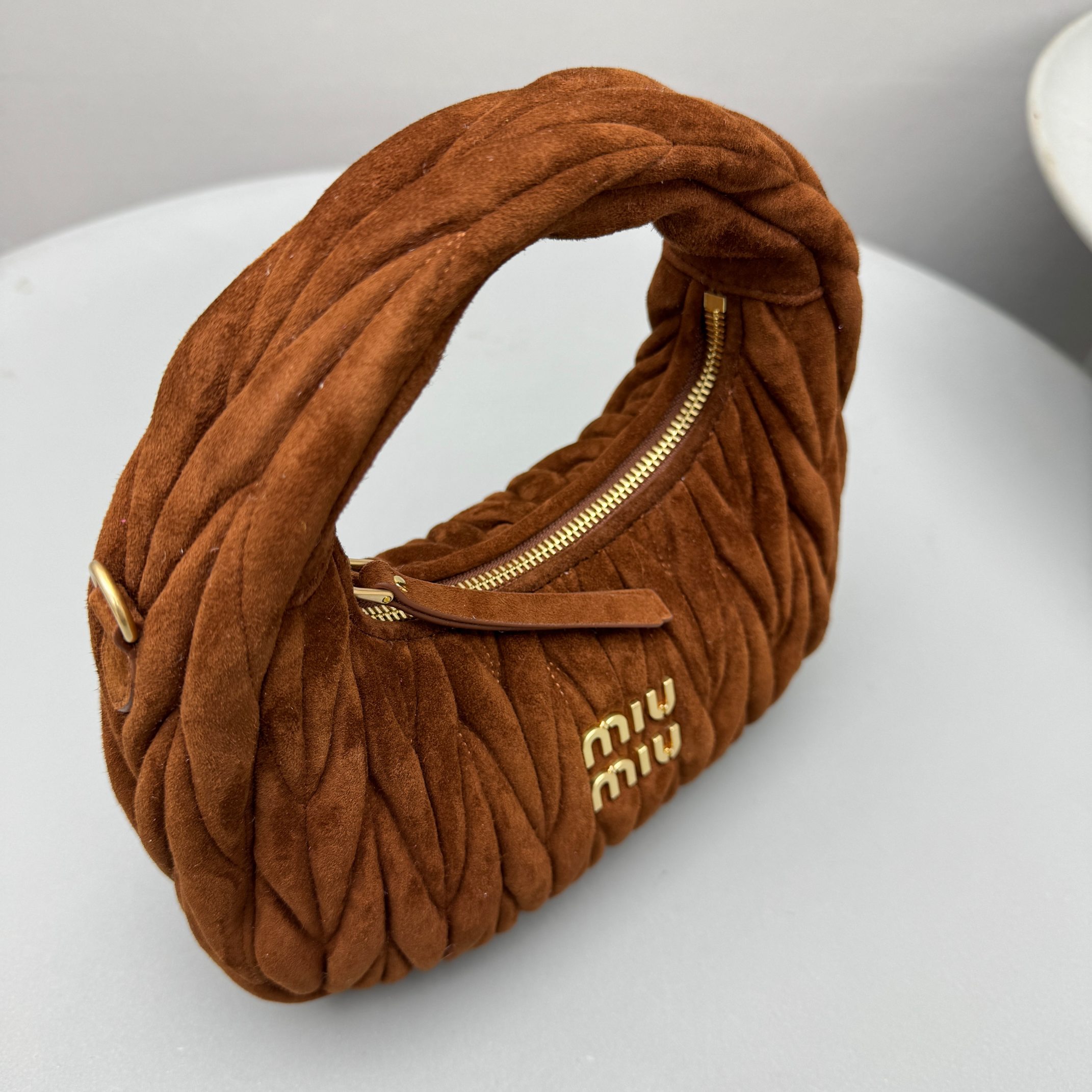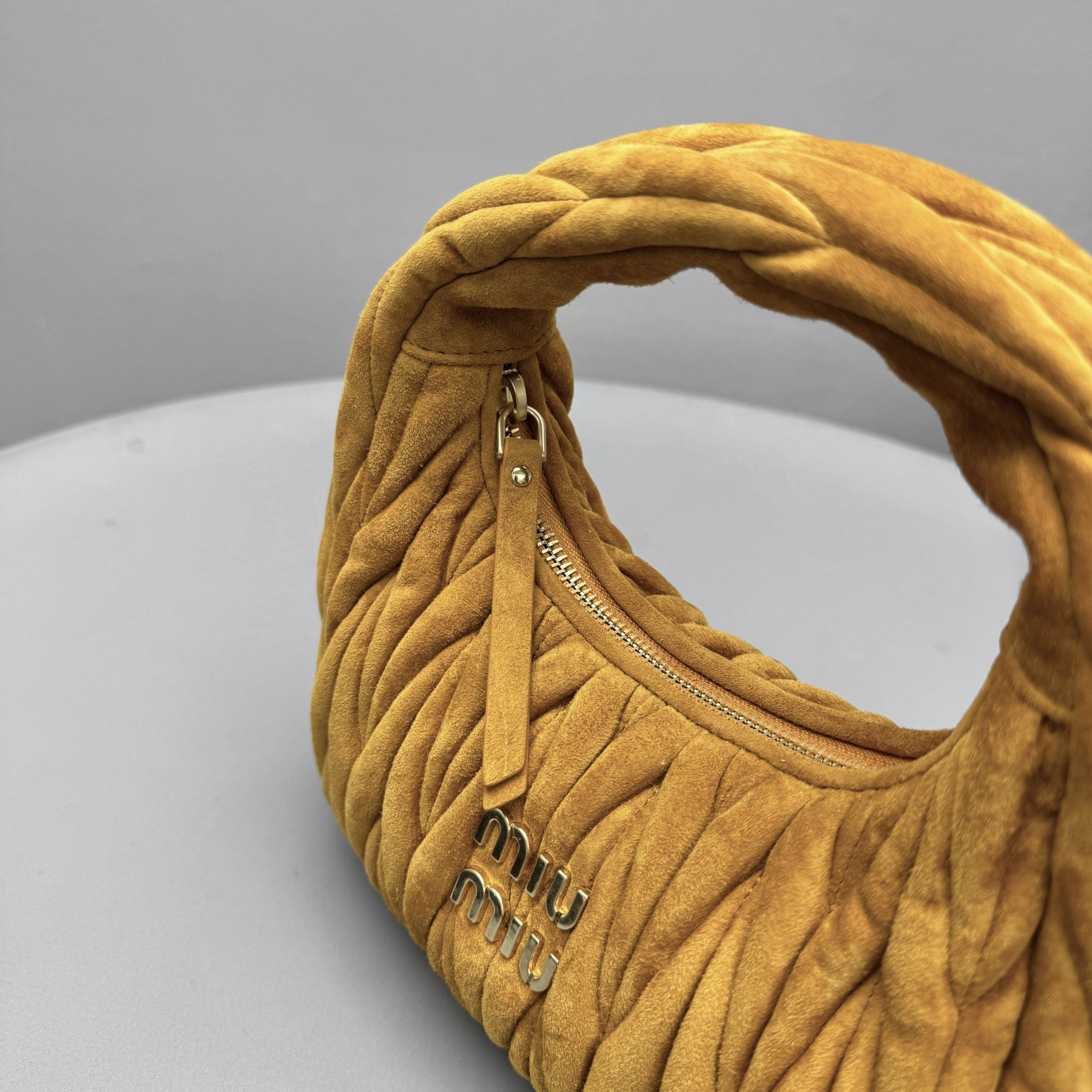 MiuMiu Wander Matelassé Suede Leather Bag Women's Metal Engraving Zipper Closure Single Shoulder Crossbody Crescent Bag Tote Bag #nigo333006