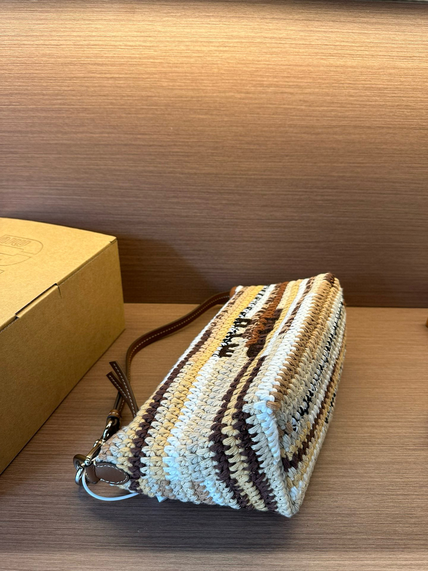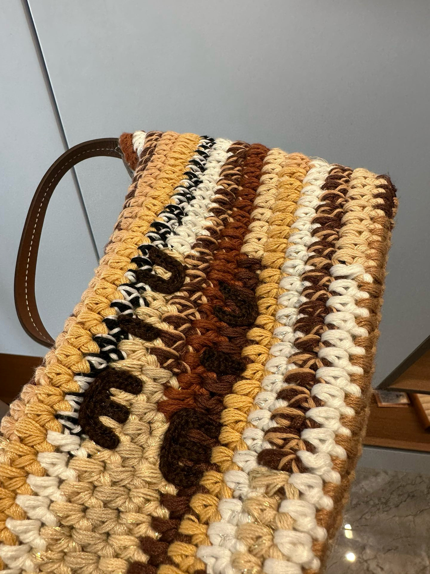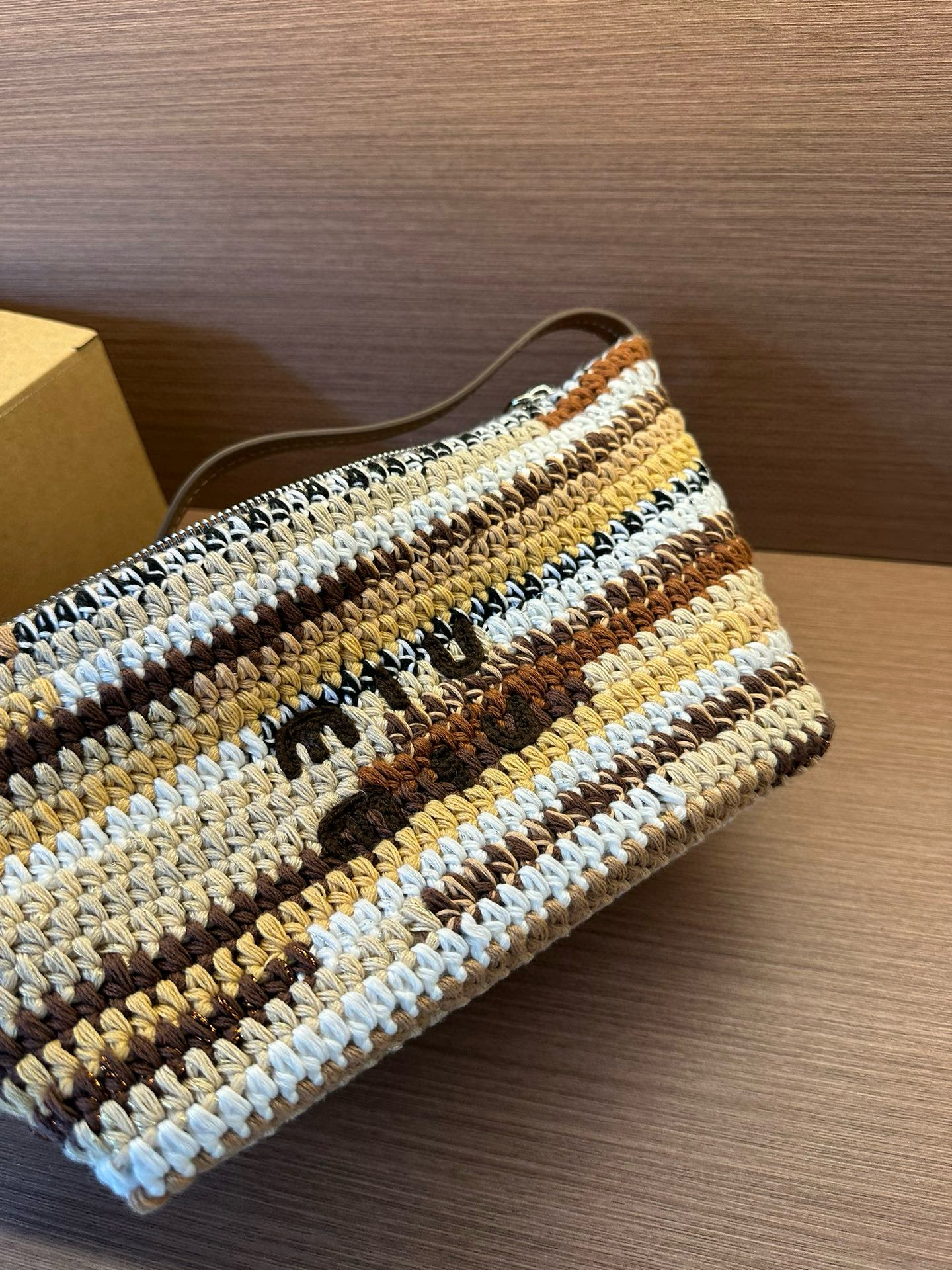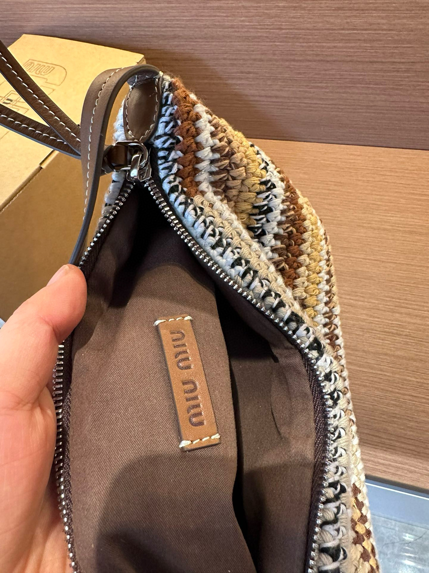 NIGO MiuMiu Ladies Brown Embroidered Engraved Logo Crochet Leather Handle Shoulder Underarm Tote Bag Bags #nigo97874