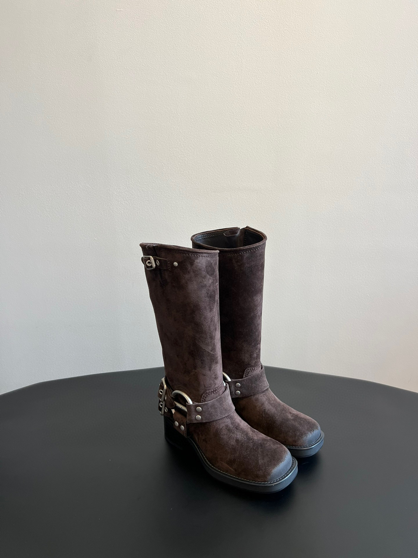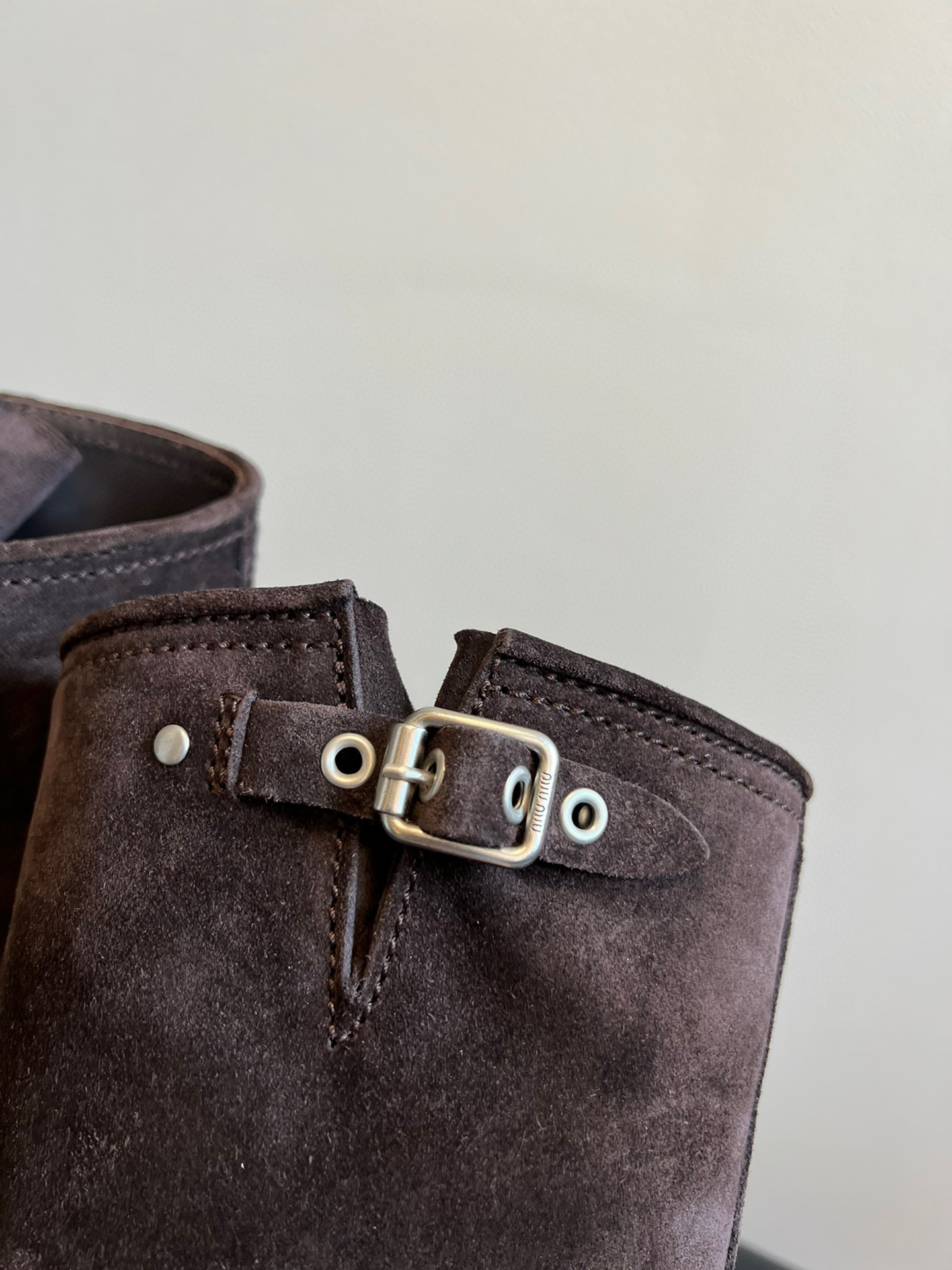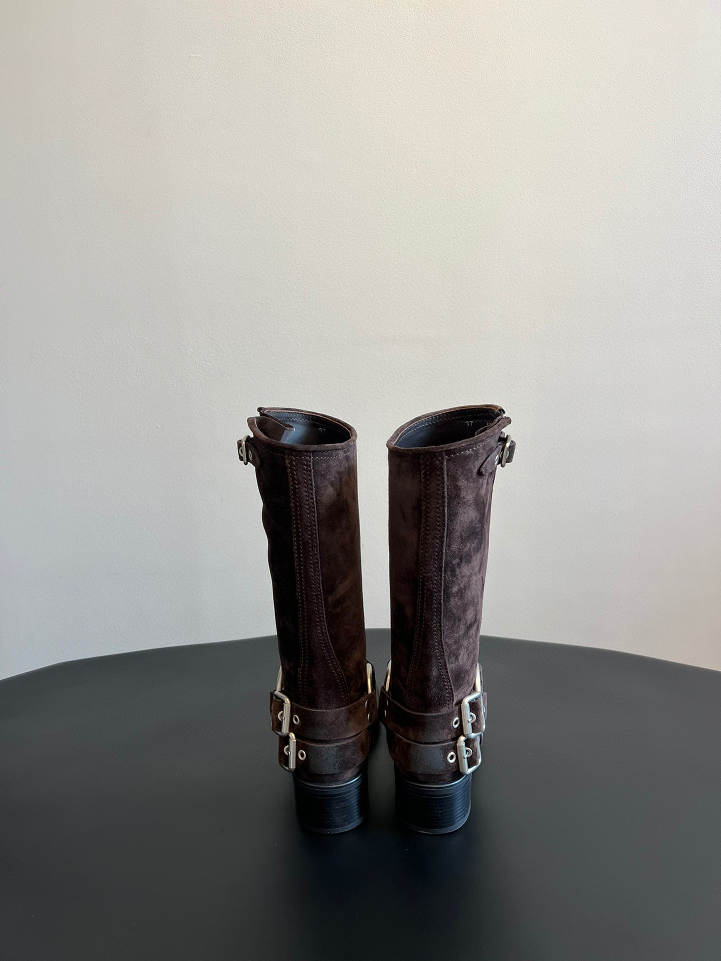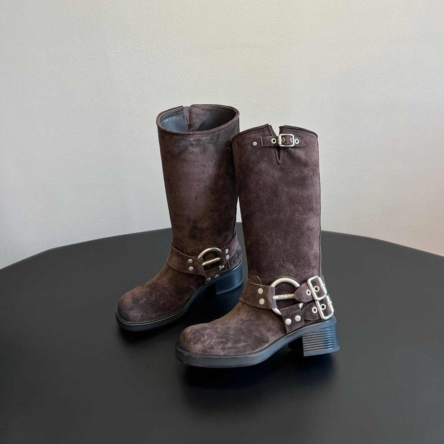 NIGO MiuMiu Women's Fall And Winter Two-Tone Cowhide/Suede Two-Buckle Nodel Mid-Calf Boots Shoes #nigo97265